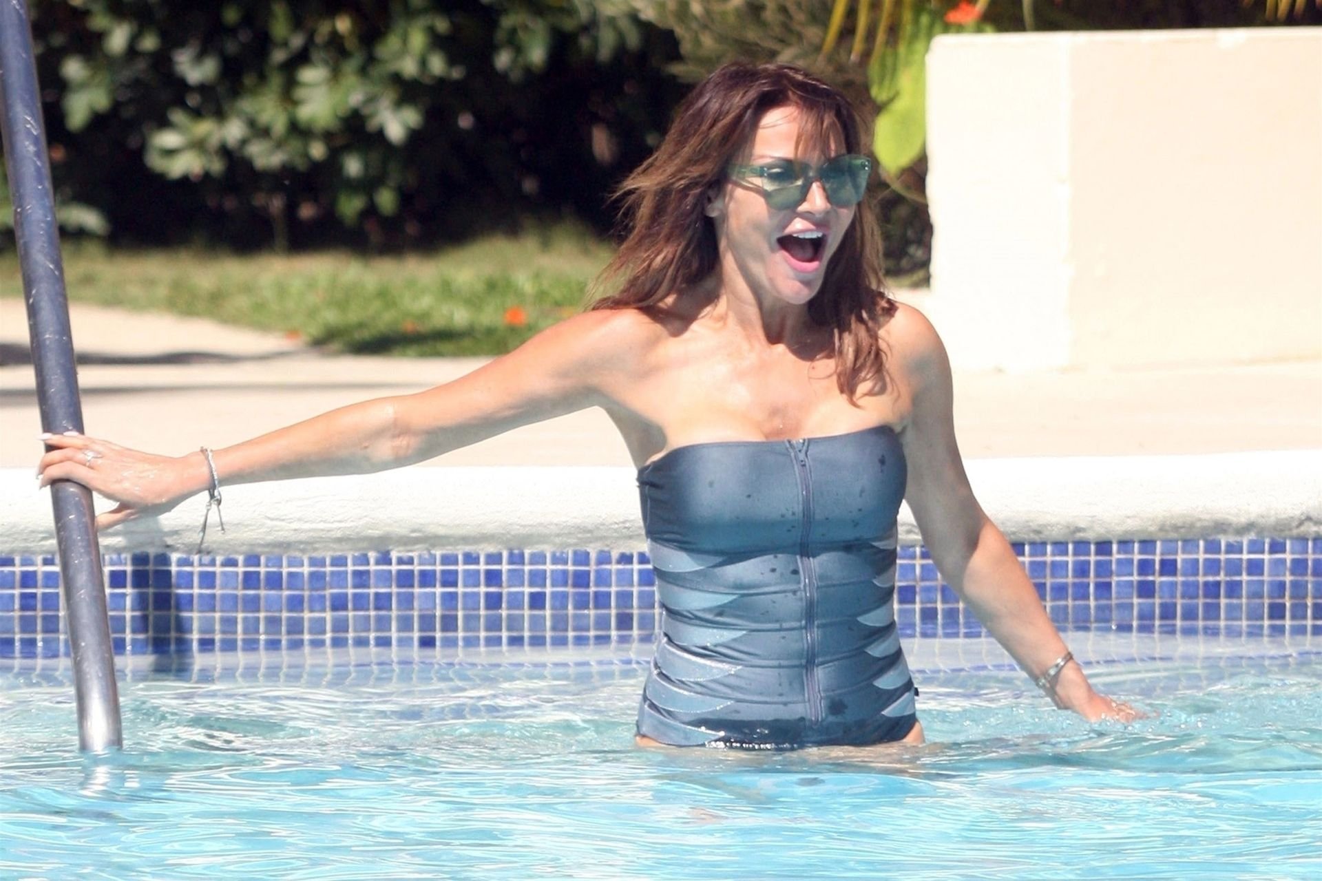 Apresentadora de TV britânica Lizzie Cundy, 49, exibe sua figura esbelta posando para fotos enquanto usa um maiô prateado e aproveita um mergulho na piscina durante as férias em Barbados, 01/02/2019.