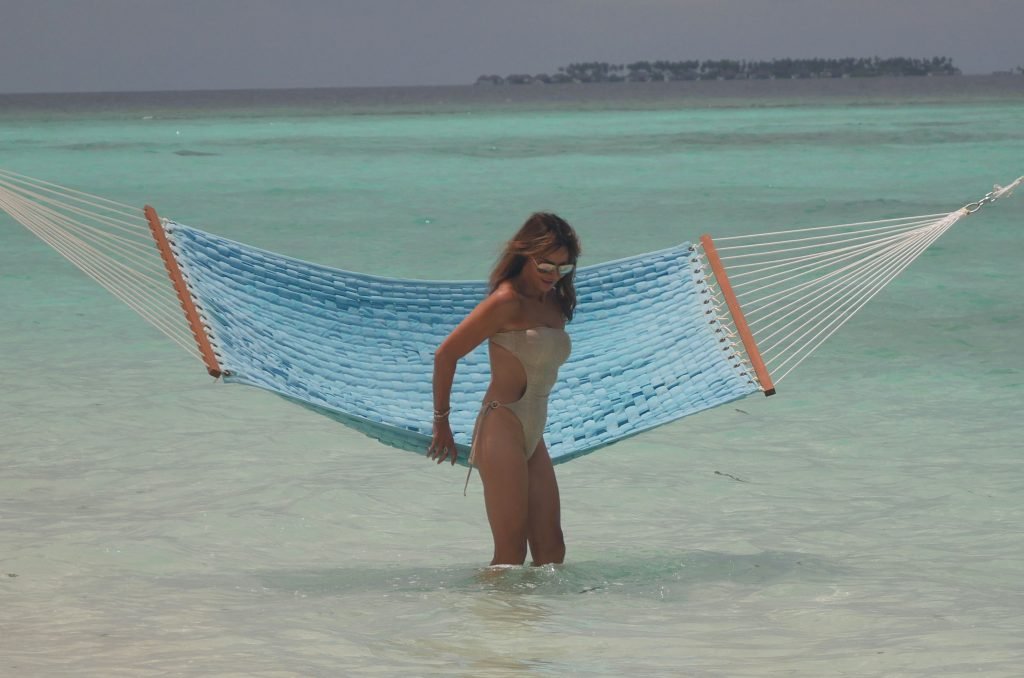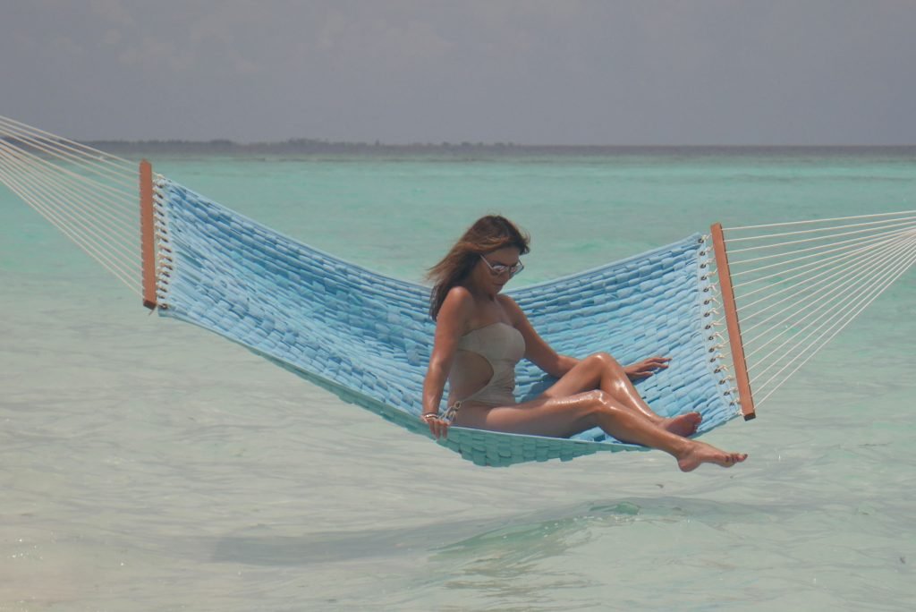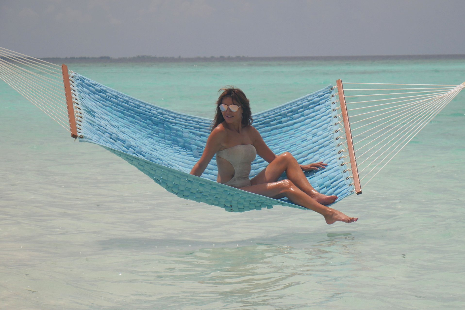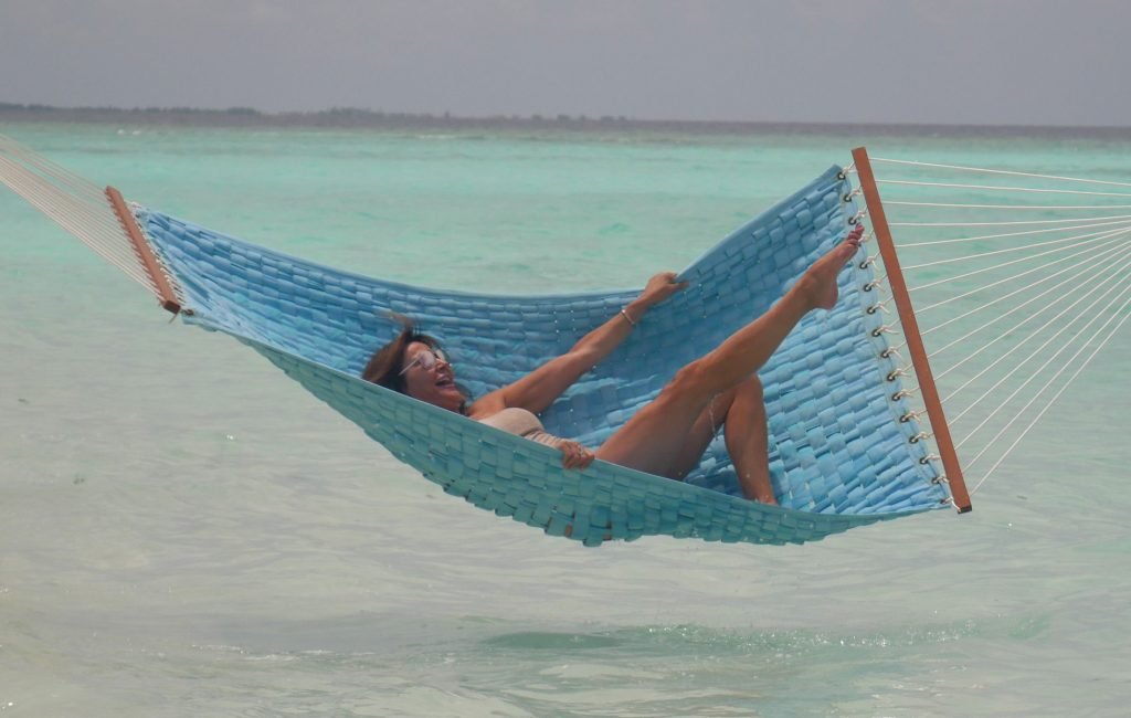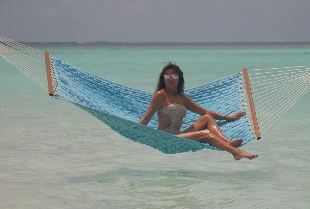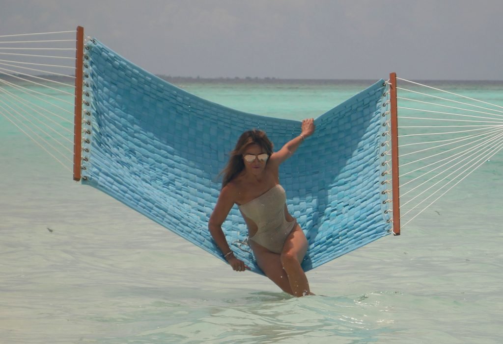 Lizzie Cundy (48) apresenta o Festival Internacional de Cinema no Sun Siyam Iru Fushi, Maldivas. Ela consegue um pouco de tempo para relaxar em uma rede sobre o mar, 08/09/2018.