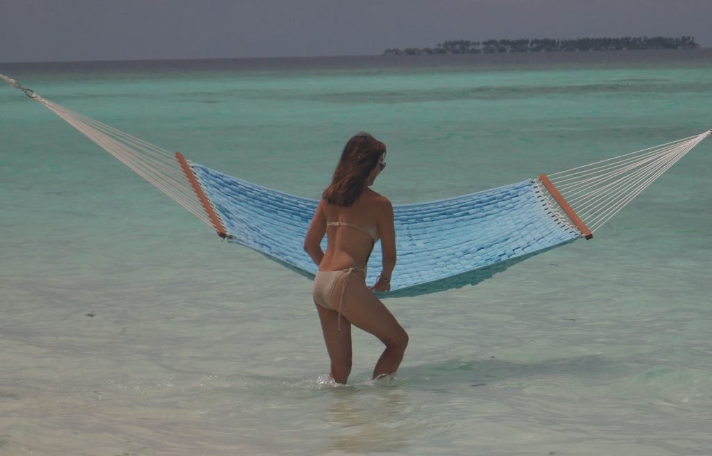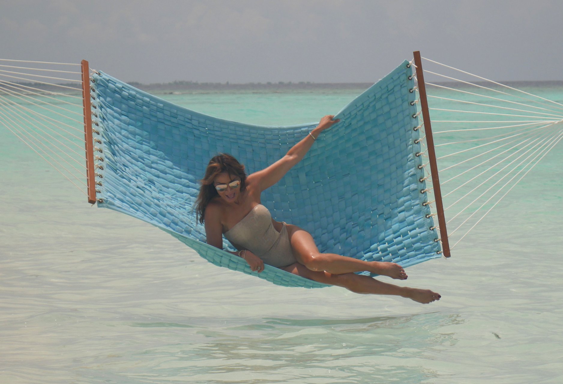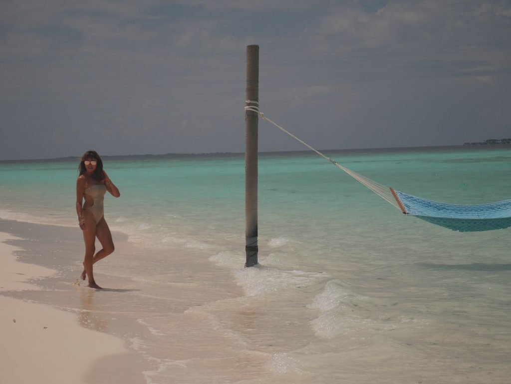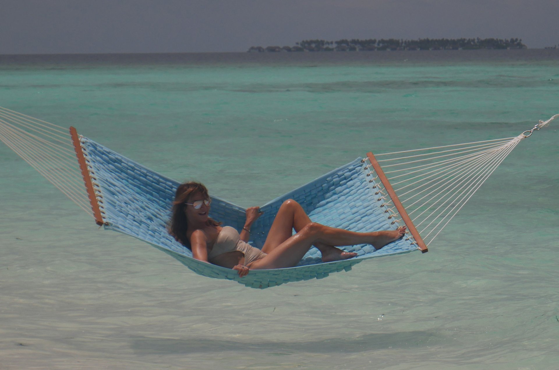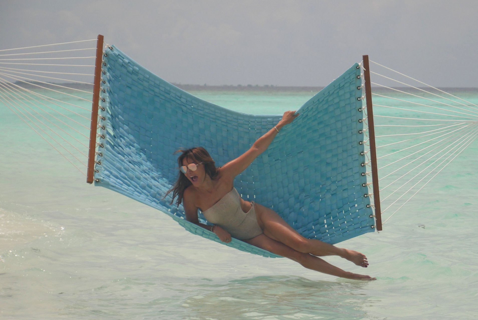 Lizzie Cundy (48) apresenta o Festival Internacional de Cinema no Sun Siyam Iru Fushi, Maldivas. Ela consegue um pouco de tempo para relaxar em uma rede sobre o mar, 08/09/2018.