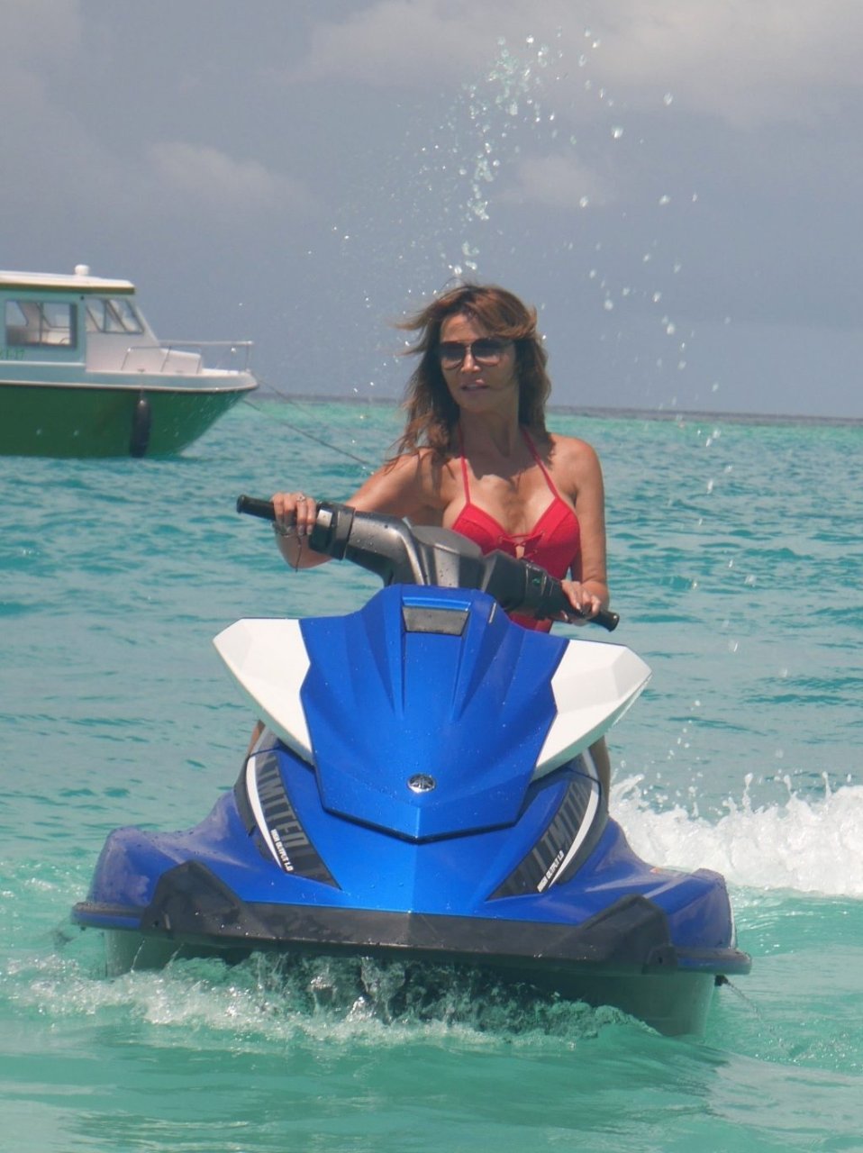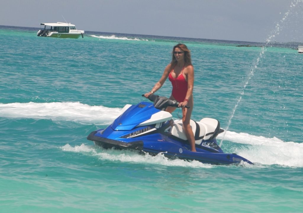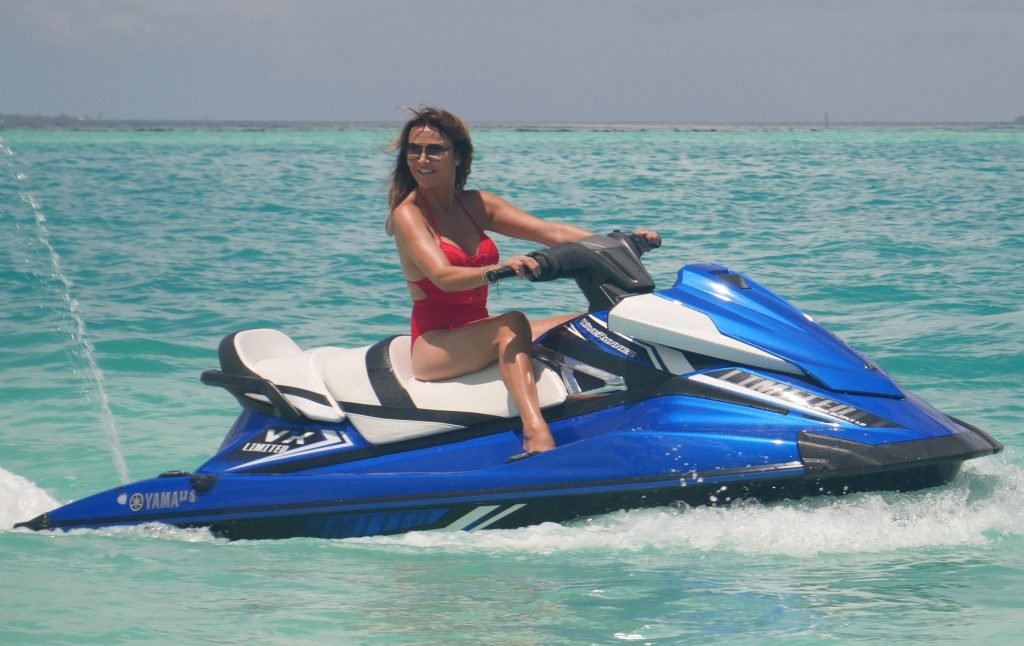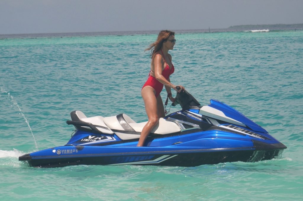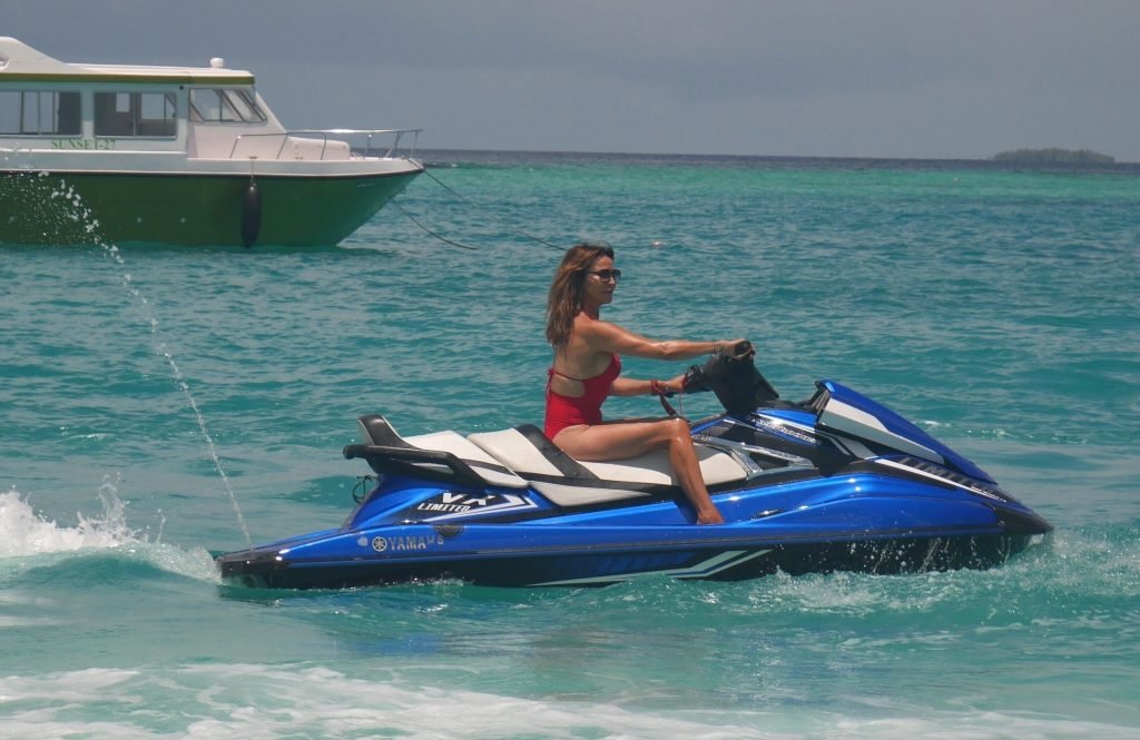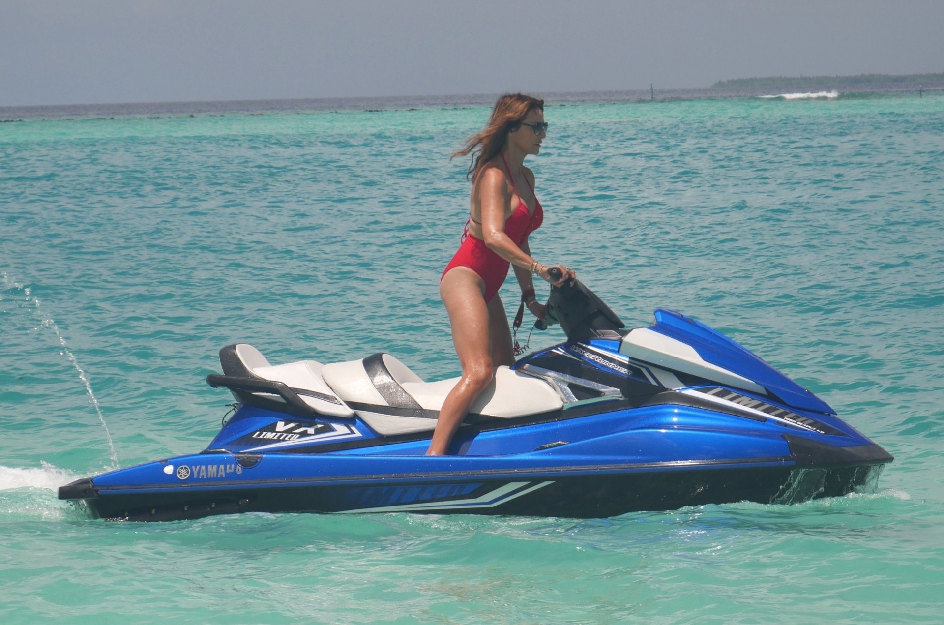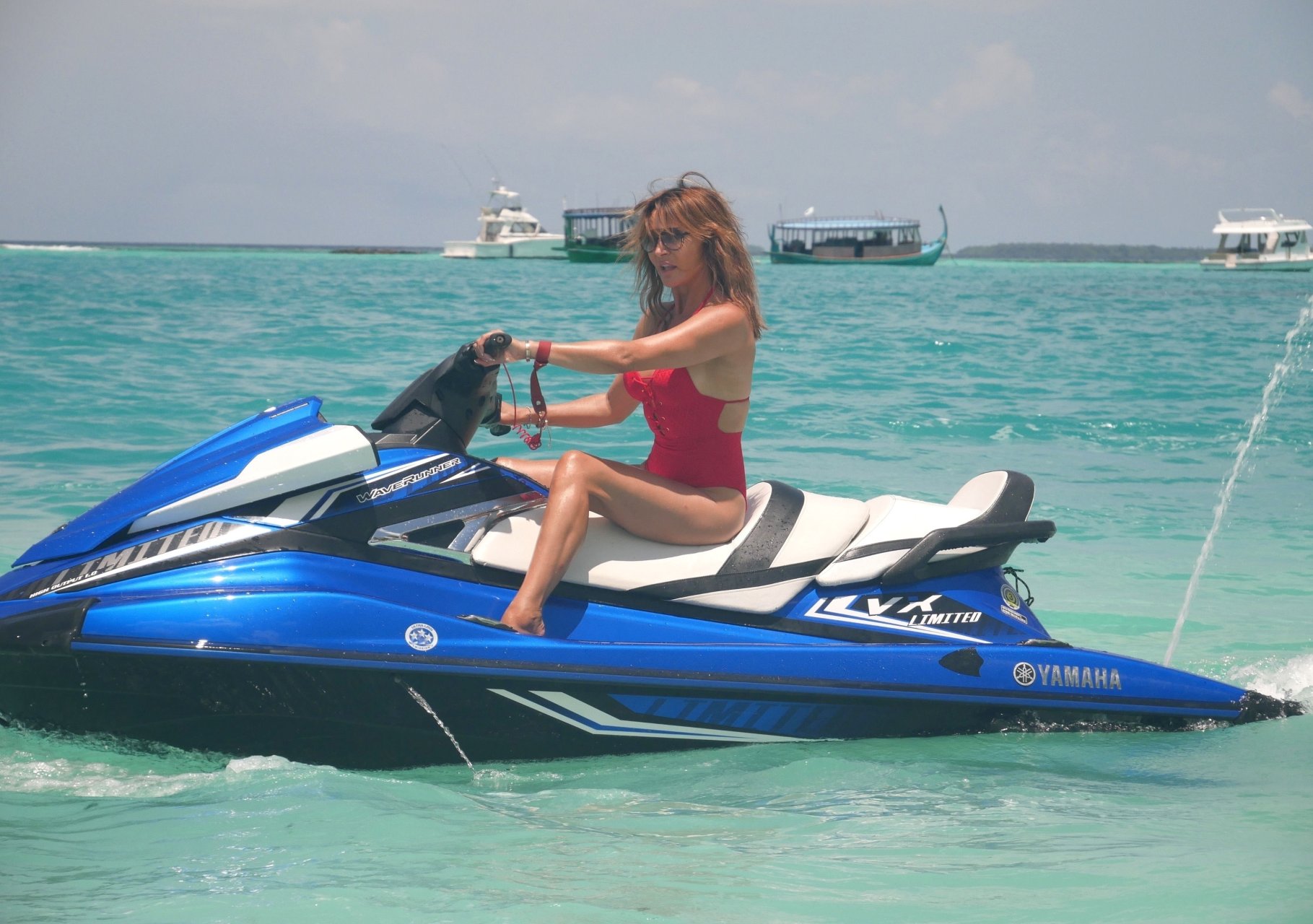 Lizzie Cundy foi vista no Sun Siyam Iru Fushi Resort nas Maldivas, 10/09/2018. Ela conseguiu um pouco de tempo para relaxar à beira da piscina e se divertir um pouco em um jetski.