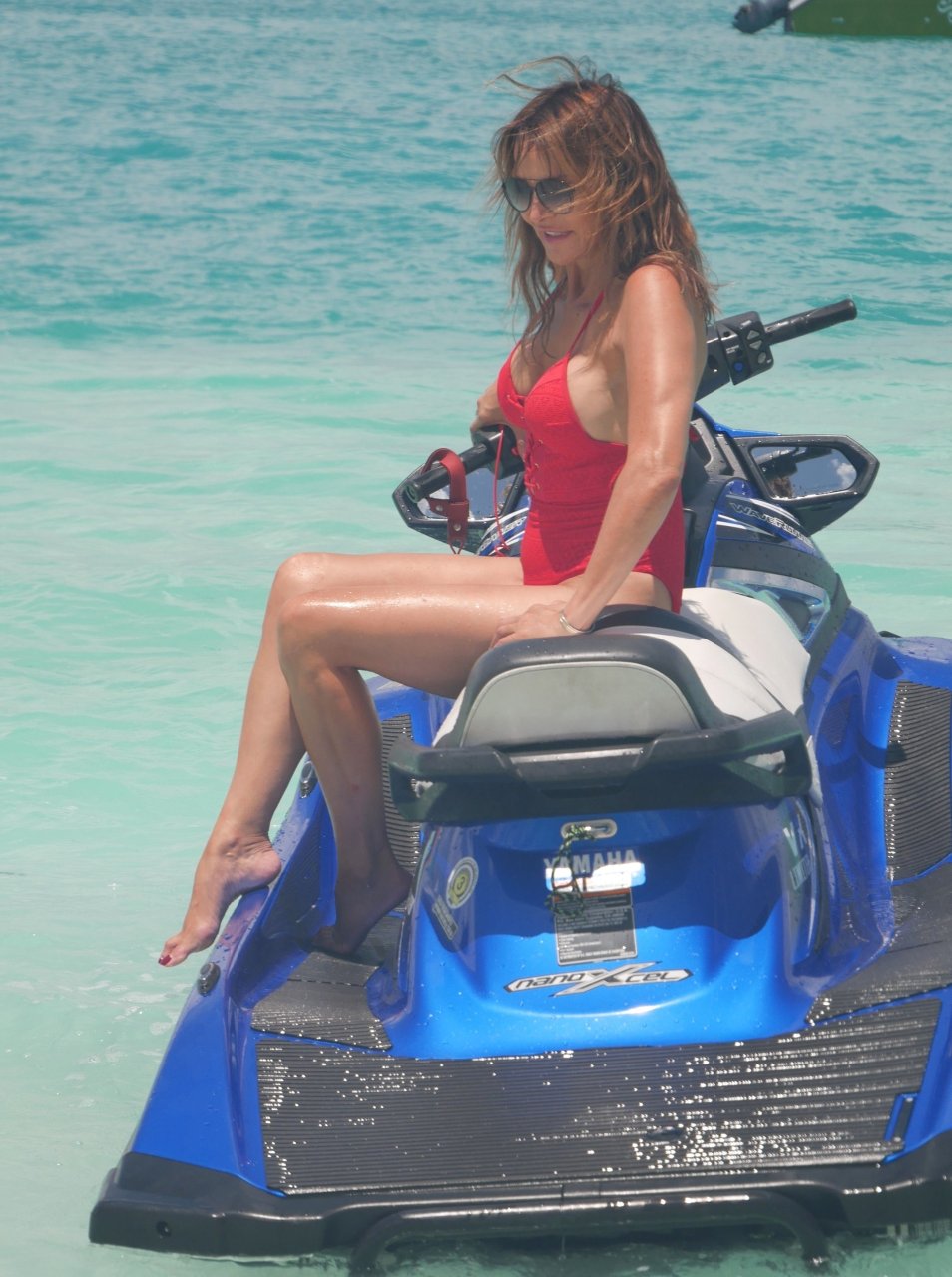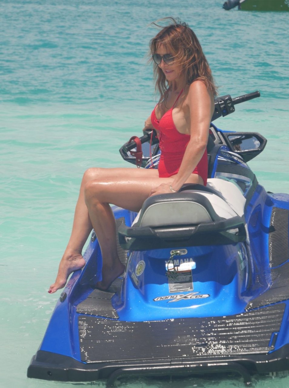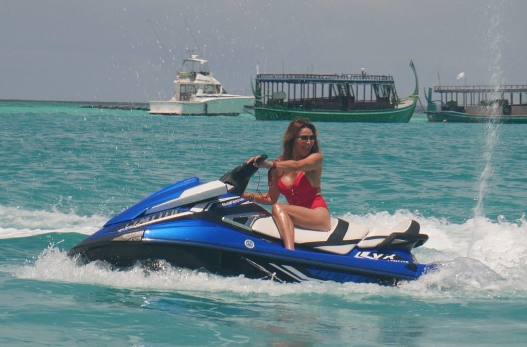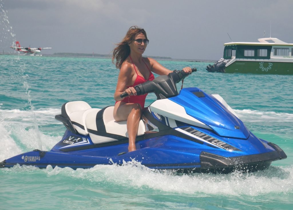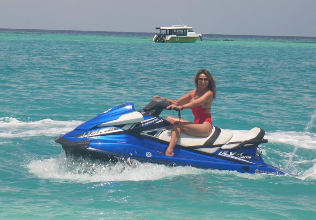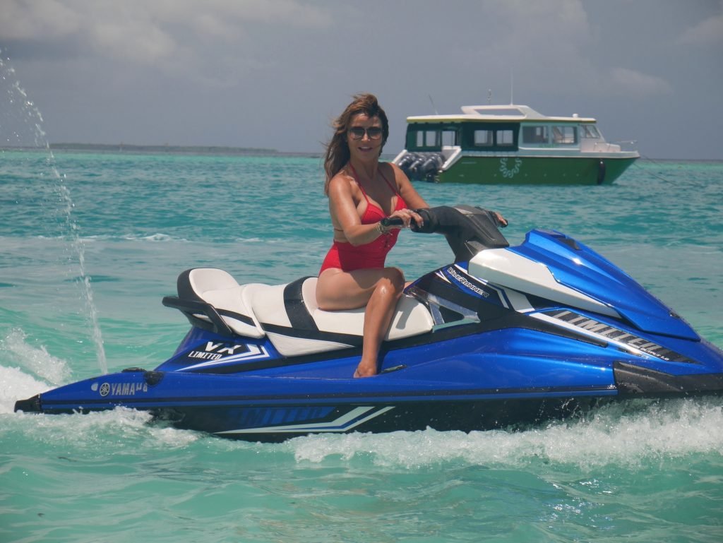 Lizzie Cundy foi vista no Sun Siyam Iru Fushi Resort nas Maldivas, 10/09/2018. Ela conseguiu um pouco de tempo para relaxar à beira da piscina e se divertir um pouco em um jetski.