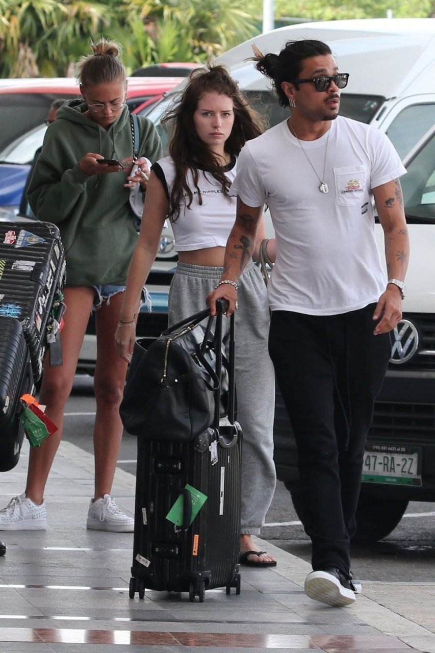 Lottie Moss e a amiga Ella Ross foram vistas partindo em um voo no aeroporto de Cancun, México, em 15/01/2019. Lottie, que estava comemorando seu 21º aniversário (9 de janeiro) no fim de semana, manteve seu traje de viagem casual com uma camiseta branca e calças de moletom cinza. A camiseta de Lottie dizia “Meus mamilos te ofendem?”.