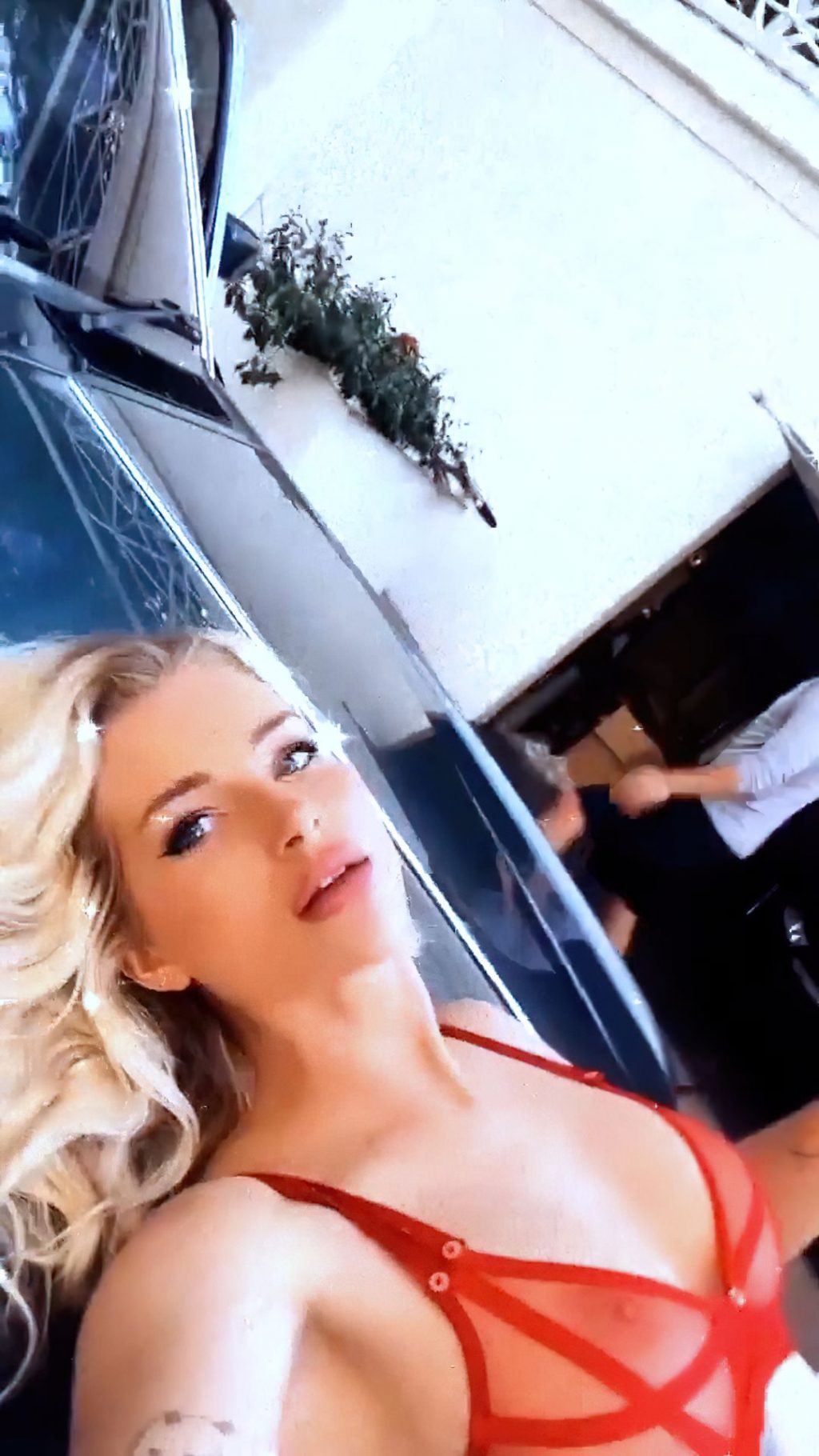 Model Lottie Moss mostra seus seios levemente nus enquanto posa sobre um carro com lingerie vermelha de renda em um ensaio recente para @mymomwillneverseethese – Instagram, 13/03/2021.