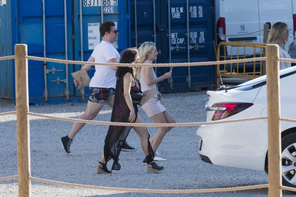 Kate Moss irmã, Lottie Moss é vista se divertindo com alguns amigos em Ibiza, 05/04/2019. A modelo exibe sua silhueta em um vestido rosa claro justo ao corpo e alguns sapatinhos brancos fofos.