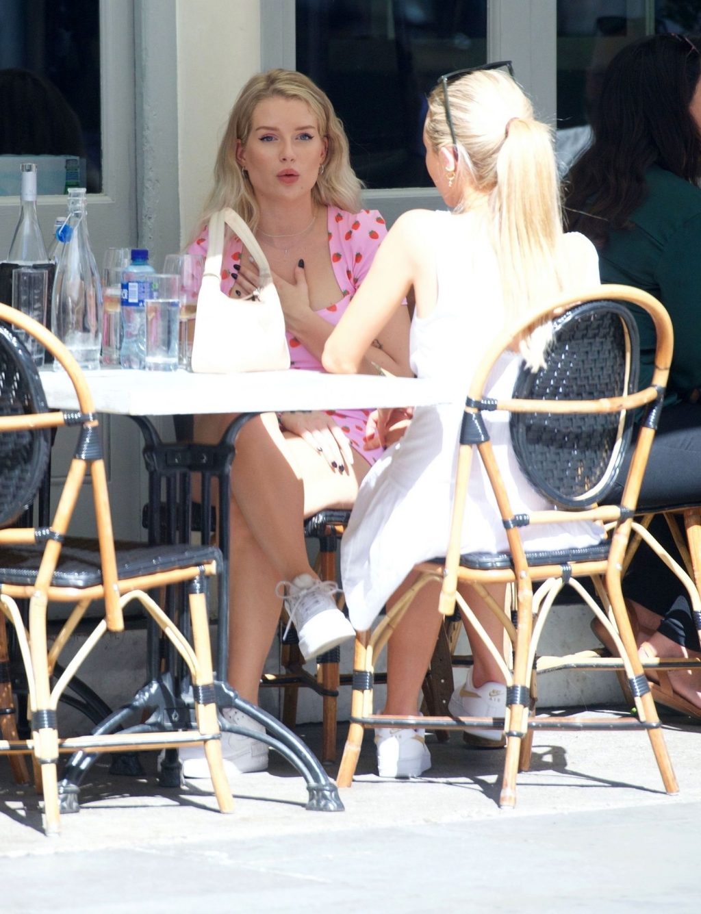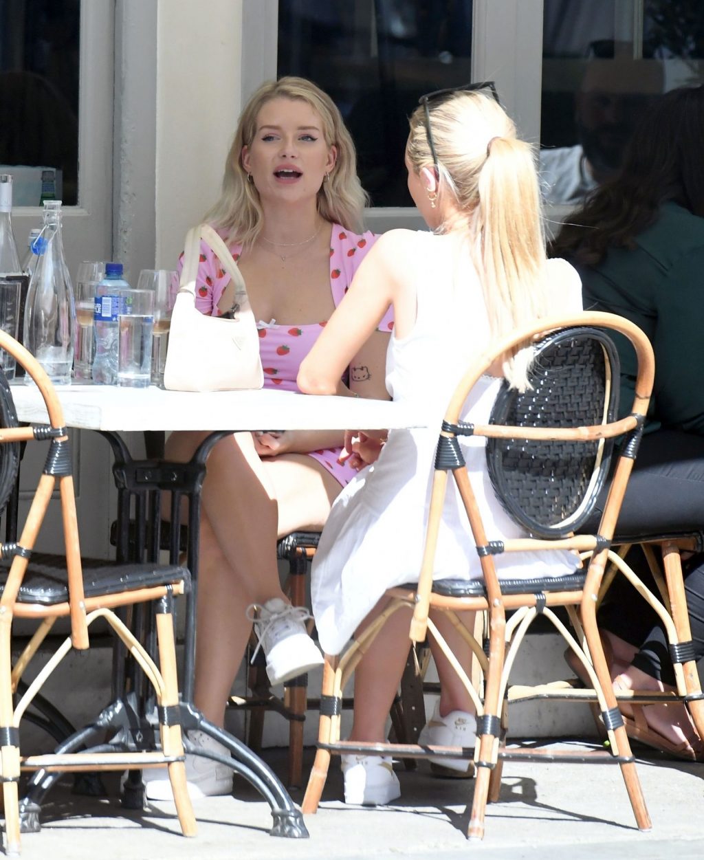 “Linda de Rosa” Lottie Moss exibe sua tatuagem Little Kitty enquanto ela e sua amiga riem durante o almoço!