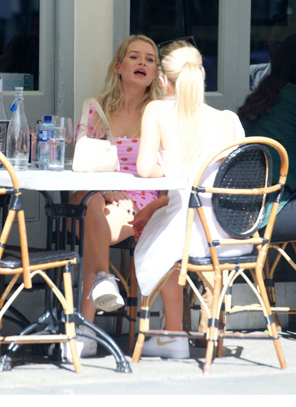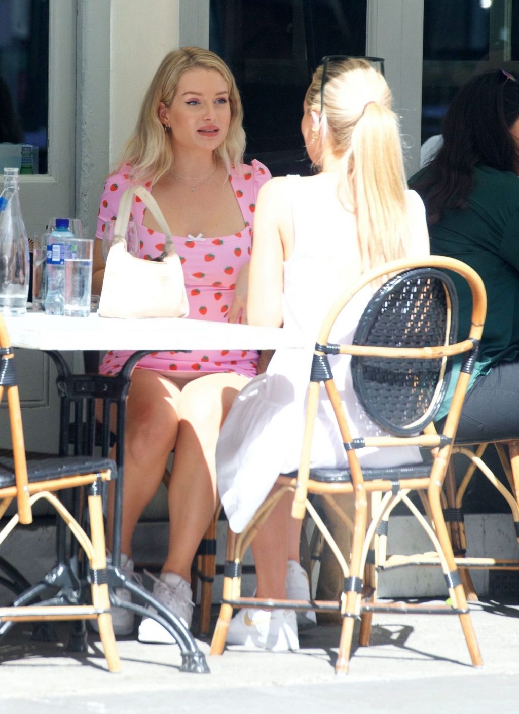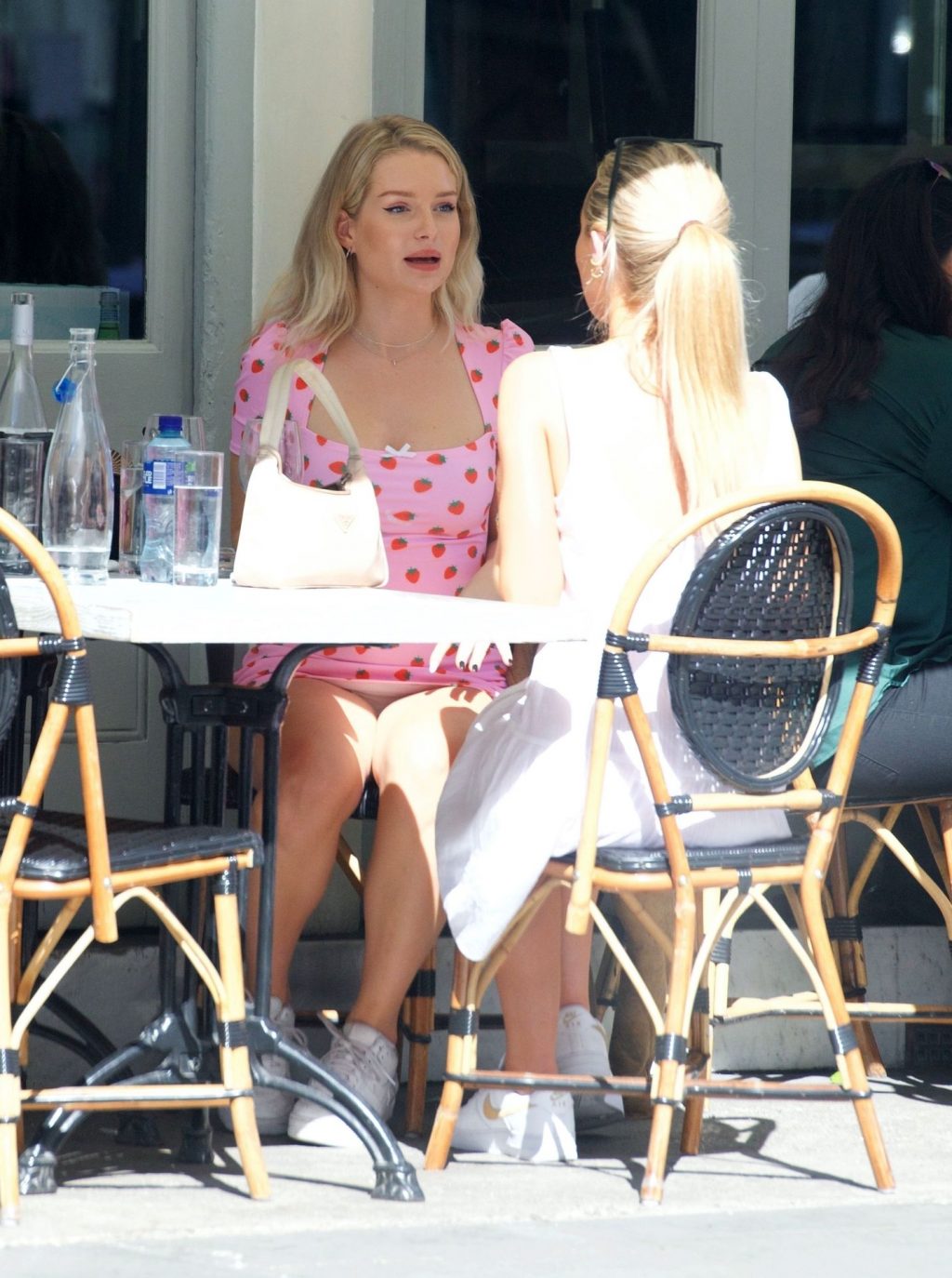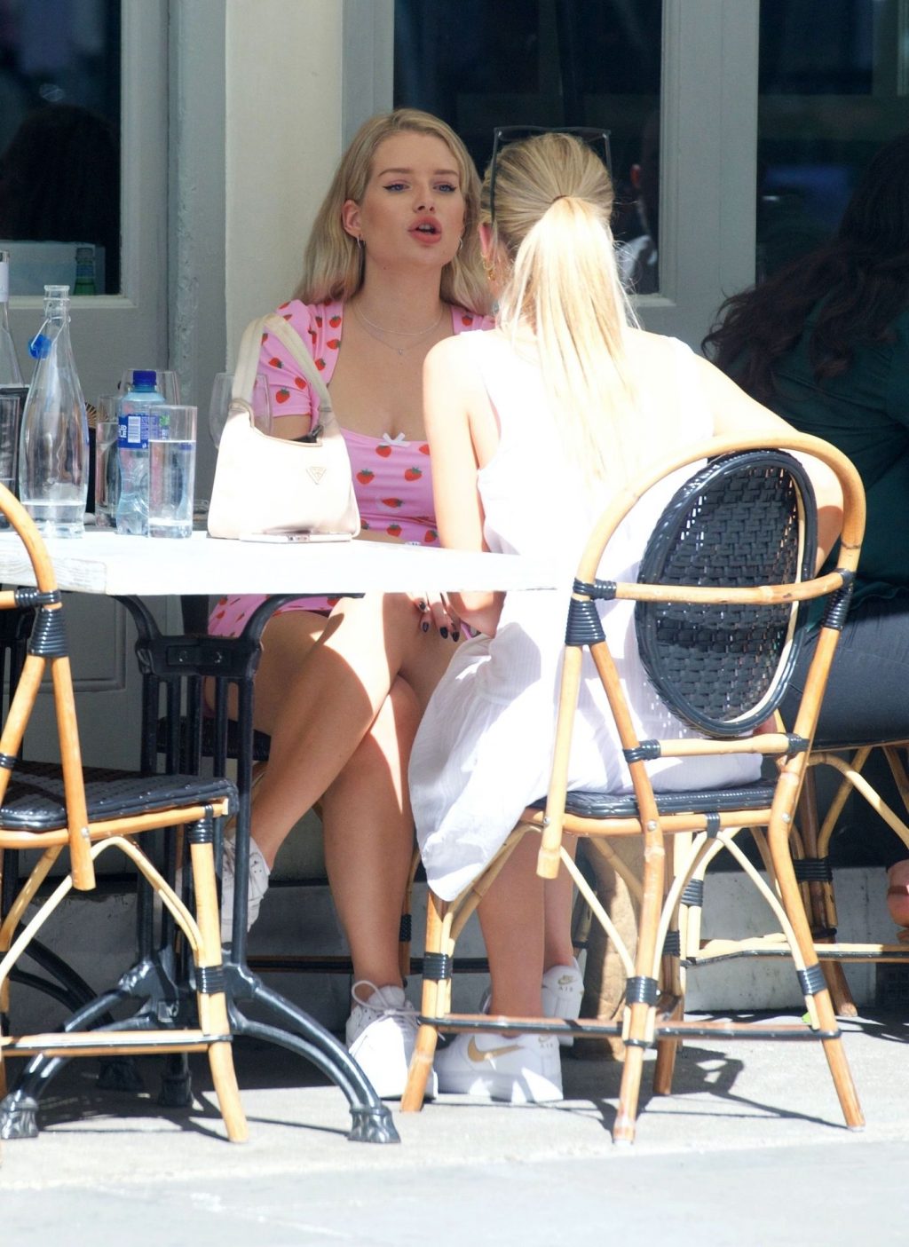 Lottie Moss quase para o trânsito ao usar um vestido muito curto enquanto está sentada à mesa, tendo uma conversa animada com uma amiga. Seu vestido rosa tinha pequenas morangos por toda parte. Sem o tênis de Wimbledon este ano, que deveria ter terminado no último domingo, Lottie ao menos usou seus morangos.