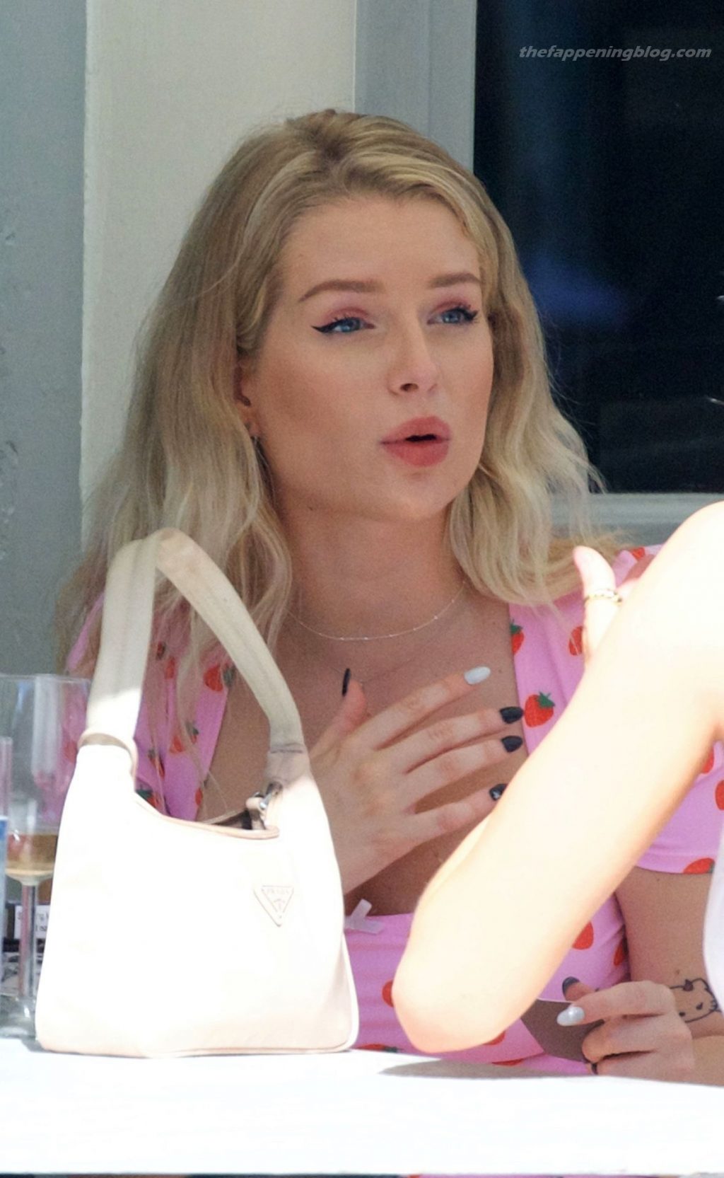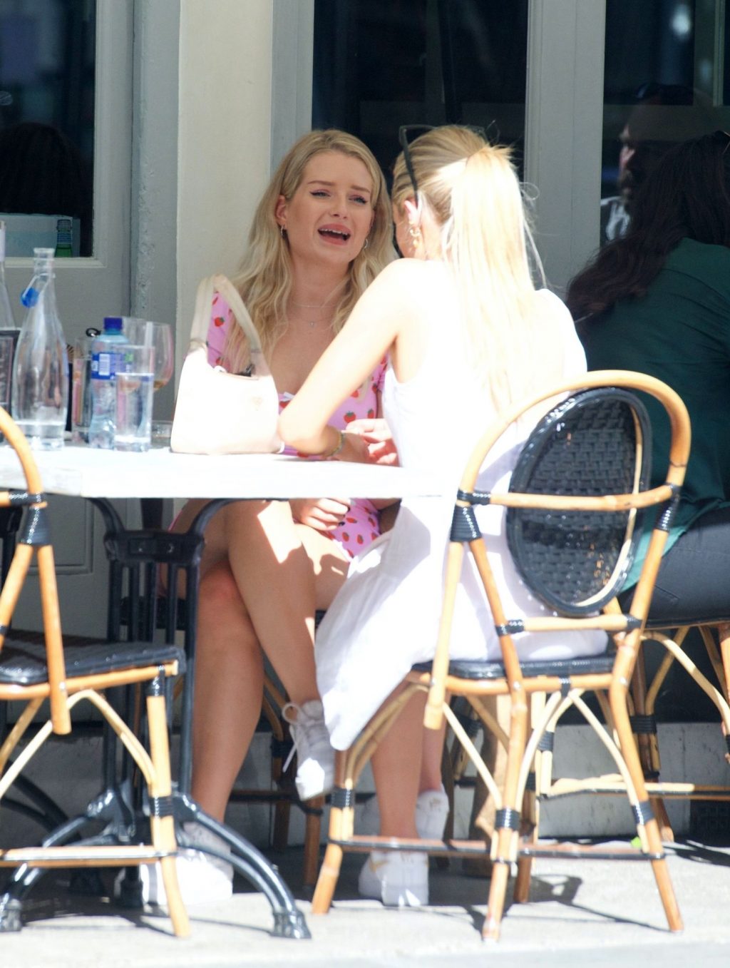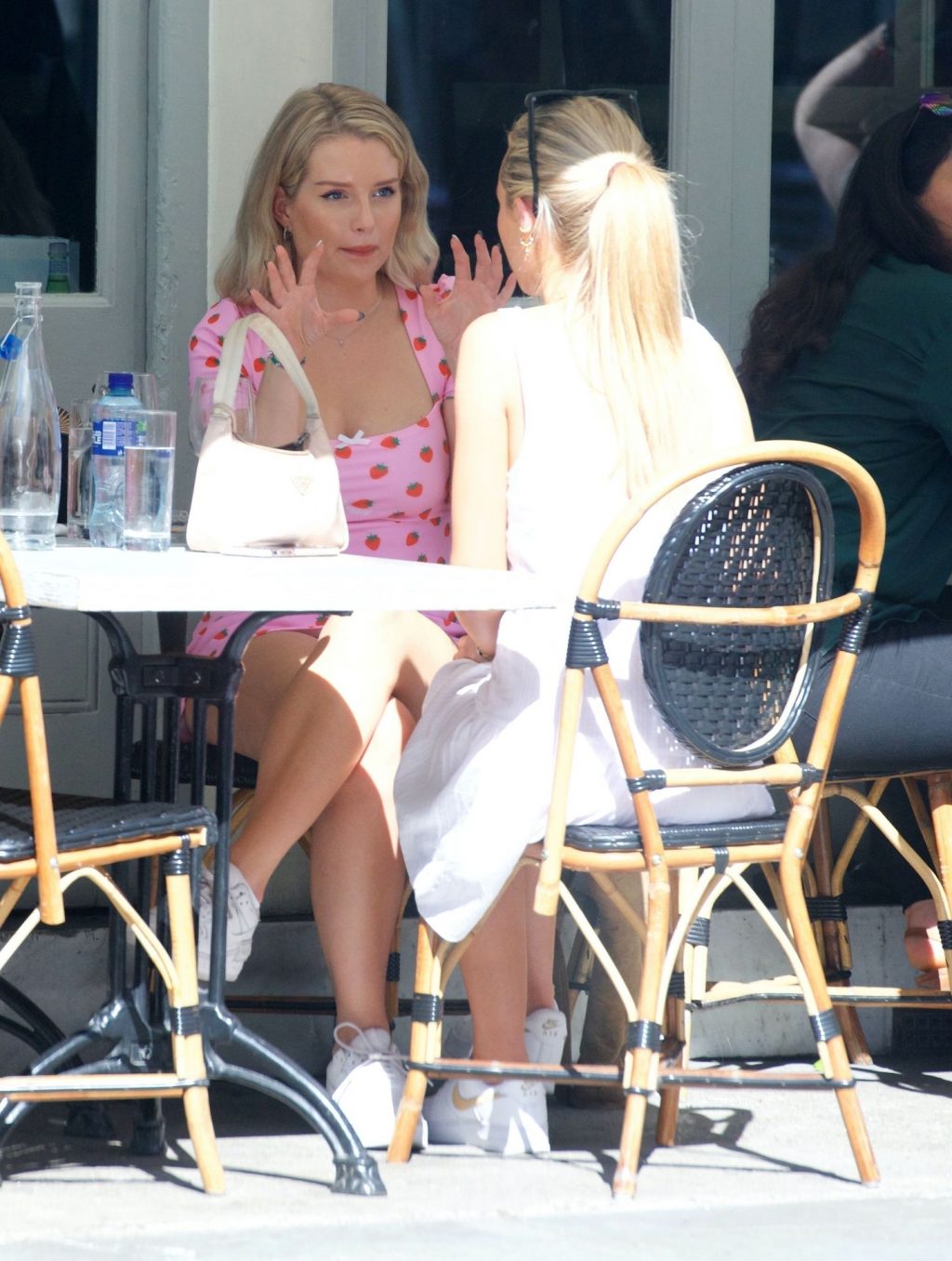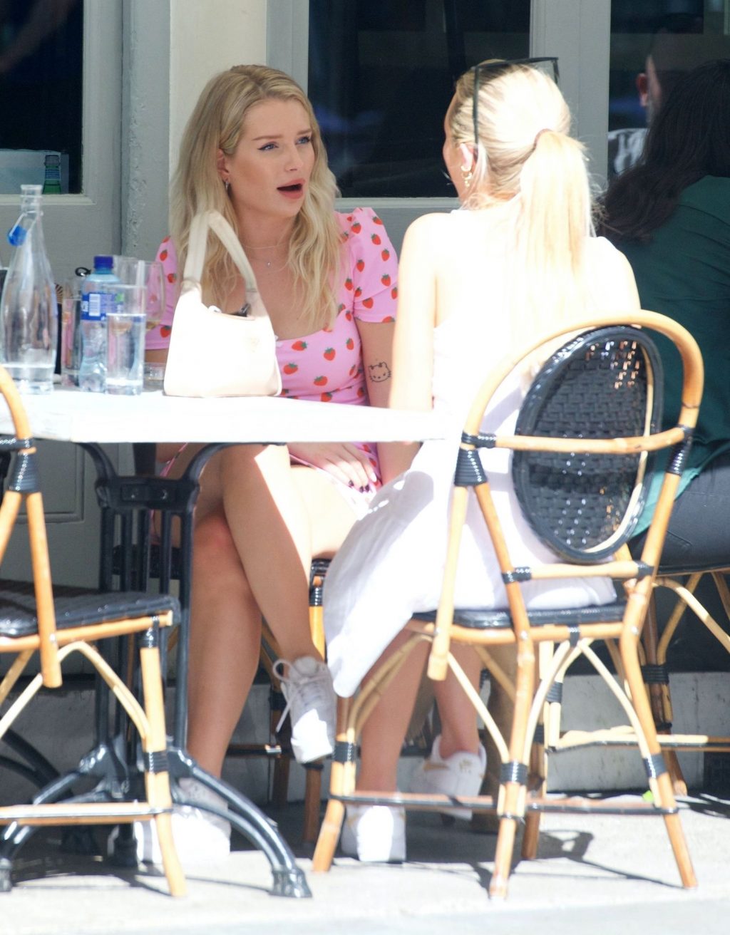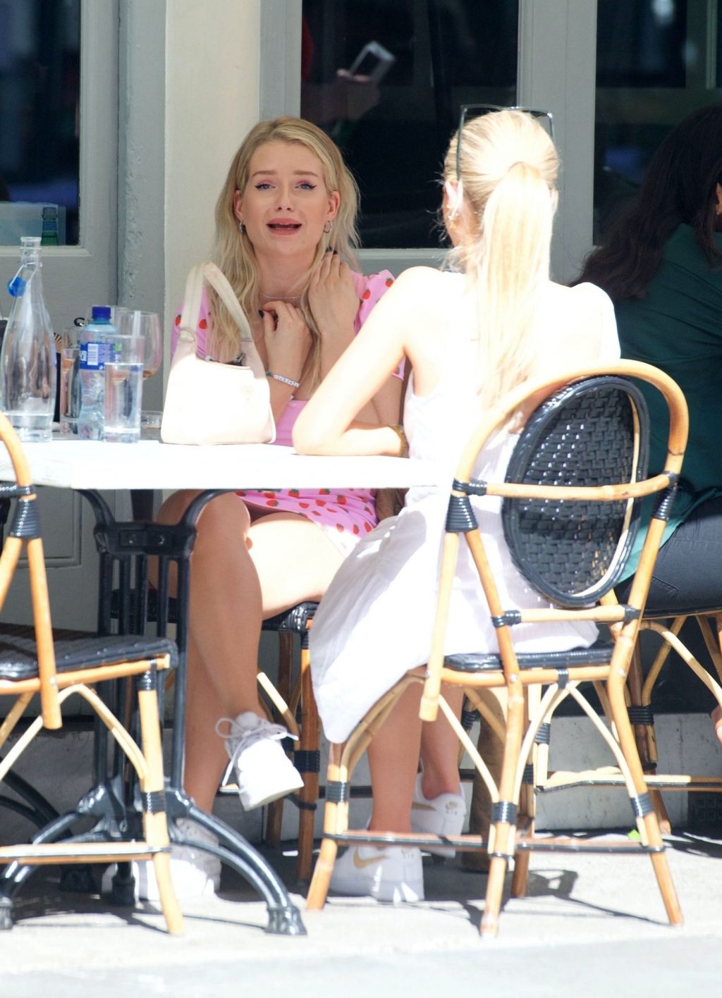 Lottie Moss quase para o trânsito ao usar um vestido muito curto enquanto está sentada à mesa, tendo uma conversa animada com uma amiga. Seu vestido rosa tinha pequenas morangos por toda parte. Sem o tênis de Wimbledon este ano, que deveria ter terminado no último domingo, Lottie ao menos usou seus morangos.
