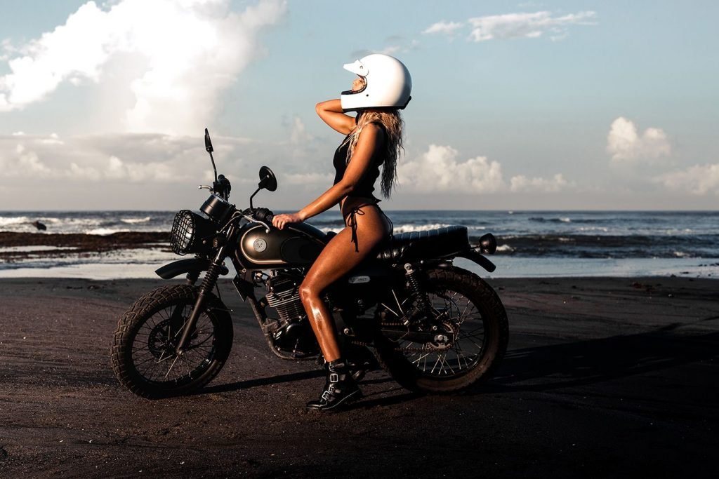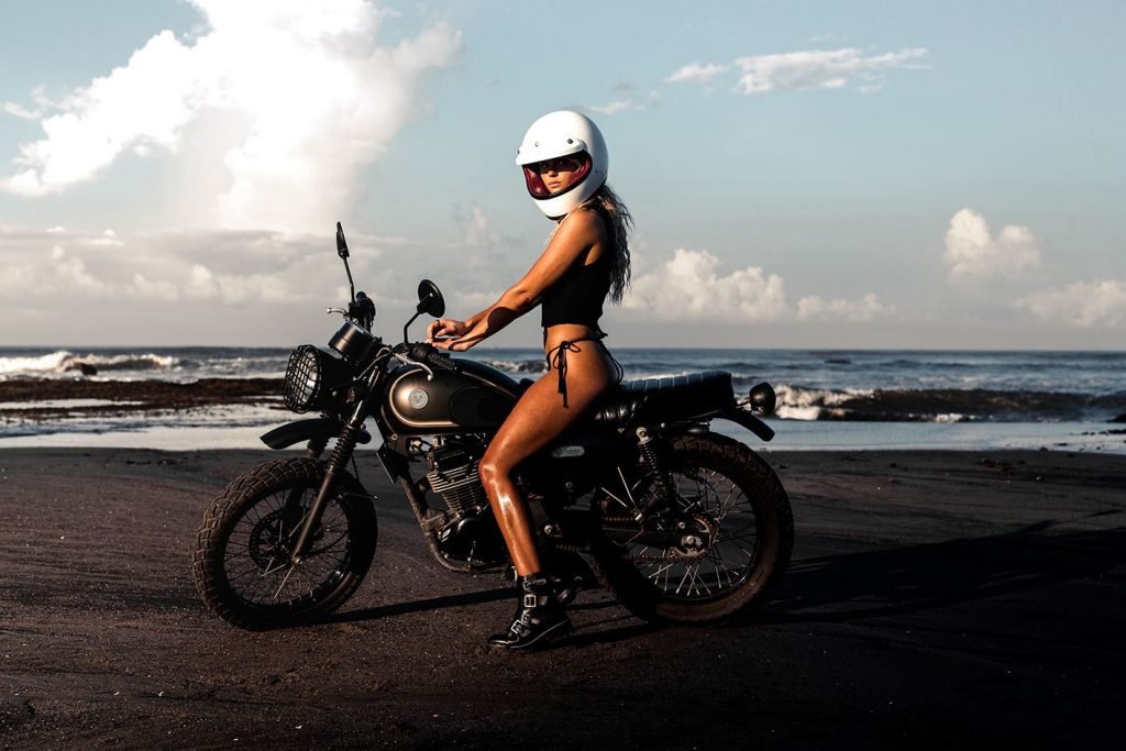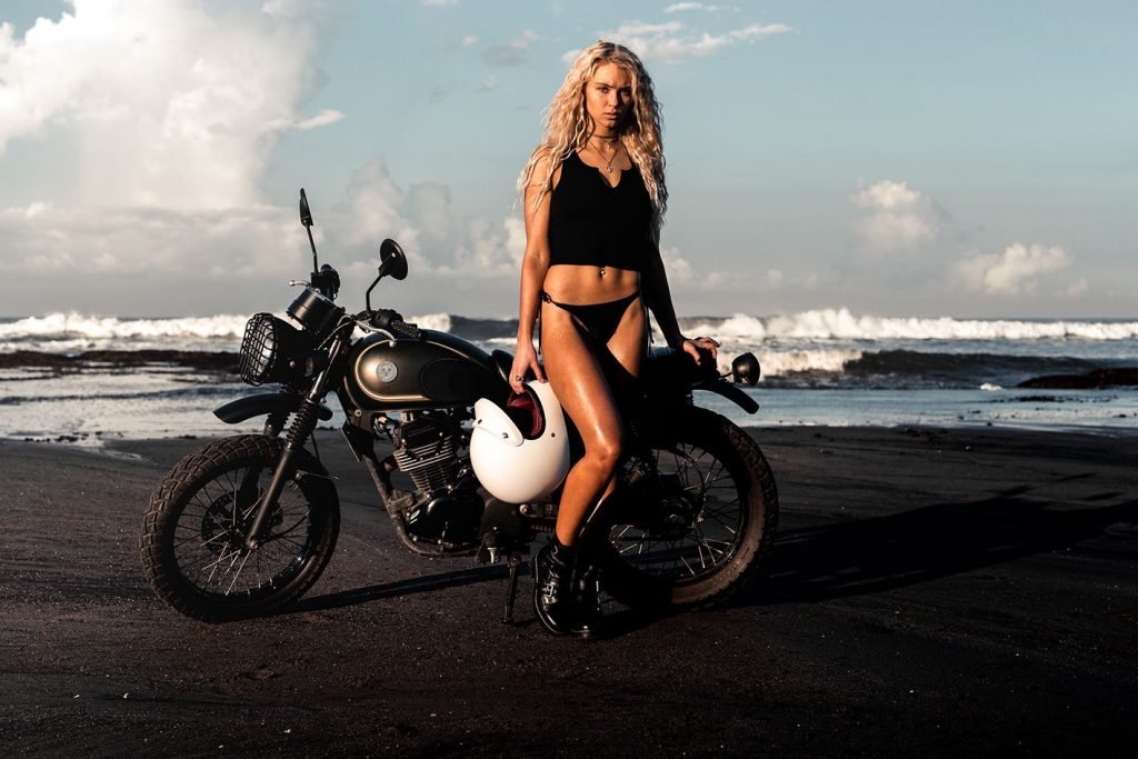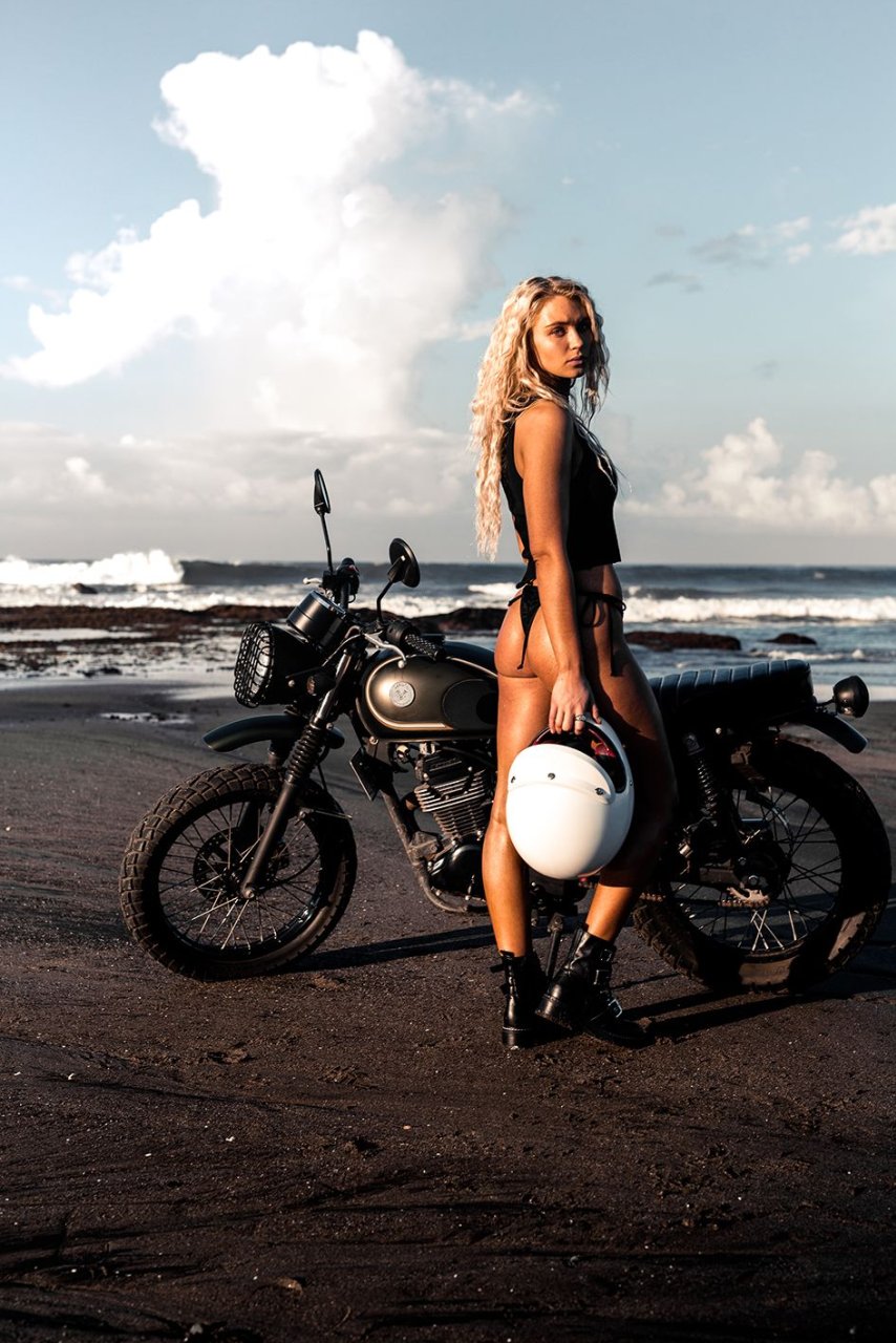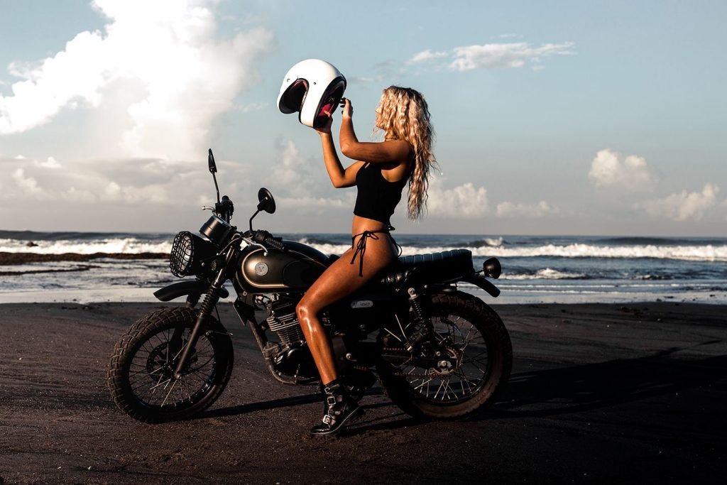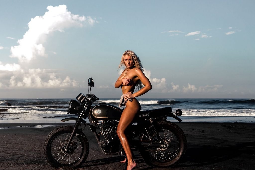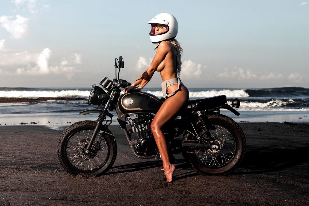 “Love Island” concorrente Lucie Rose Donlan posa topless em uma moto em uma praia de Bali, 06/03/2019.