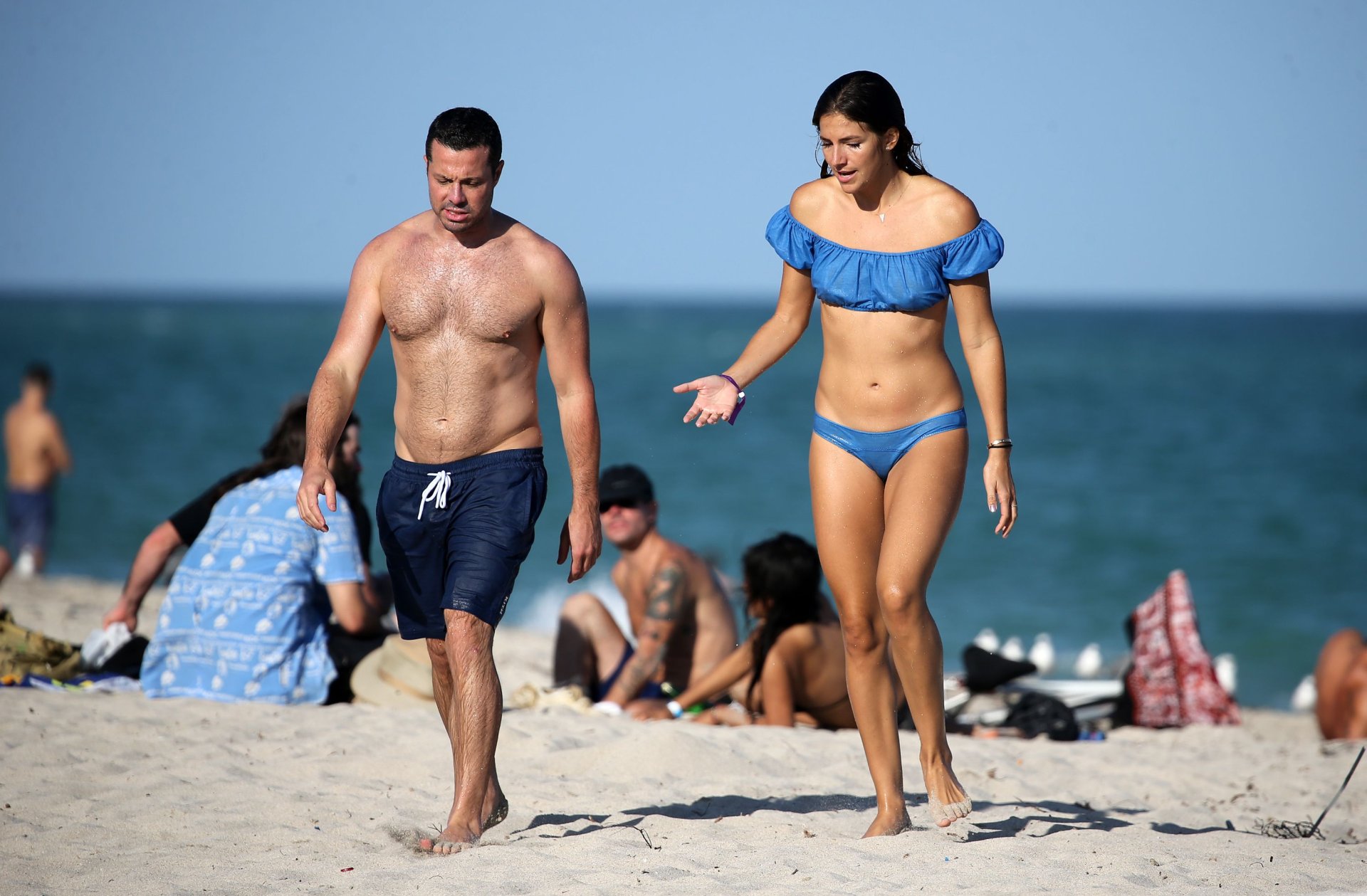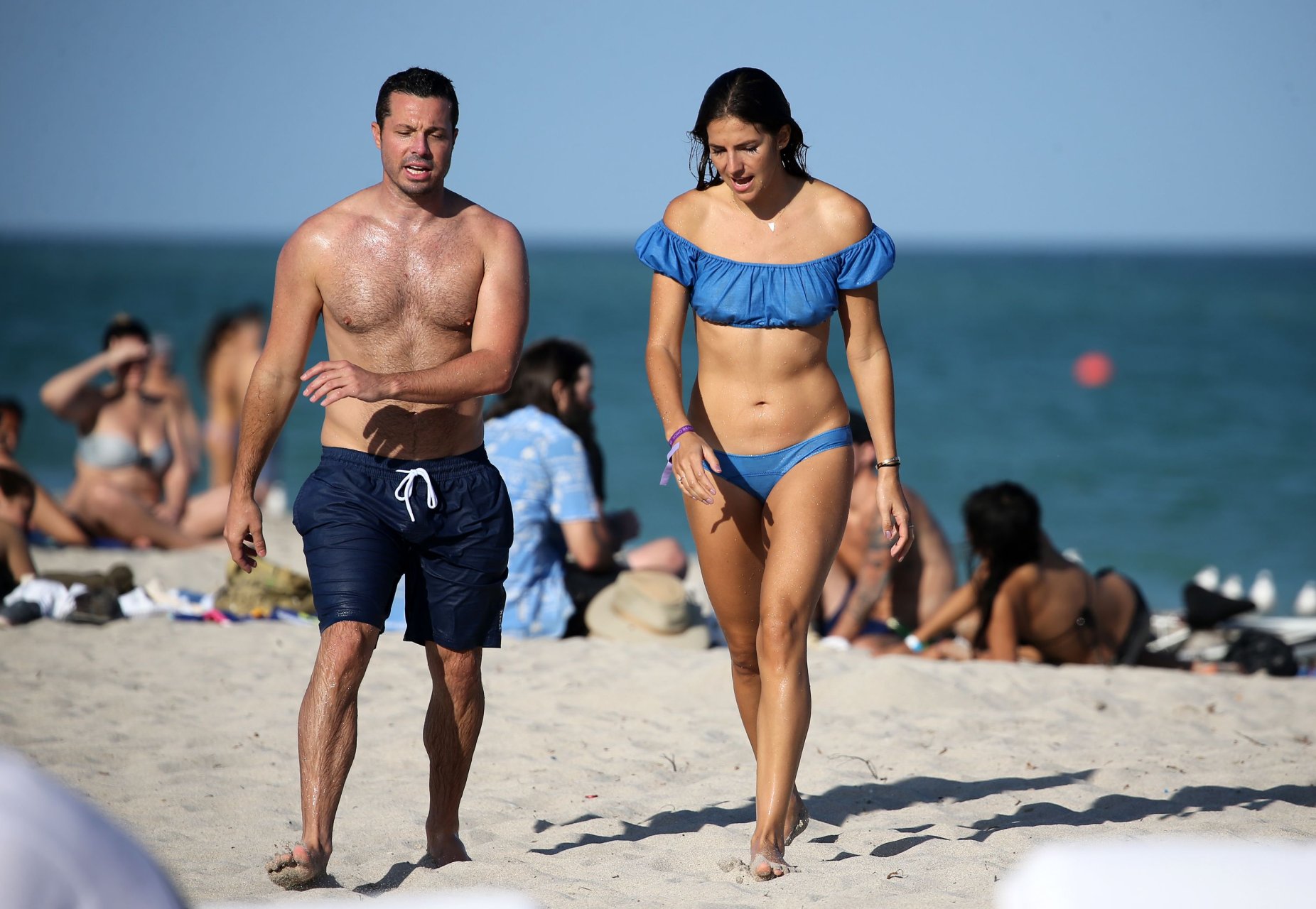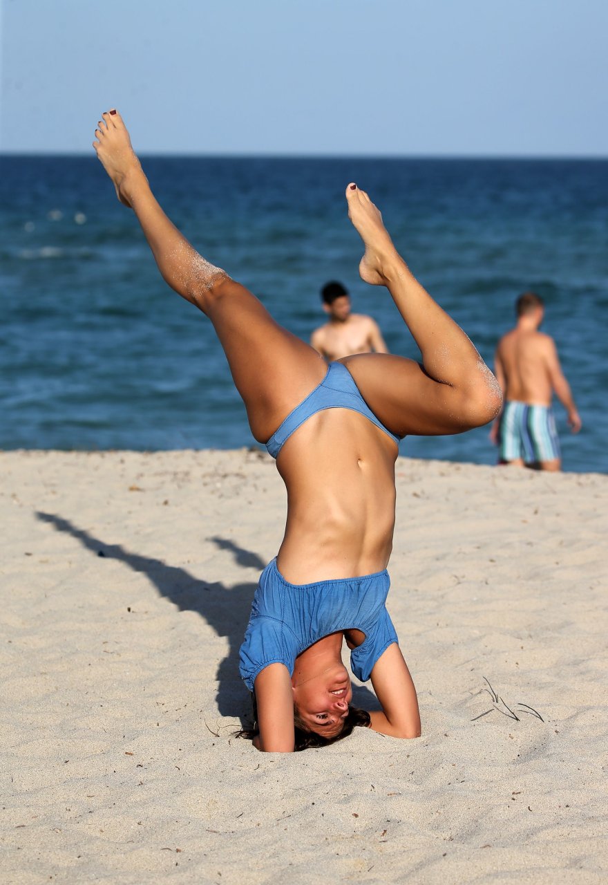 Lucinda Aragon em poses de yoga com biquíni azul em Miami Beach, 12/08/2017. Lucinda Aragon é modelo, estrela do Bachelor. Idade: 28 anos.