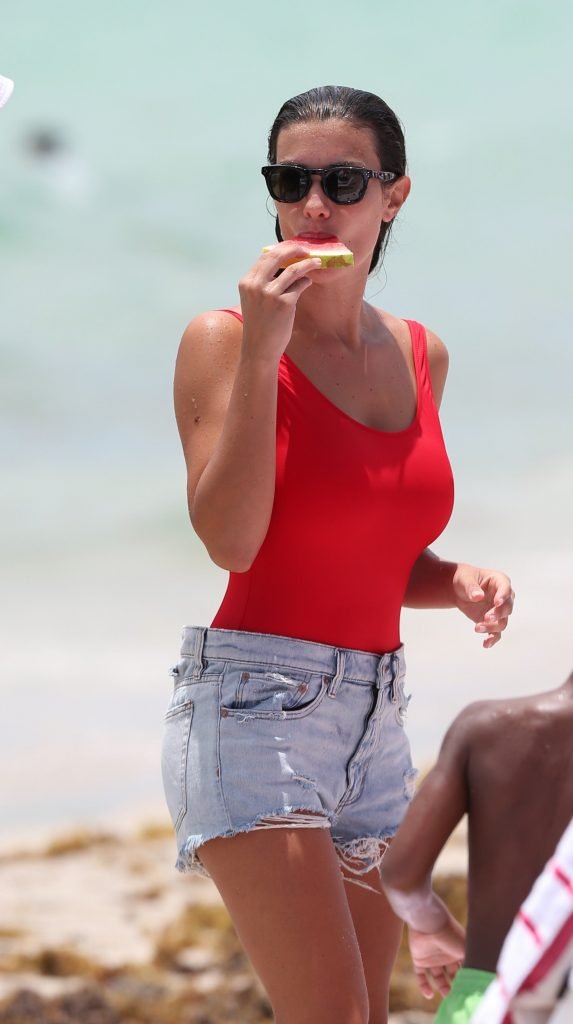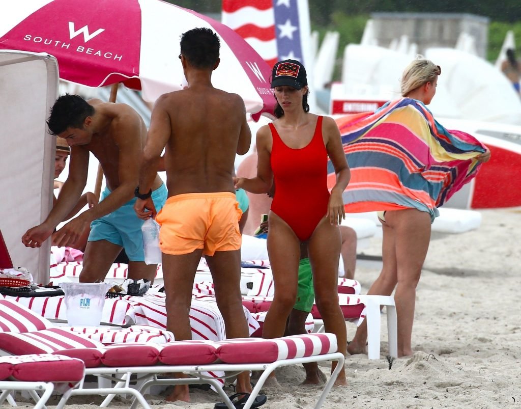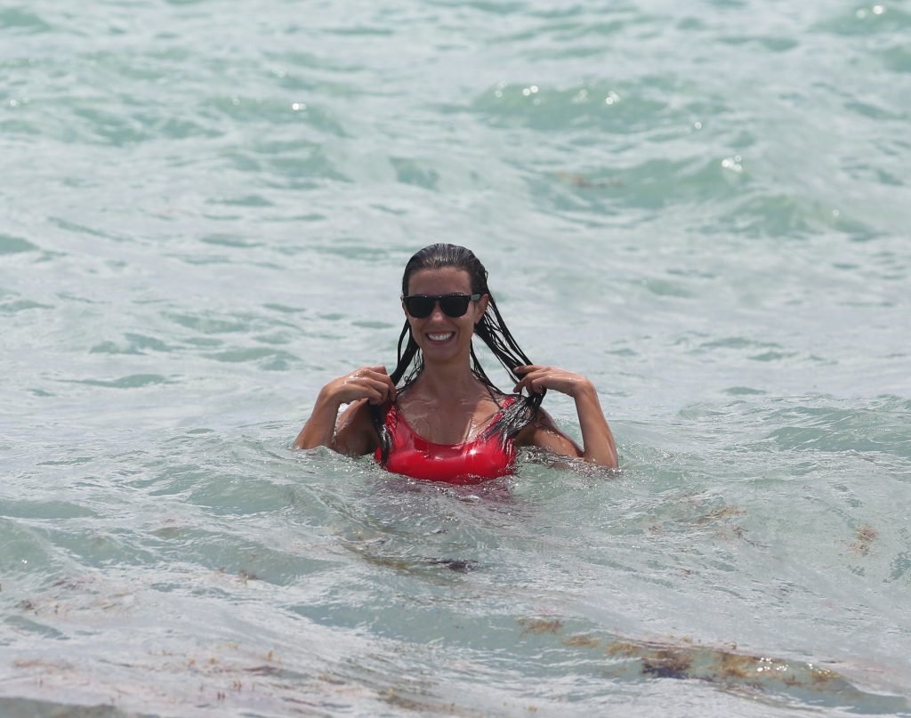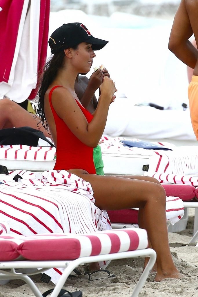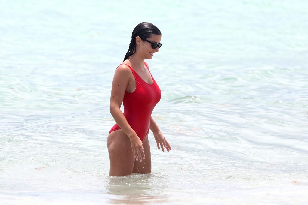 A esposa de Bacary Sagna, a modelo Ludivine Kadri, aproveita um tempo na praia com um sexy maiô vermelho em Miami, 12/07/2017.
