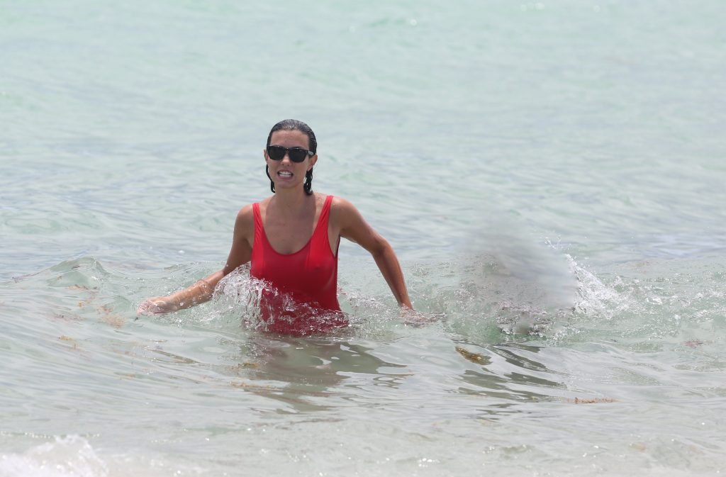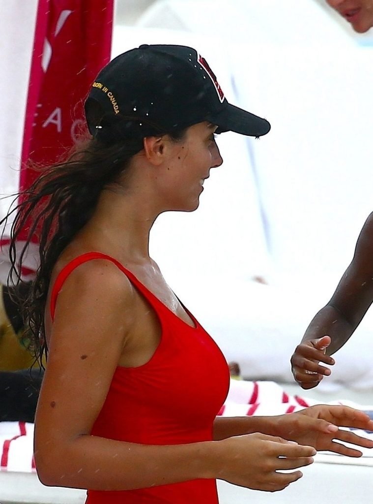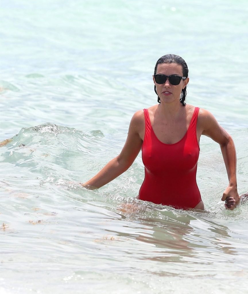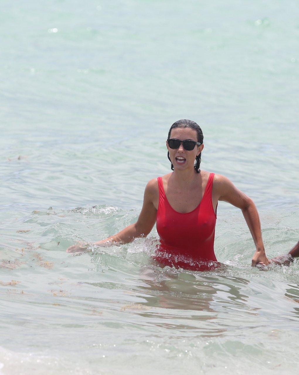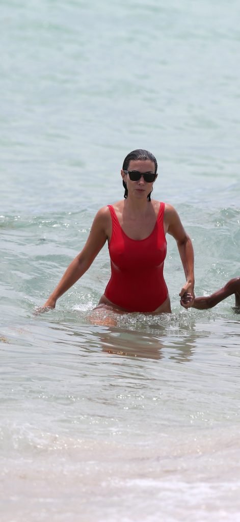A esposa de Bacary Sagna, a modelo Ludivine Kadri, aproveita um tempo na praia com um sexy maiô vermelho em Miami, 12/07/2017.