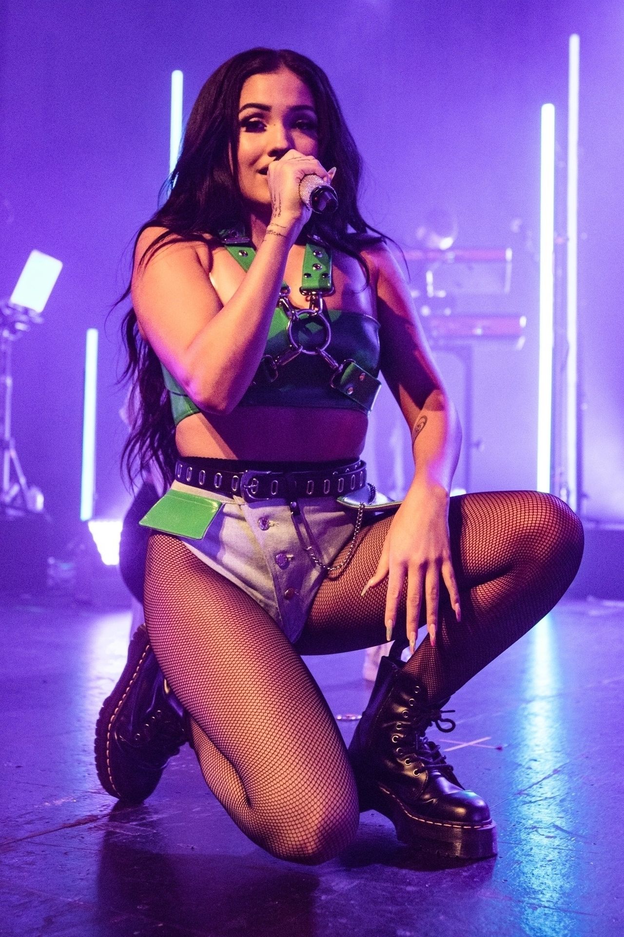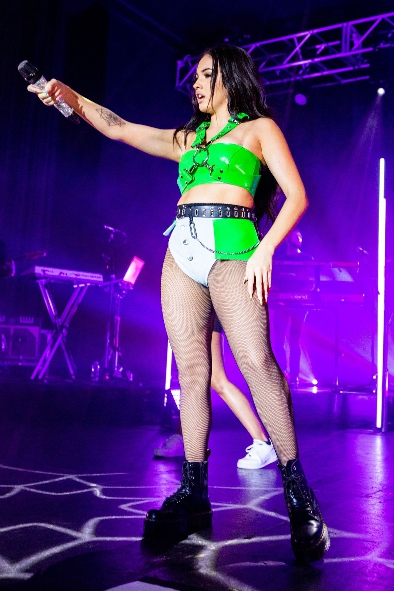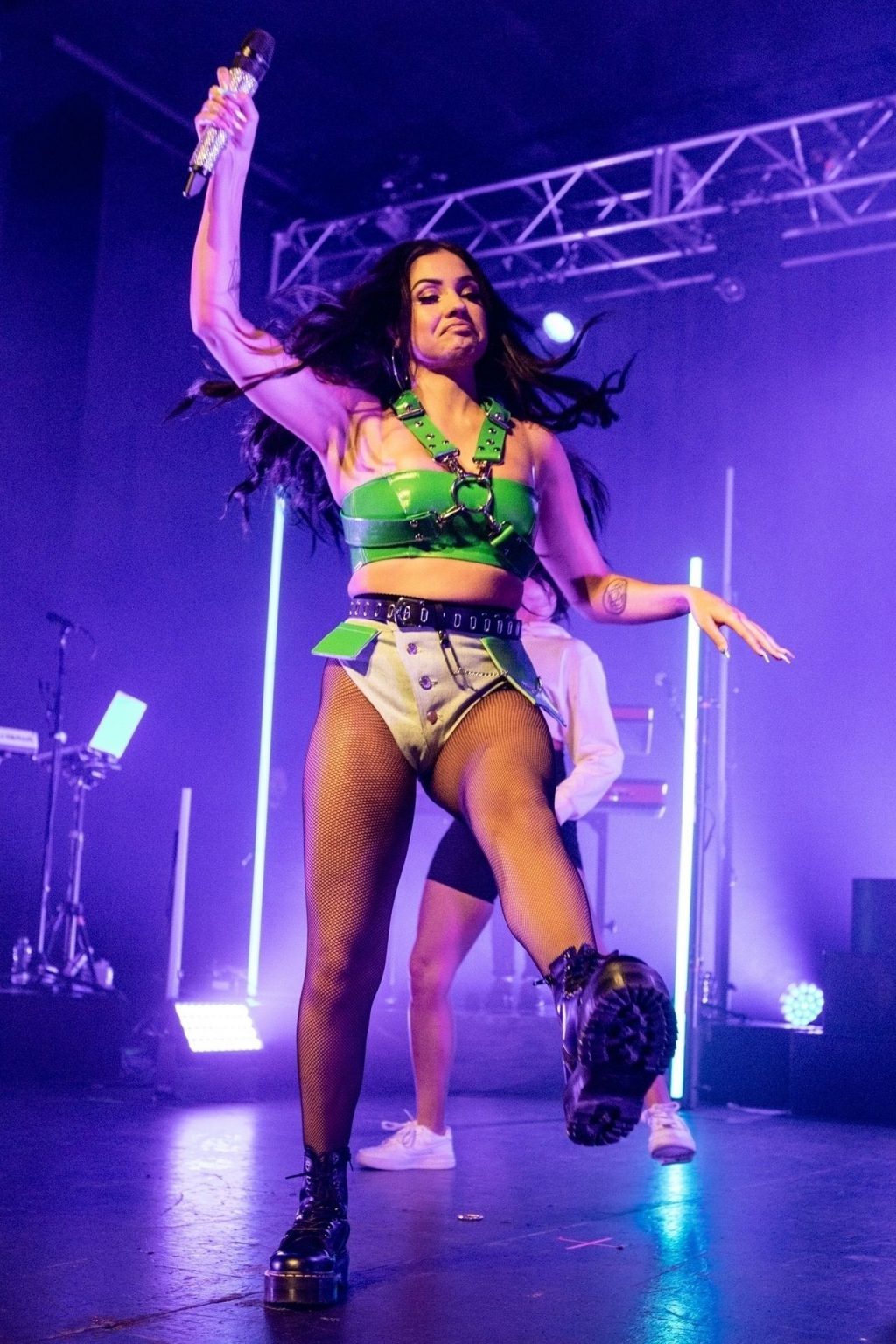 A cantora pop Mabel (filha de Neneh Cherry) impressionou a casa cheia esgotada do O2 Academy em Birmingham, enquanto a cantora subia ao palco vestindo um top cropped, meia arrastão e shorts bem curtos que mostravam suas pernas e bumbum, 02/11/2020.