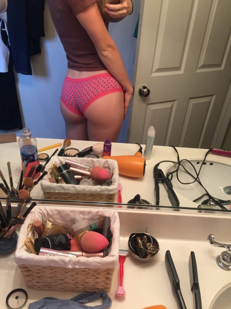 Bunda muito bonita, espaçamento entre as coxas e vagina depilada. Ela fica ótima de calcinha.