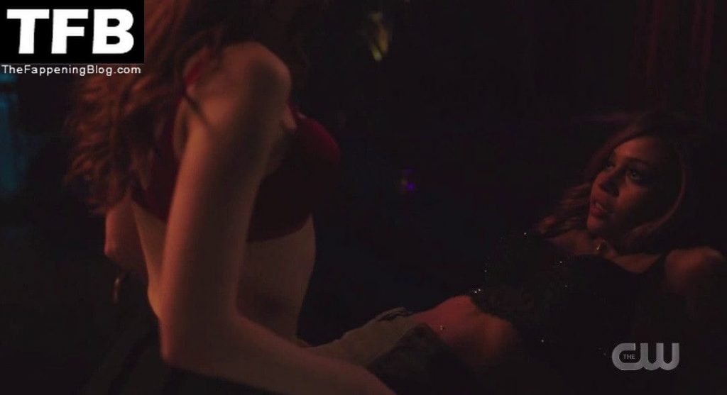 There is the scene of two hotties, Madelaine Petsch & Ashleigh Murray’s lesbian kiss from ‘Riverdale’! There is gorgeous redhead Madelaine Petsch is seen showing deep cleavage in a red bra, and Ashleigh Murray wearing a blacktop. They’re at first seen from above talking and then looking at their cell phones, before they roll over and start the lesbian action, kissing and moaning!