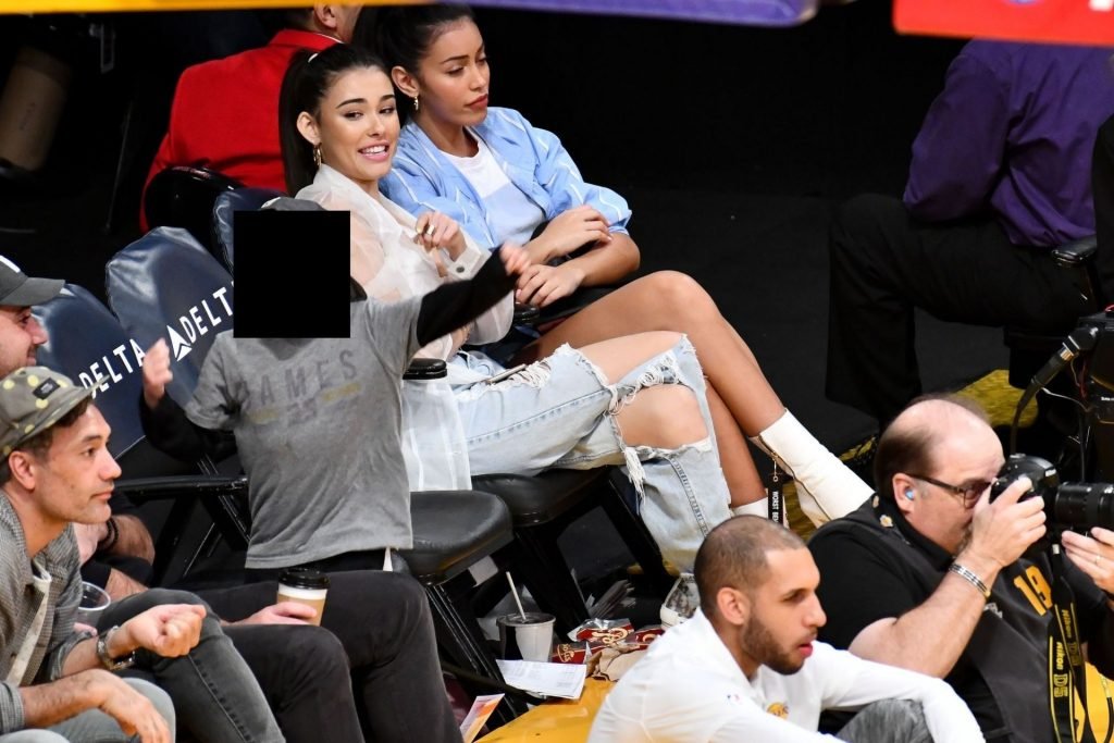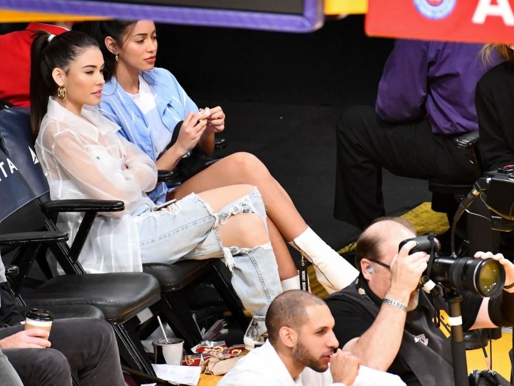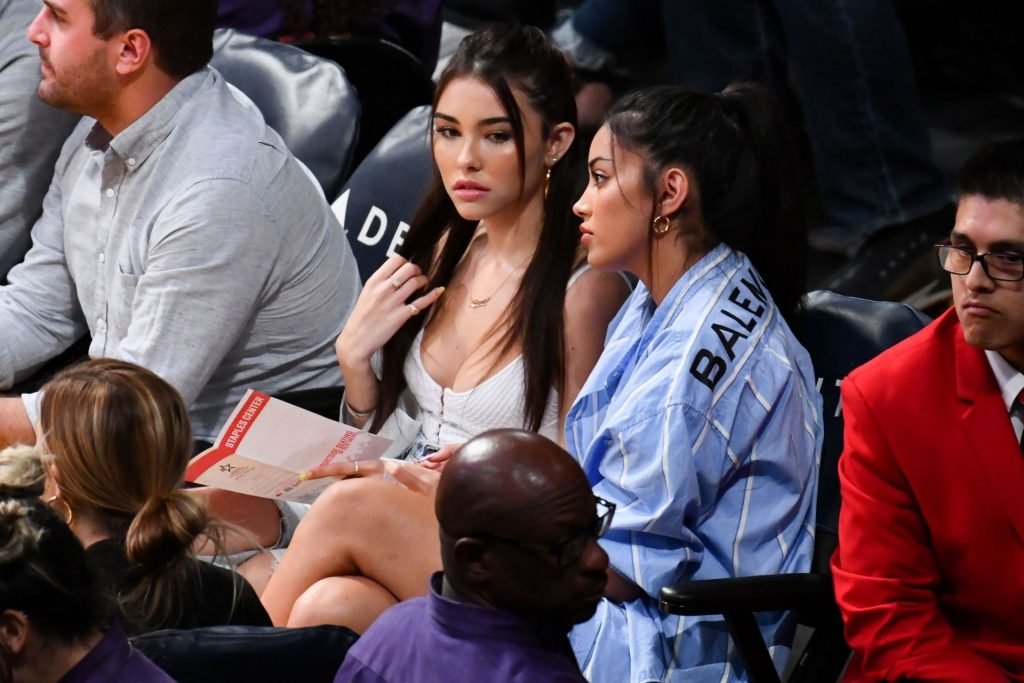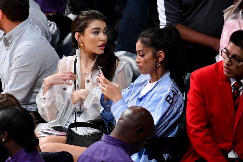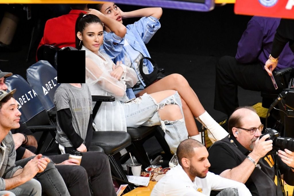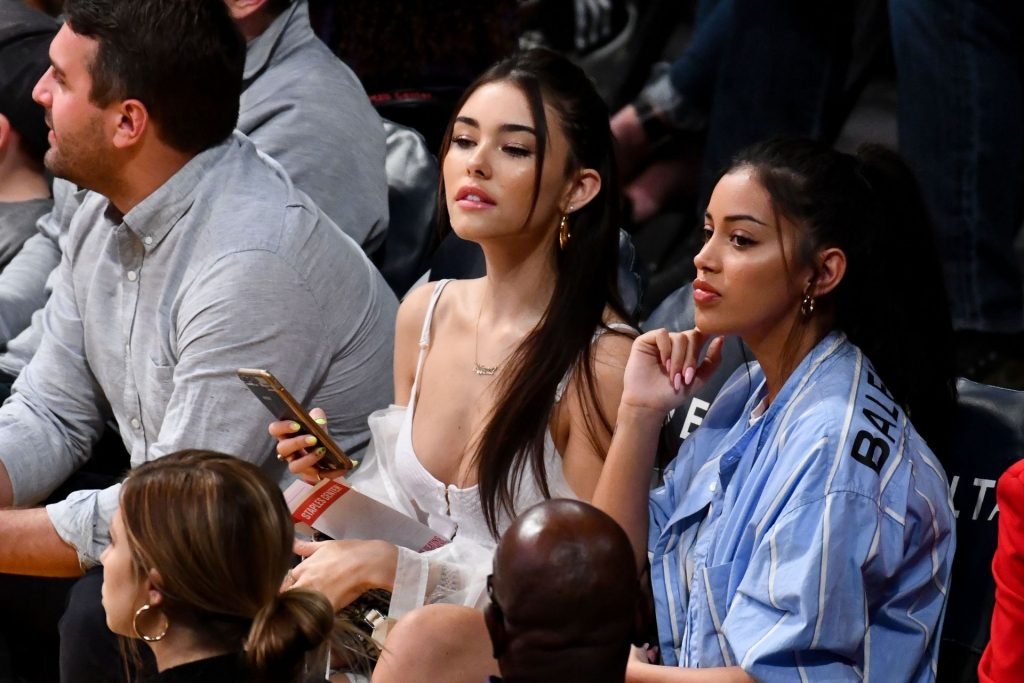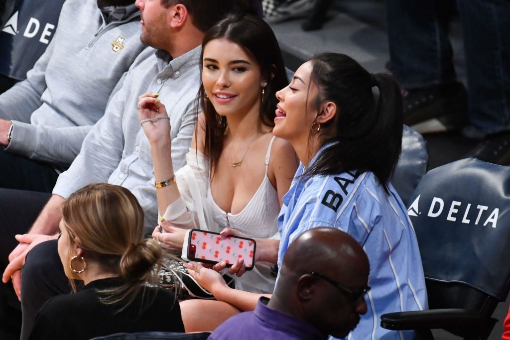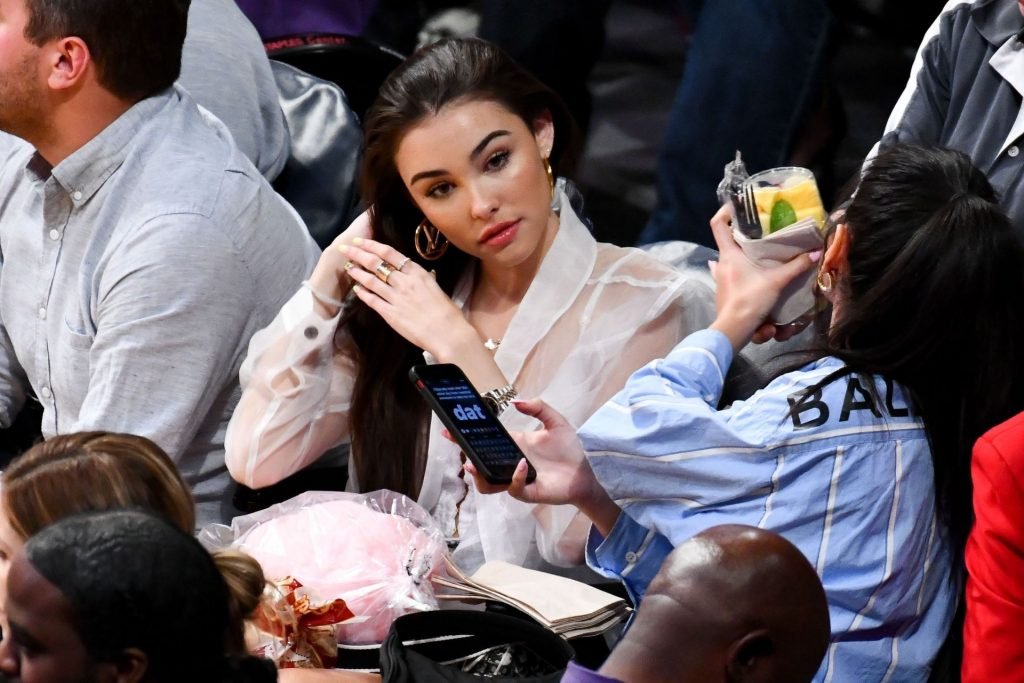 A cantora Madison Beer exibe seu decote usando uma blusa branca no jogo Los Angeles Lakers vs Phoenix Suns em Los Angeles, 27/01/2019.