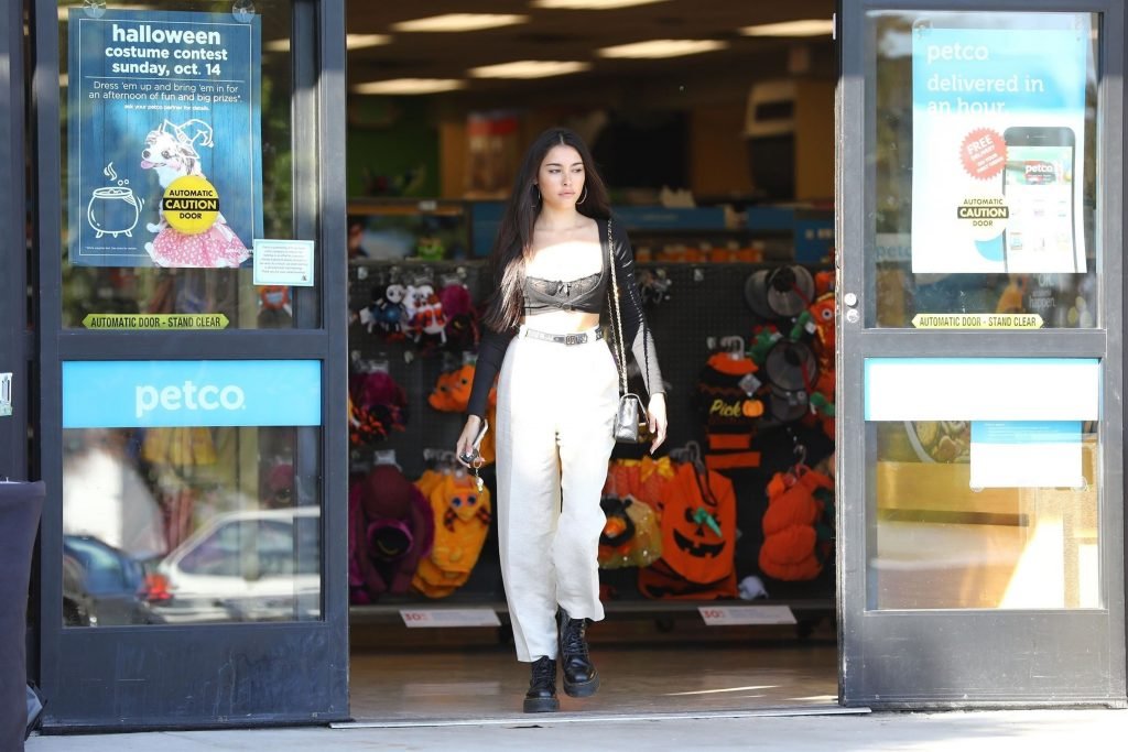 Singer Madison Beer (19) para para pegar alguns suprimentos para cachorro na Petco em Los Angeles, 10/10/2018. Madison usava uma roupa reveladora com um suéter preto aberto na frente que mostrava seu sutiã preto e abdômen tonificado enquanto pegava algumas fraldas para filhotes.