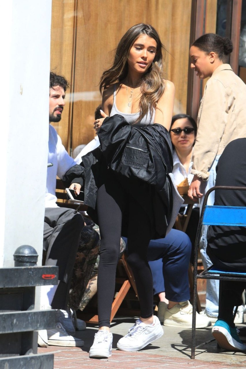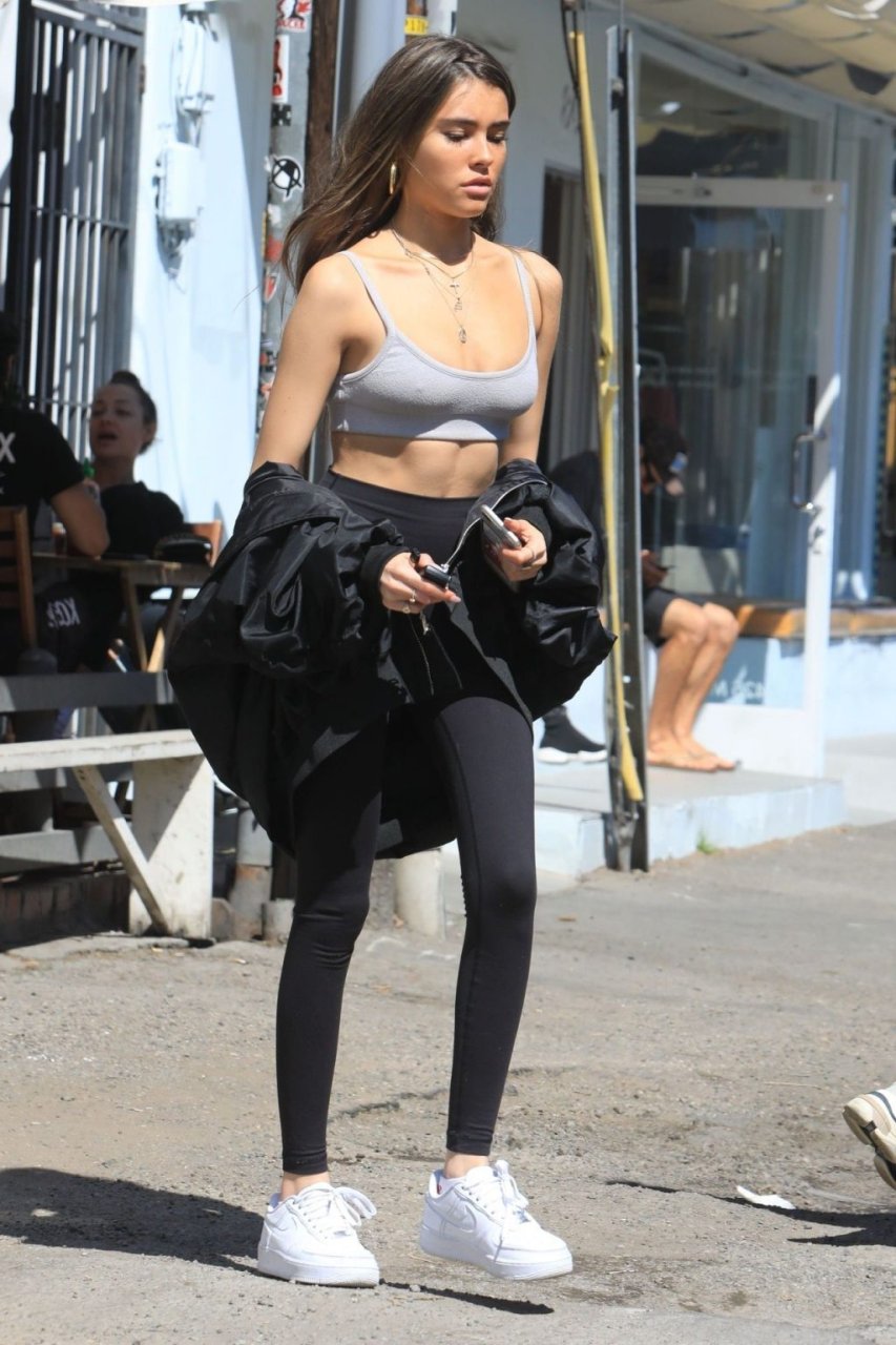 Madison Beer exibe seu físico e peitinhos com uma amiga em West Hollywood, 04/06/2019. A cantora usou um top esportivo, leggings e tênis branco.