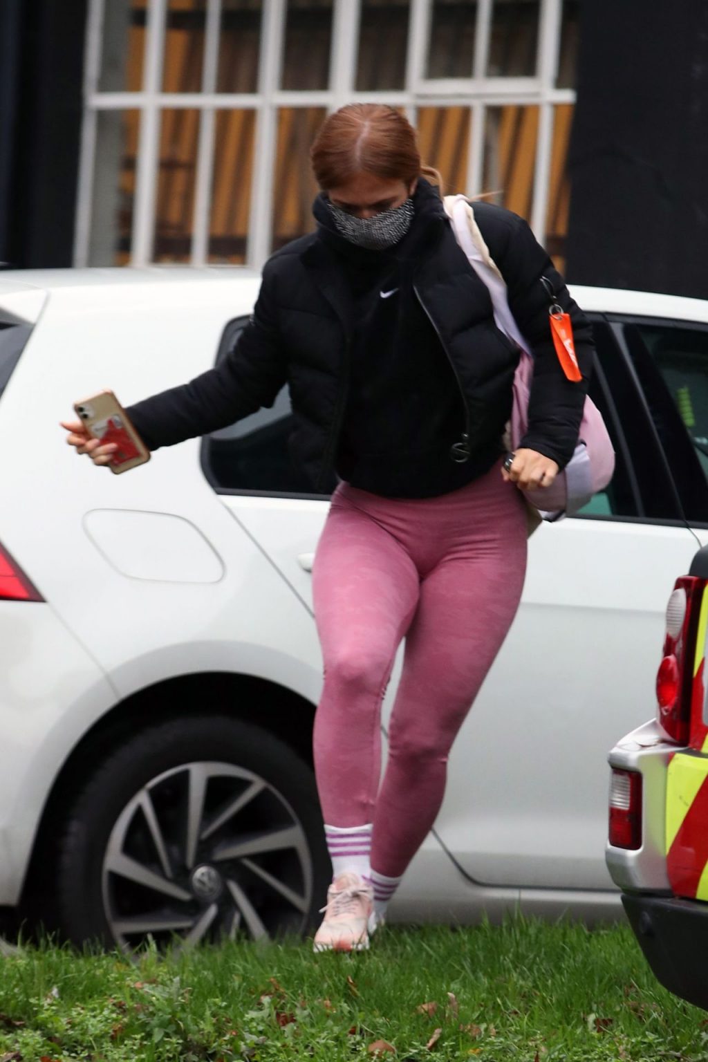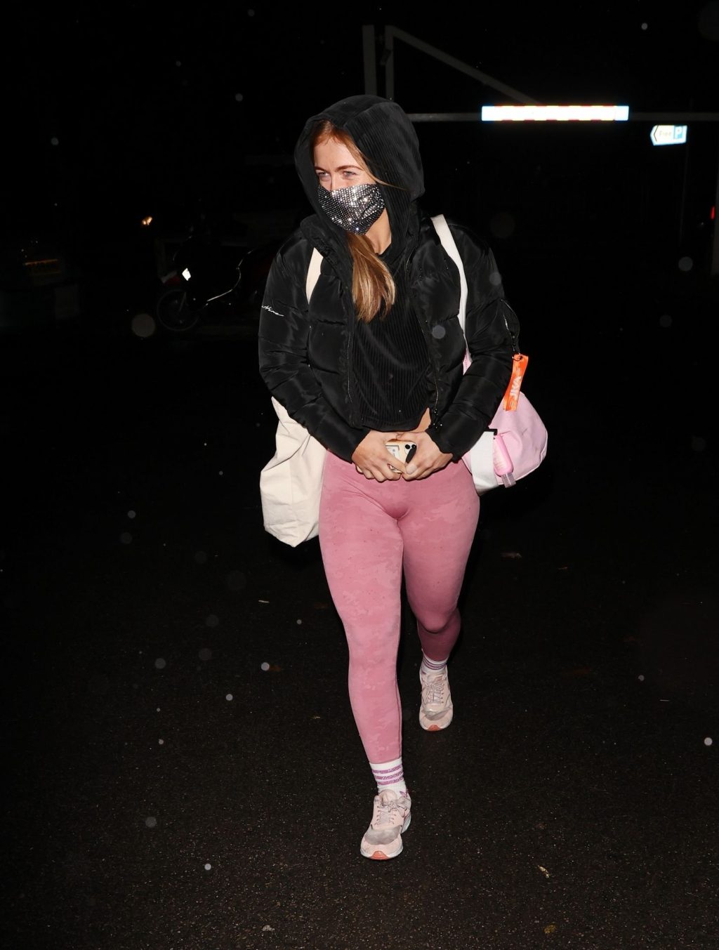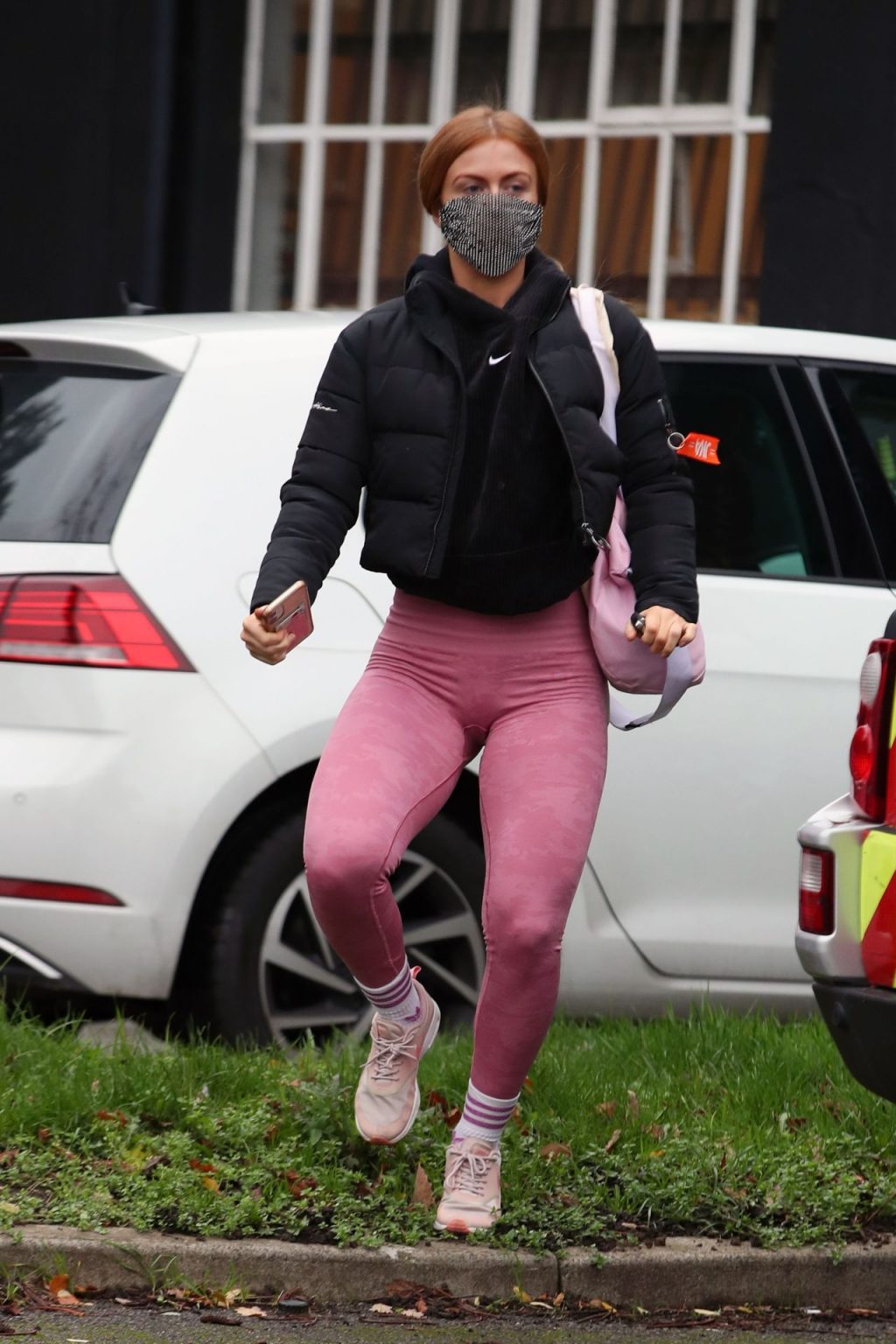 “Eastenders” atriz e estrela do “Strictly Come Dancing” Maisie Smith dá o sinal de positivo enquanto é fotografada chegando e saindo dos estúdios de ensaio do Strictly usando máscara facial em Londres, 16/11/2020.