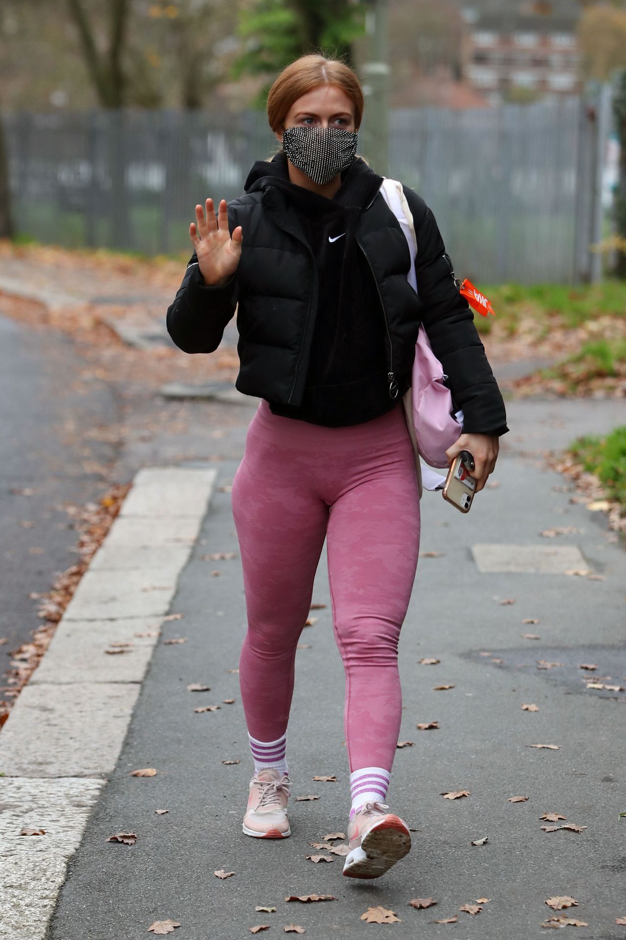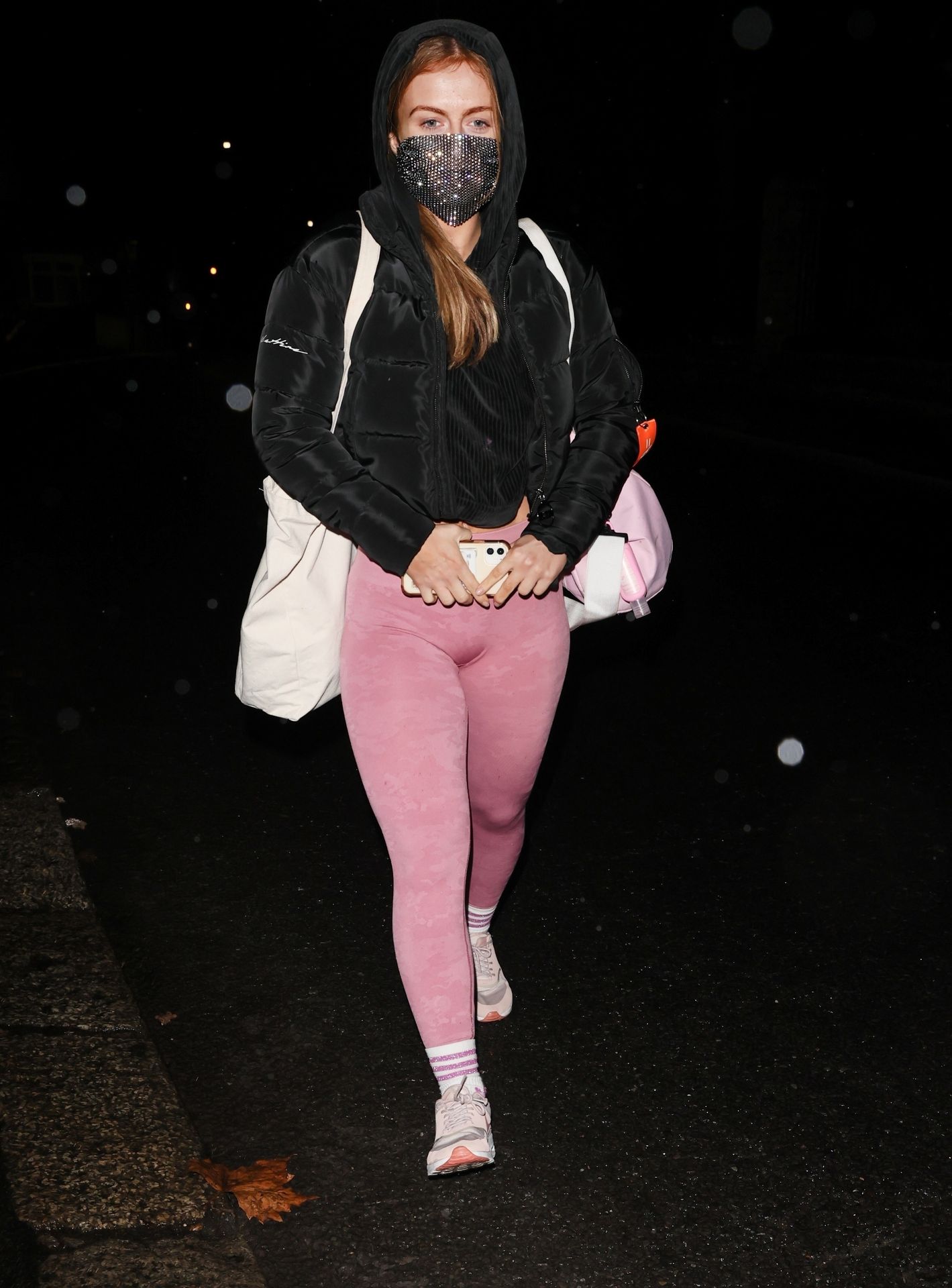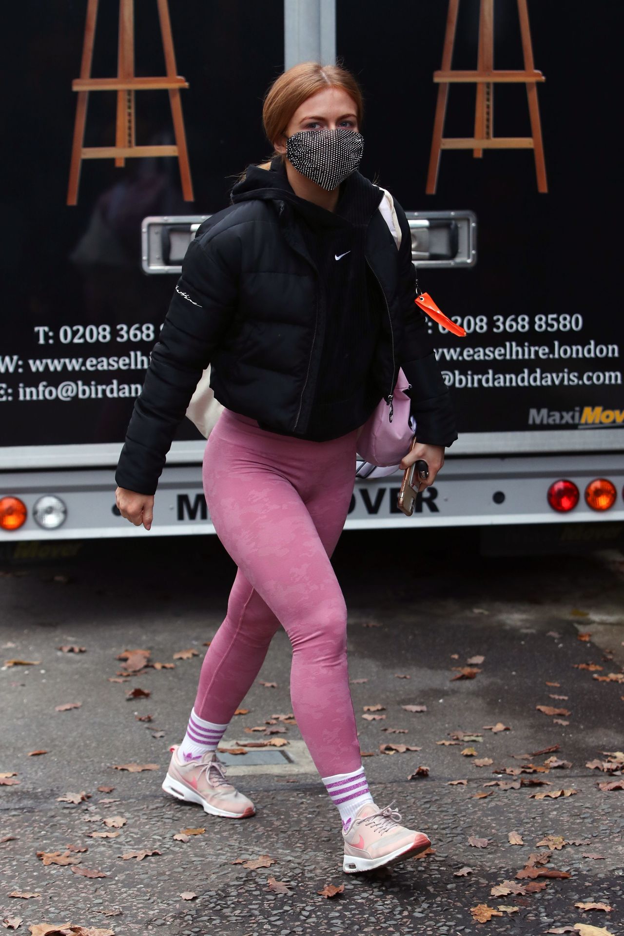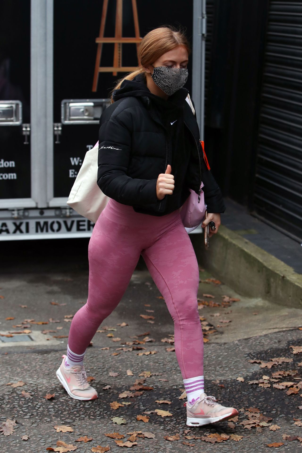 “Eastenders” atriz e estrela do “Strictly Come Dancing” Maisie Smith dá o sinal de positivo enquanto é fotografada chegando e saindo dos estúdios de ensaio do Strictly usando máscara facial em Londres, 16/11/2020.