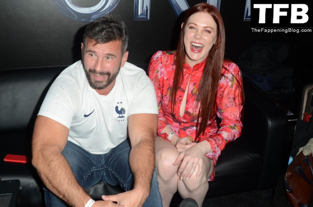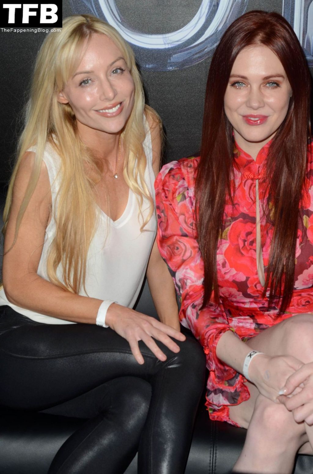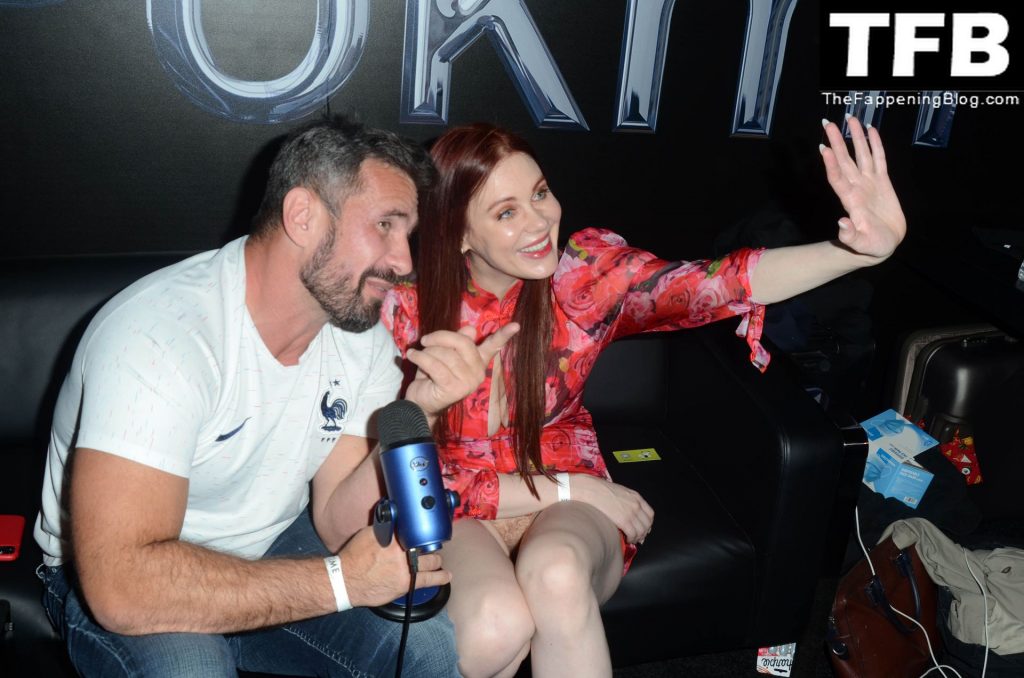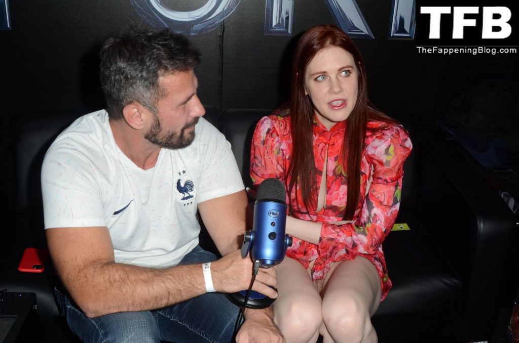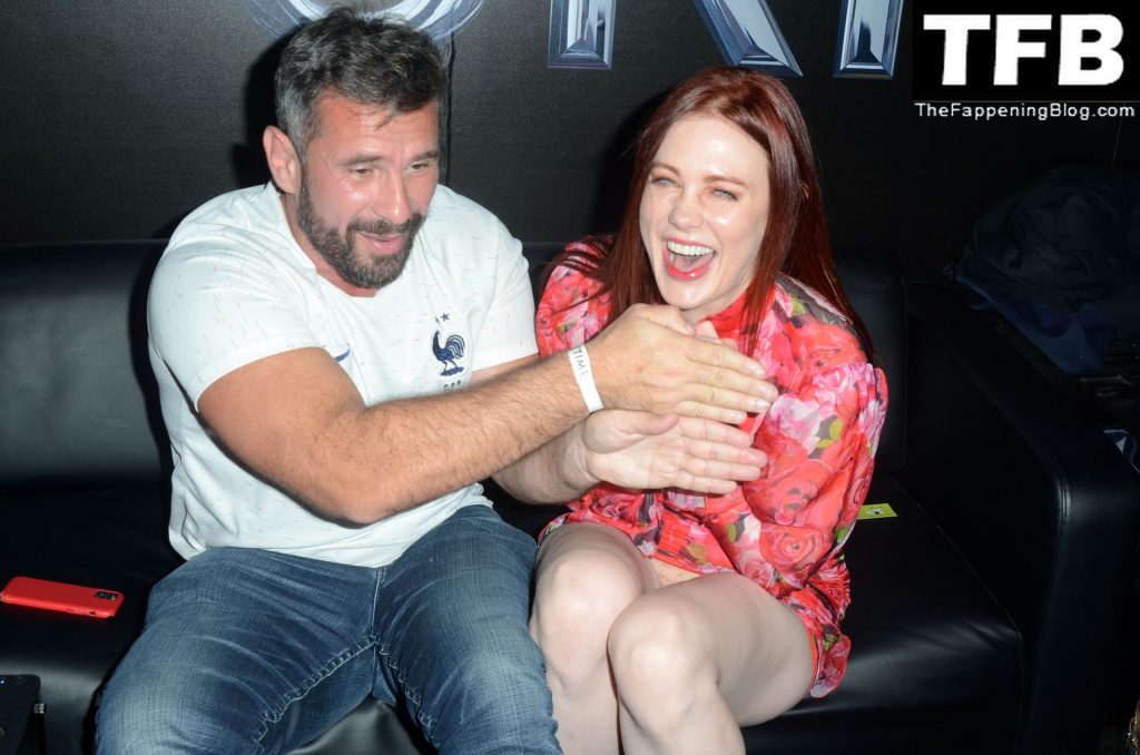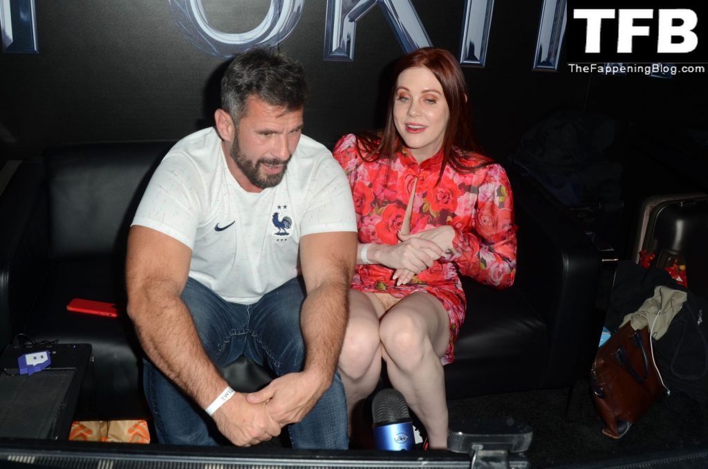 Maitland Ward teve uma séria falha de guarda-roupa enquanto era entrevistada pelo co-ator adulto Manuel Ferrara na convenção X3 no Hollywood Palladium, 07/01/2022.