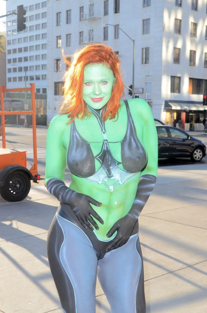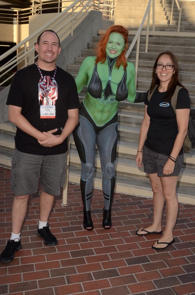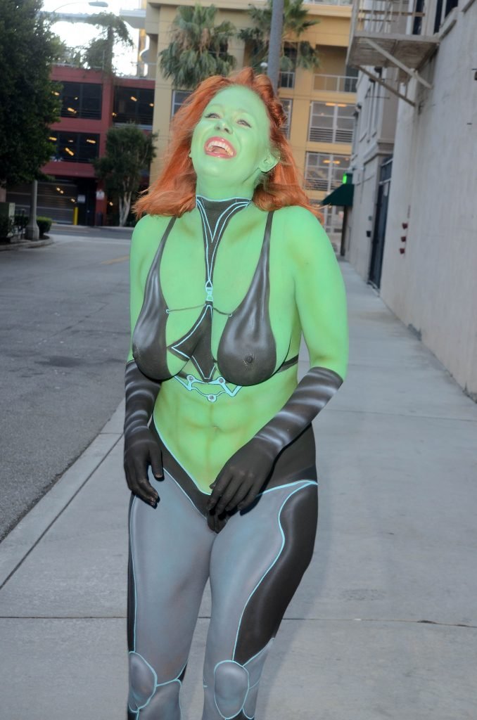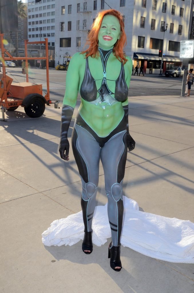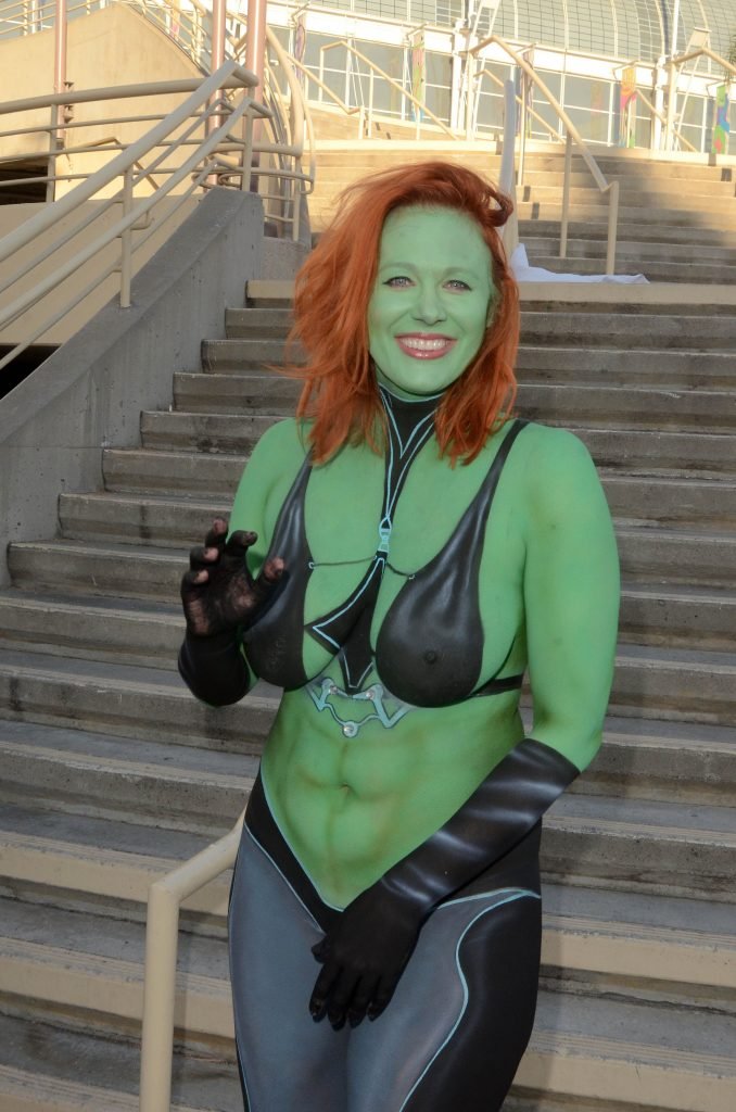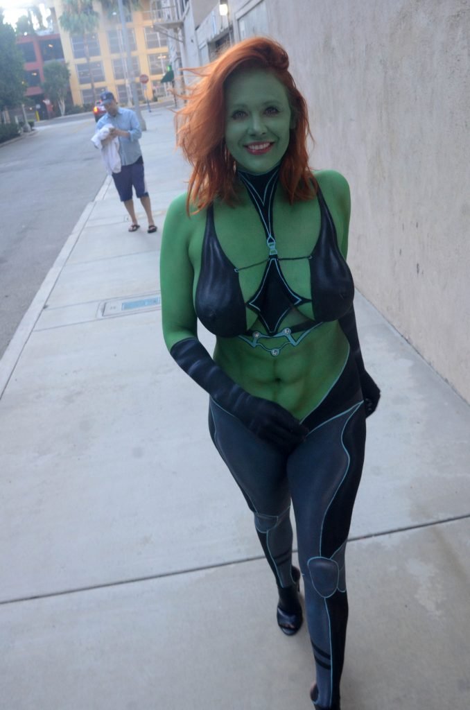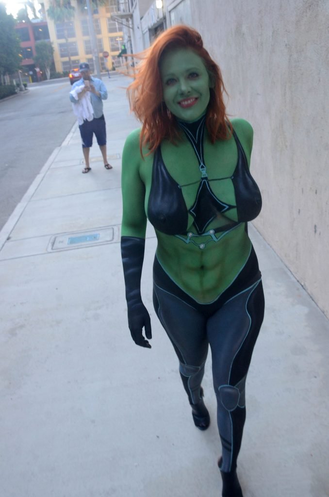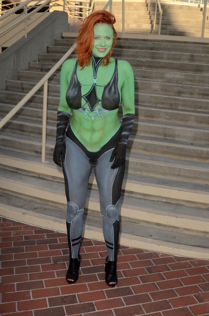 Se ela é provocante ou não, se é 'cosplayer' ou fashionista ou não, há um fato incontestável... essa mulher nunca seria permitida perto da Comic Con com essa 'roupa'. Embora as pessoas lá sejam bastante permissivas quanto às roupas que as pessoas usam, são bastante rígidas (sem trocadilhos) quando se trata de nudez. Adrianne Curry, que tem muito mais credibilidade na comunidade de cosplay e Comic Con, foi avisada para se cobrir ou sair há alguns anos por usar o que basicamente eram shorts curtíssimos. Além do fato de que isto é obviamente pintura corporal—quer dizer, vamos, seus mamilos e lábios são visíveis—ela não entraria em nenhuma das salas. A Comic Con tem uma mistura justa de sensualidade (eu já estive lá e há bastante pele visível, embora não nudez). Isso está além do que alguém acharia remotamente aceitável.