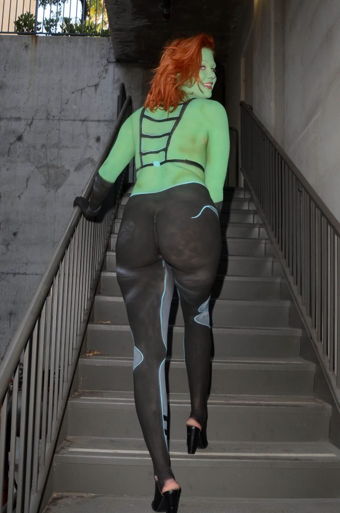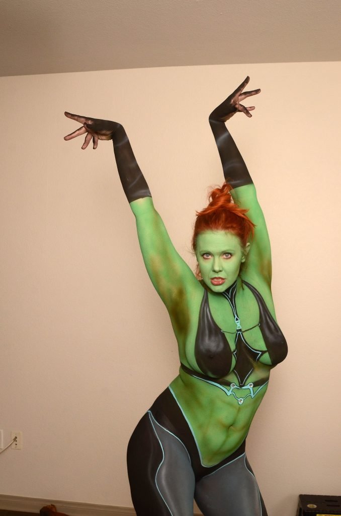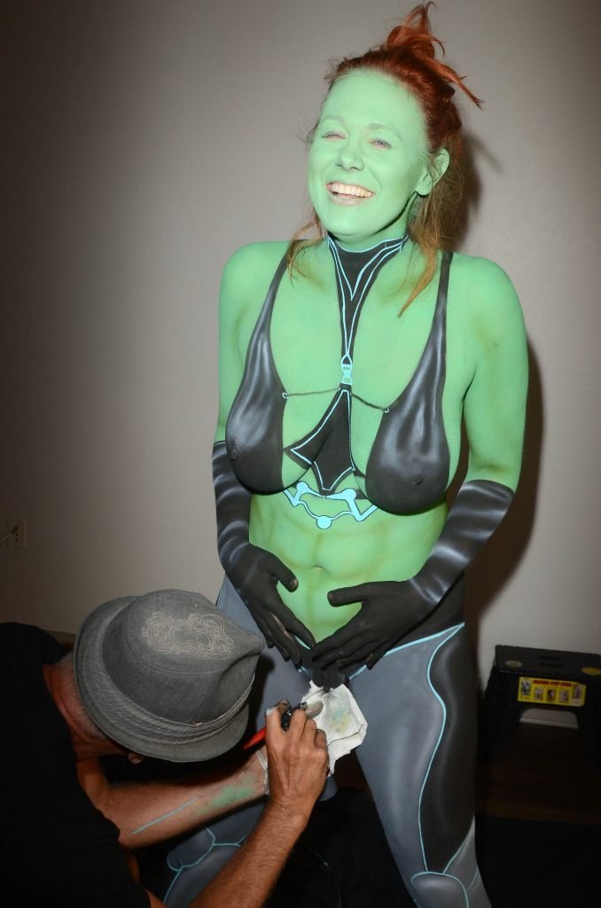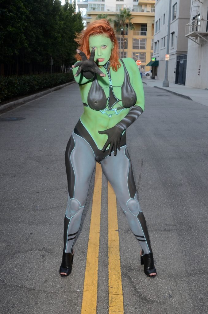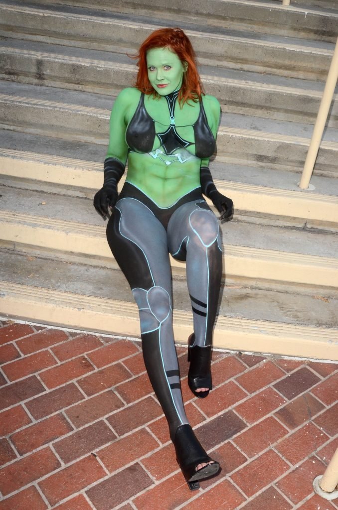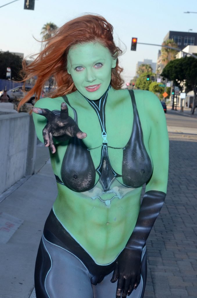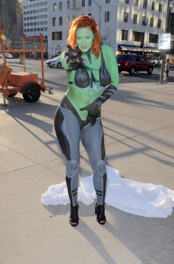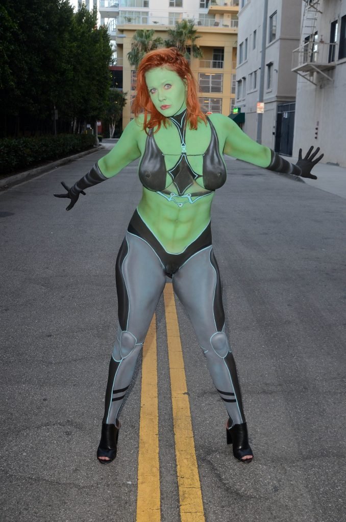 Se ela é provocante ou não, se é 'cosplayer' ou fashionista ou não, há um fato incontestável... essa mulher nunca seria permitida perto da Comic Con com essa 'roupa'. Embora as pessoas lá sejam bastante permissivas quanto às roupas que as pessoas usam, são bastante rígidas (sem trocadilhos) quando se trata de nudez. Adrianne Curry, que tem muito mais credibilidade na comunidade de cosplay e Comic Con, foi avisada para se cobrir ou sair há alguns anos por usar o que basicamente eram shorts curtíssimos. Além do fato de que isto é obviamente pintura corporal—quer dizer, vamos, seus mamilos e lábios são visíveis—ela não entraria em nenhuma das salas. A Comic Con tem uma mistura justa de sensualidade (eu já estive lá e há bastante pele visível, embora não nudez). Isso está além do que alguém acharia remotamente aceitável.