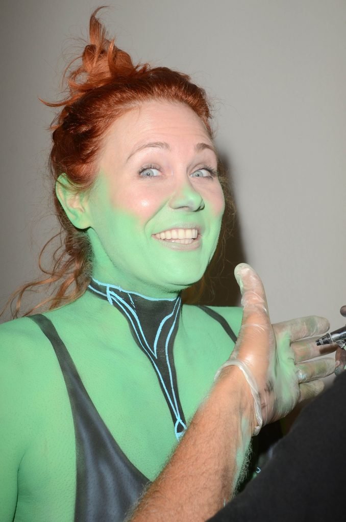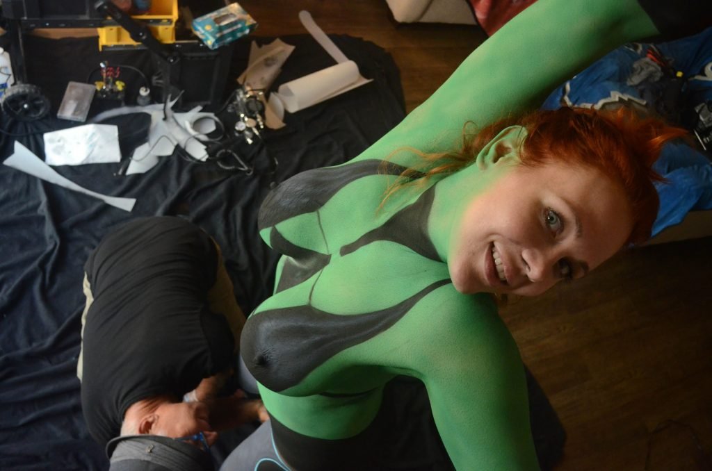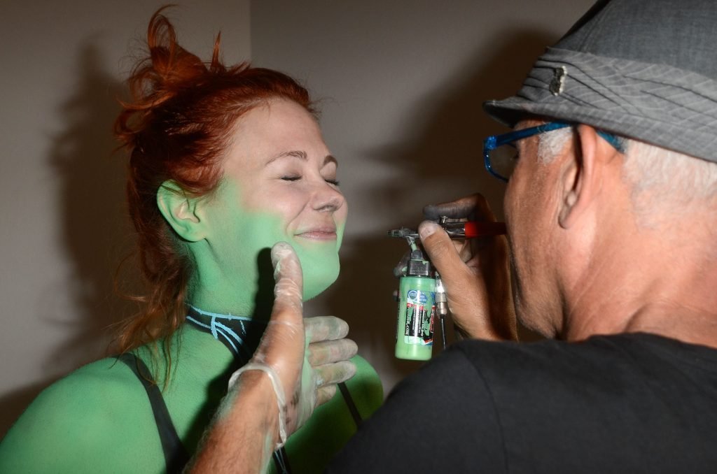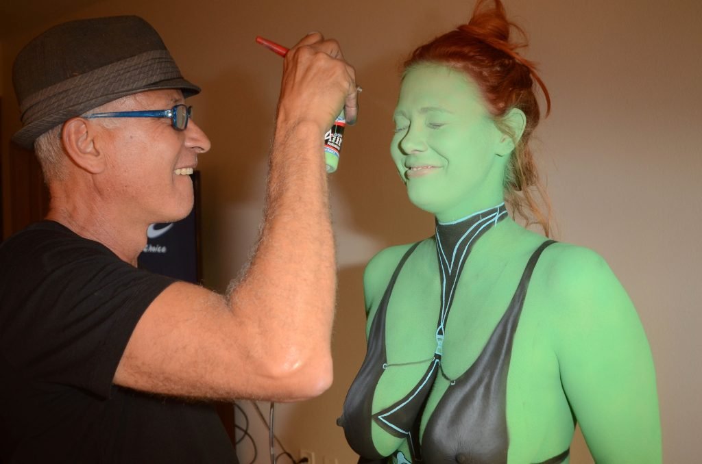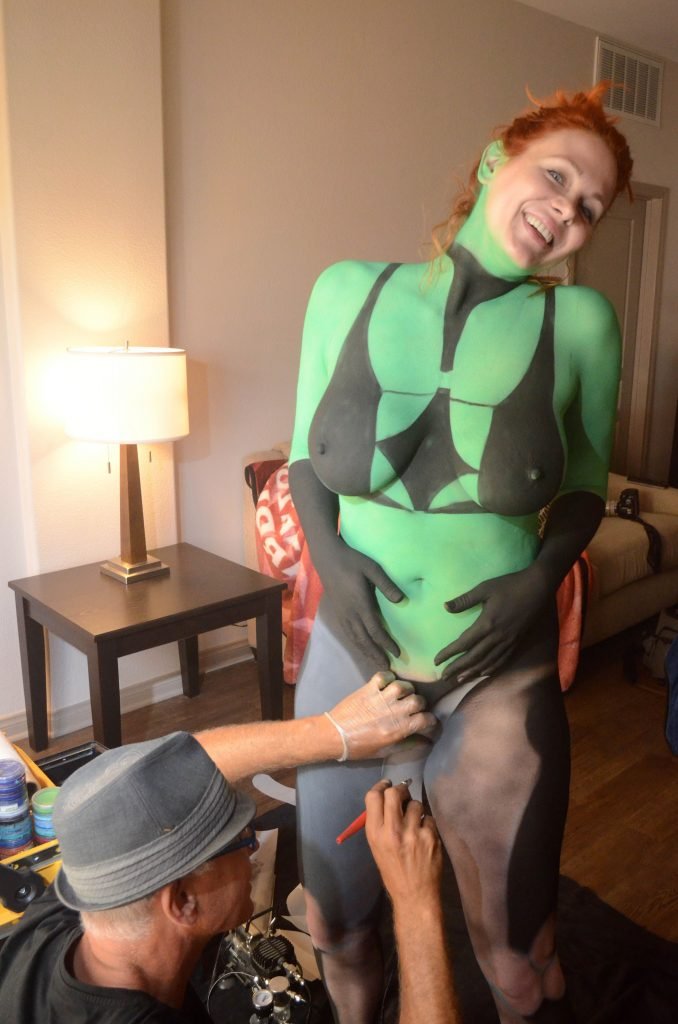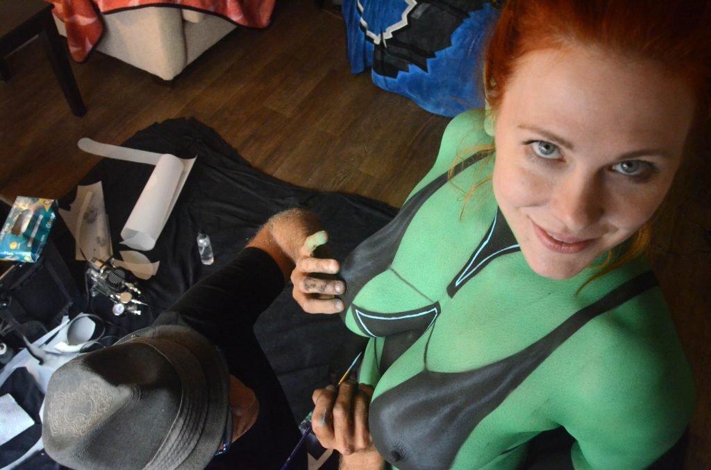 Maitland Ward tem seu personagem personalizado chamado “Vetra” pintado em seu corpo nu pelo artista de aerografia Luciano Paesani antes de sair para o centro de San Diego para a San Diego Comic-Con, 21/07/2017.