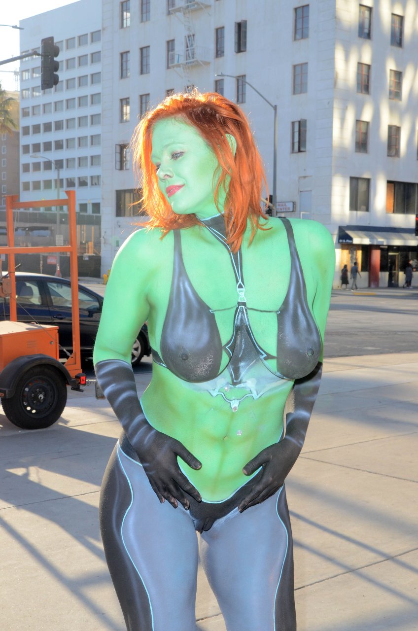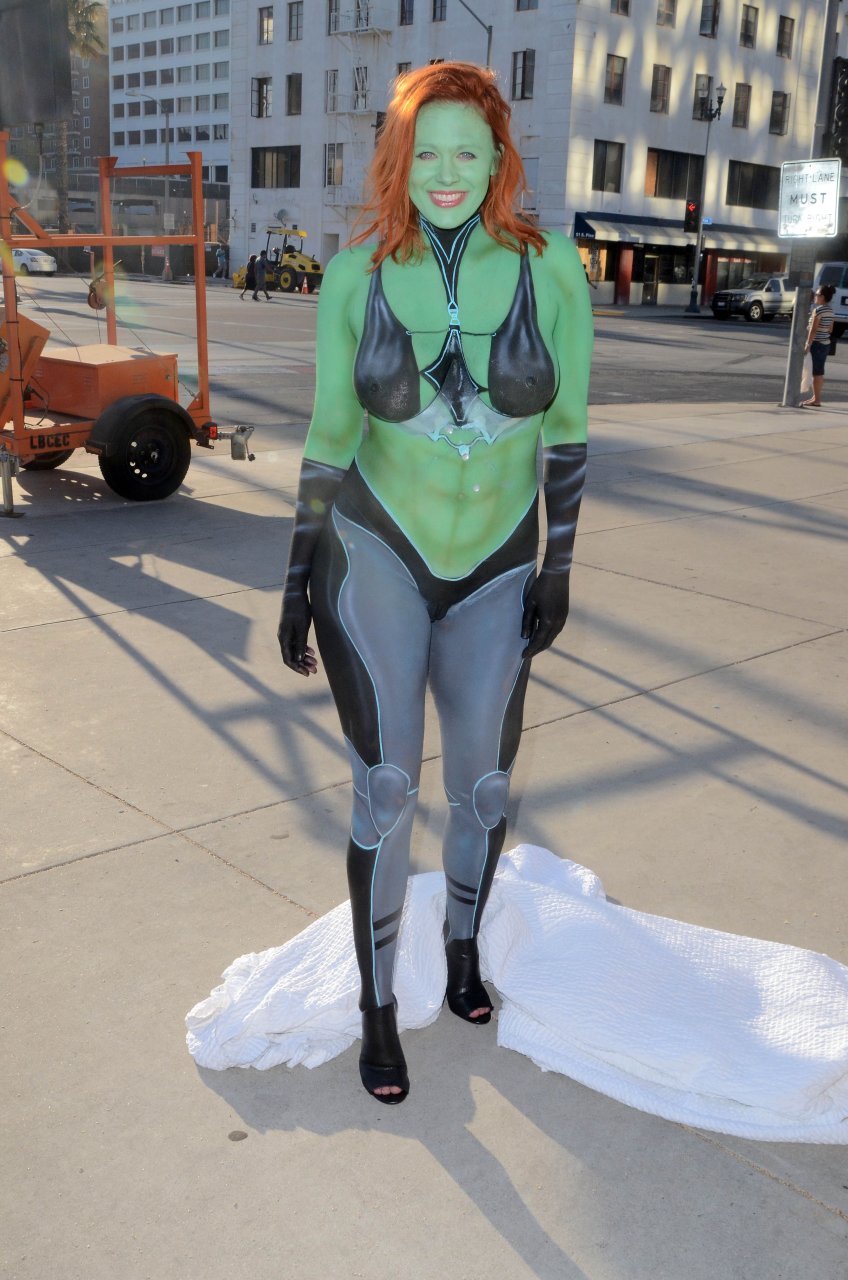 Se ela é provocante ou não, se é 'cosplayer' ou fashionista ou não, há um fato incontestável... essa mulher nunca seria permitida perto da Comic Con com essa 'roupa'. Embora as pessoas lá sejam bastante permissivas quanto às roupas que as pessoas usam, são bastante rígidas (sem trocadilhos) quando se trata de nudez. Adrianne Curry, que tem muito mais credibilidade na comunidade de cosplay e Comic Con, foi avisada para se cobrir ou sair há alguns anos por usar o que basicamente eram shorts curtíssimos. Além do fato de que isto é obviamente pintura corporal—quer dizer, vamos, seus mamilos e lábios são visíveis—ela não entraria em nenhuma das salas. A Comic Con tem uma mistura justa de sensualidade (eu já estive lá e há bastante pele visível, embora não nudez). Isso está além do que alguém acharia remotamente aceitável.