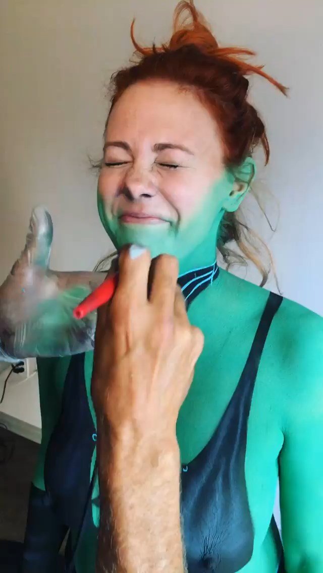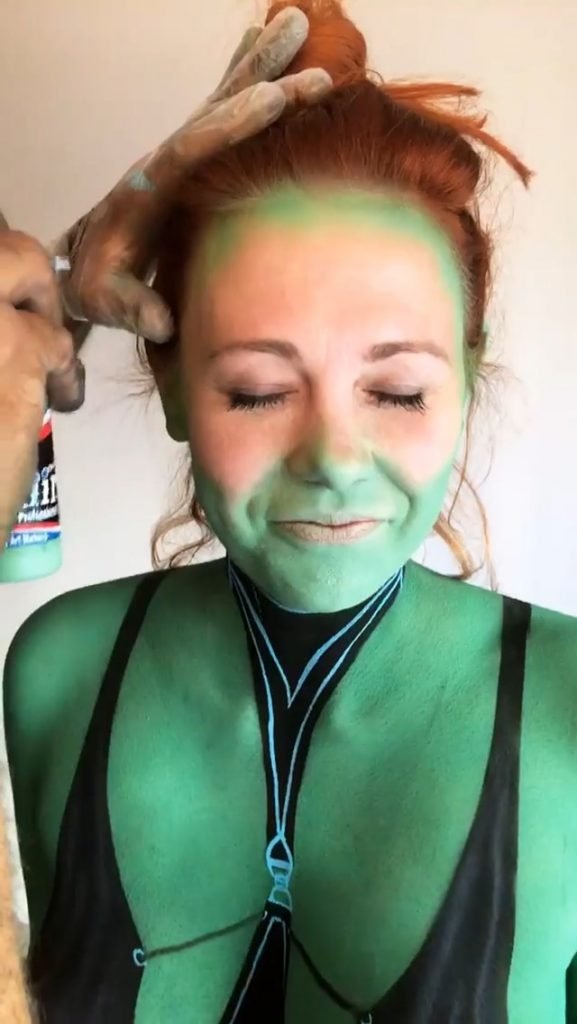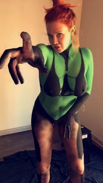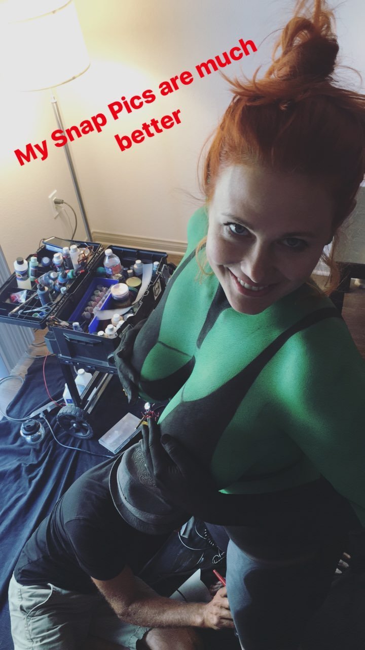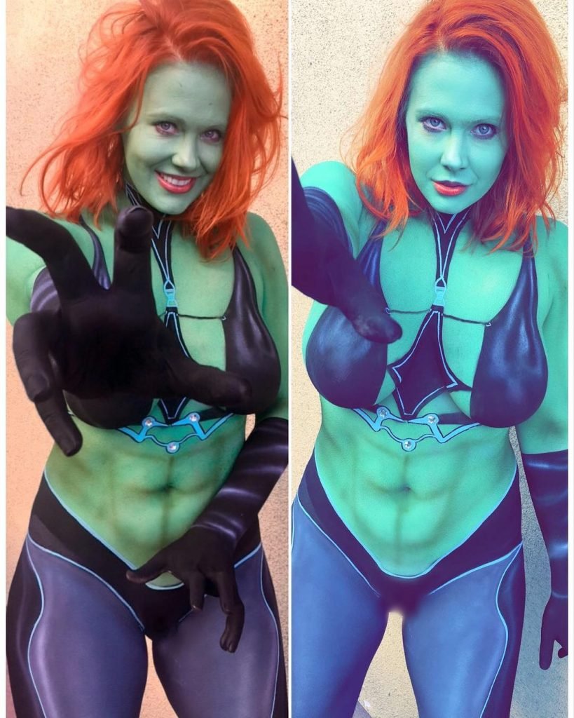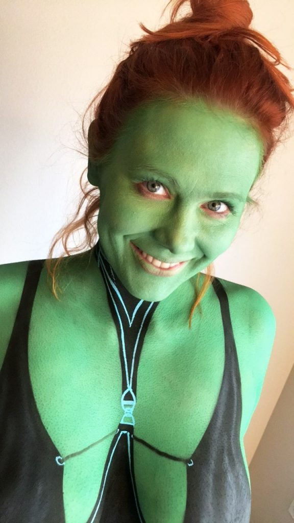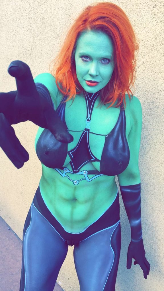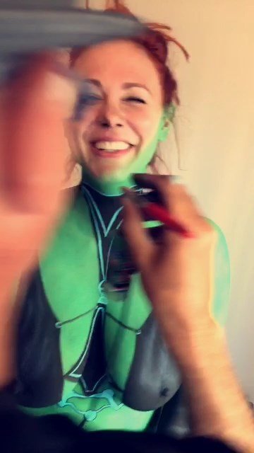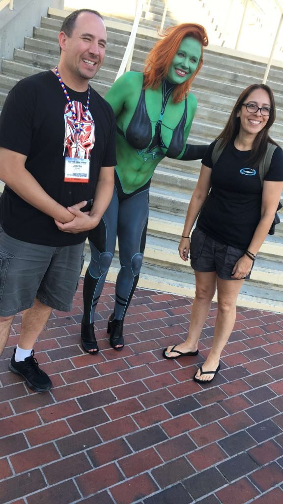 Adoro quando ela vai à Comic Con pintada no corpo. Oh meu, será que é aquele seu glorioso bolo careca por trás desse sorriso?