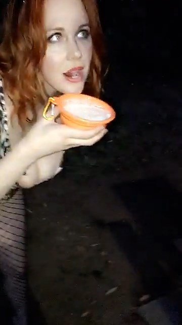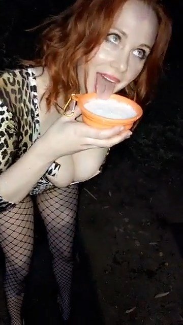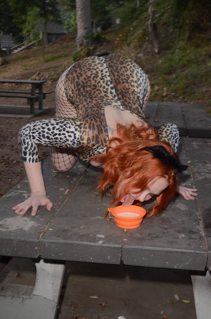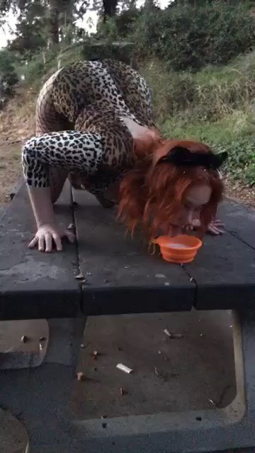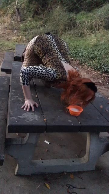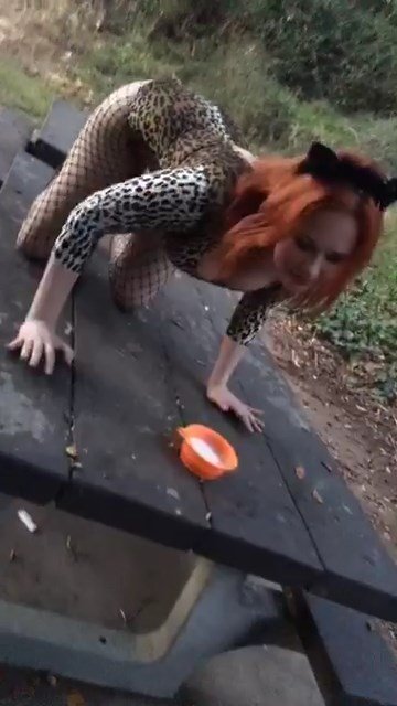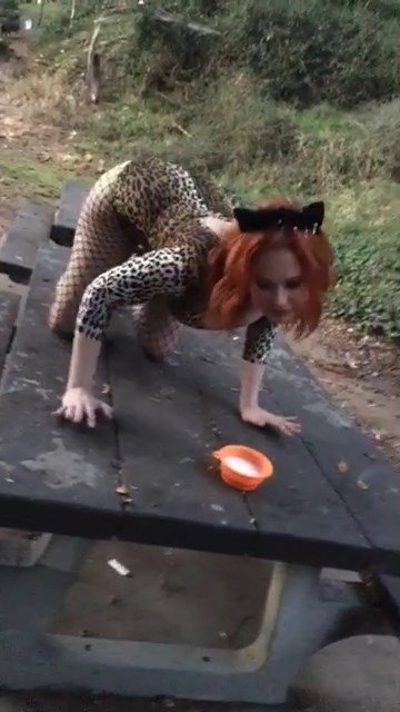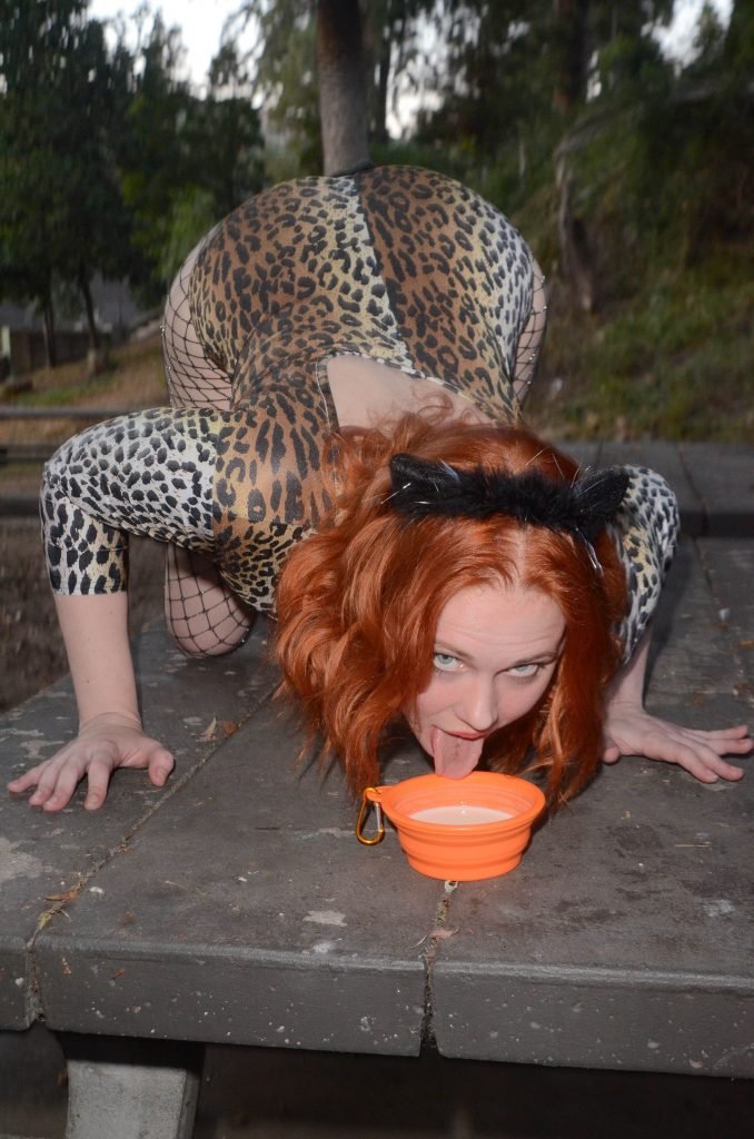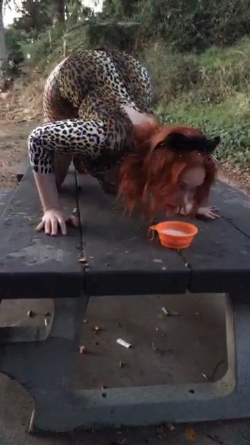 40 anos, bebendo leite de uma tigela que parece suja em uma mesa de piquenique de parque ruim, vestida com uma fantasia de gato de loja de dólar.