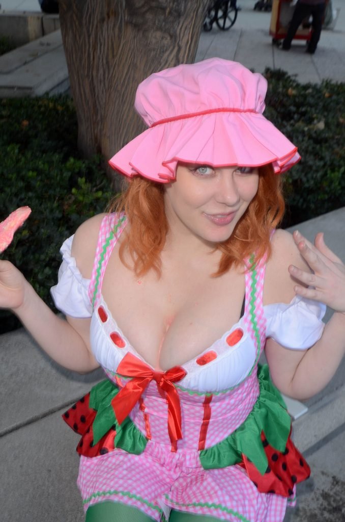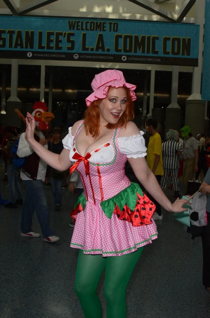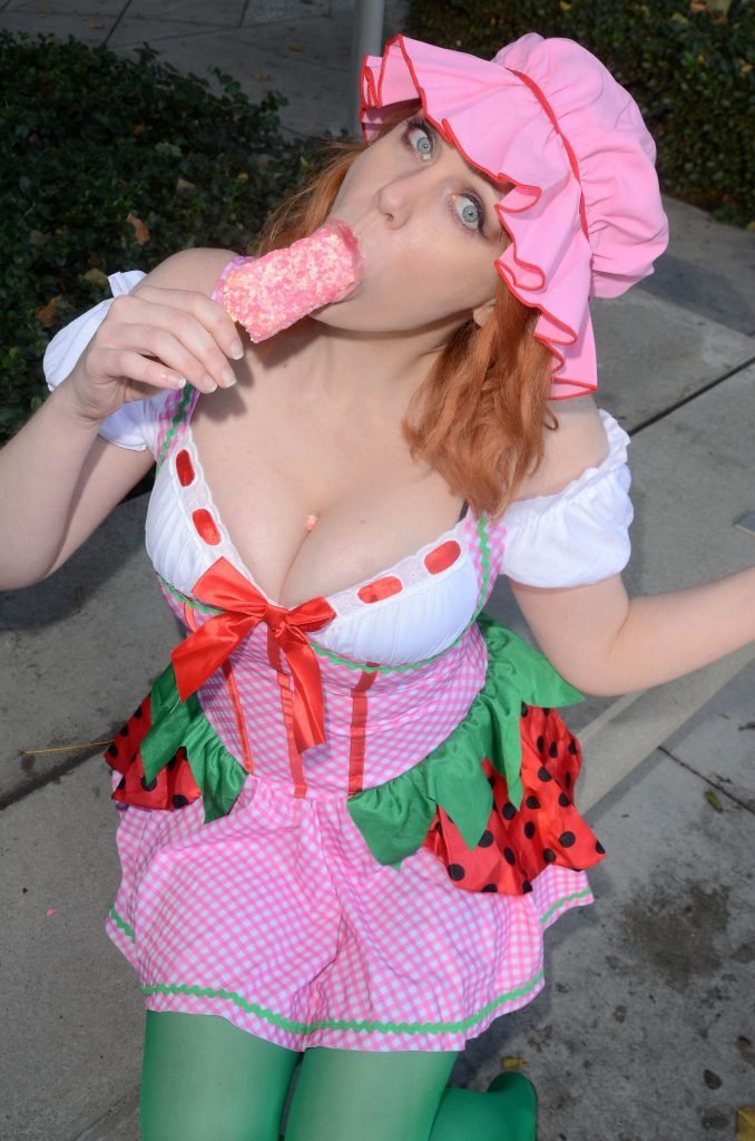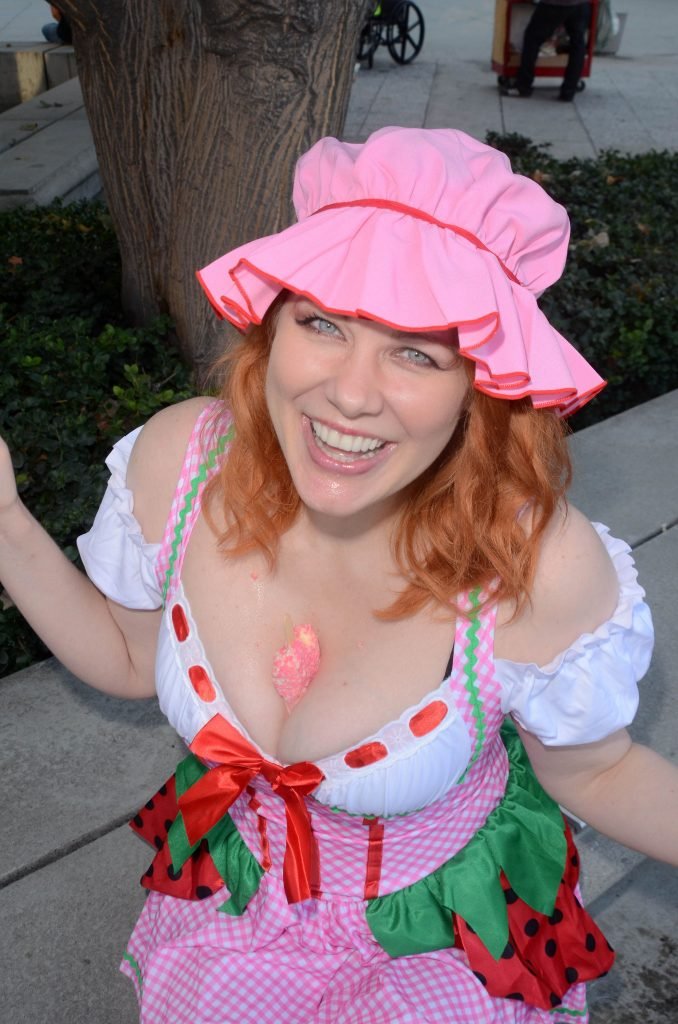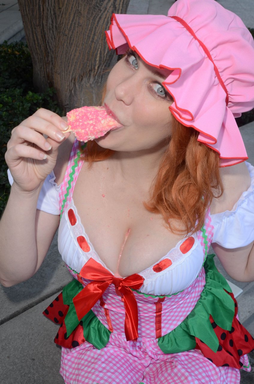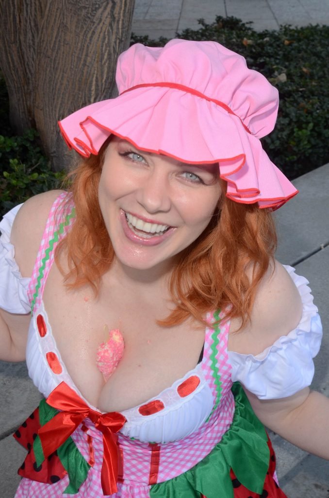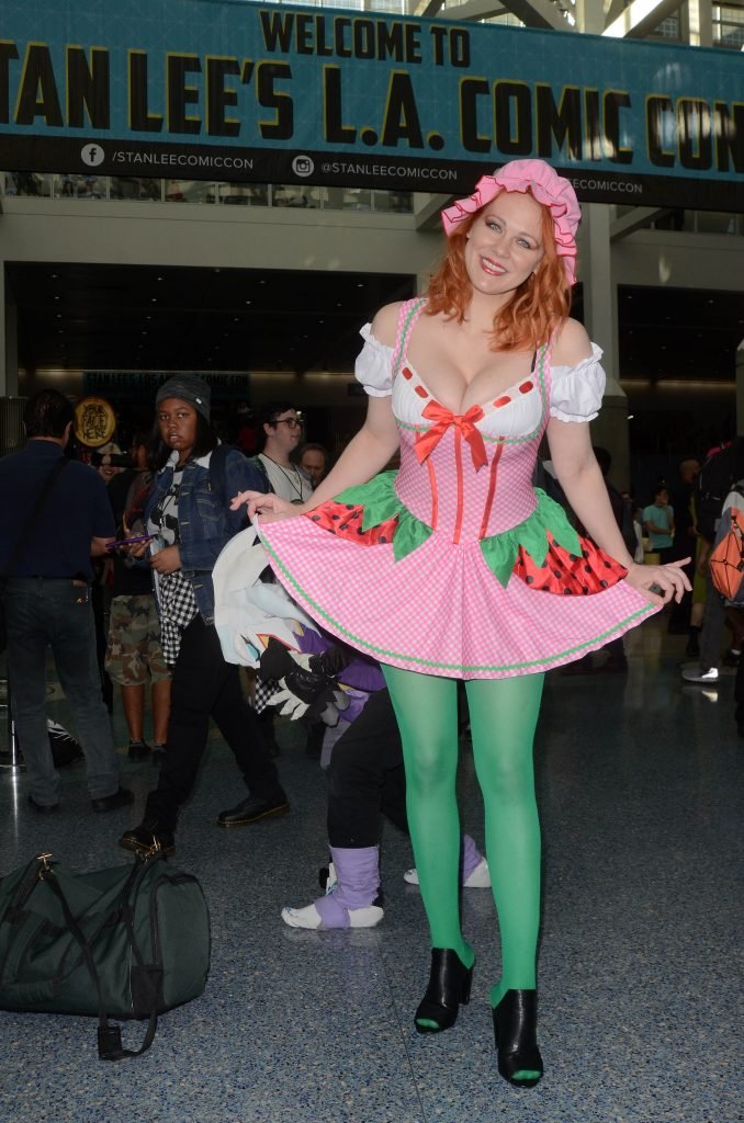 “Boy Meets World” gata Maitland Ward, vestida como “Strawberry Shortcake” na Comic-Con de Los Angeles do Stan Lee, fica bagunçada enquanto come um Sorvete de Strawberry Shortcake, 28/10/2017.