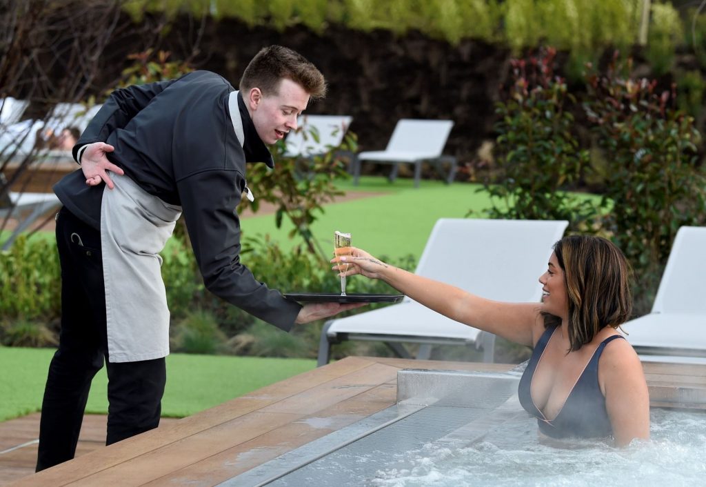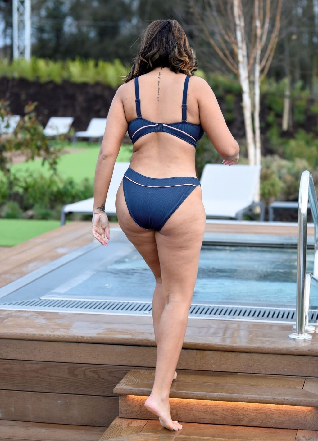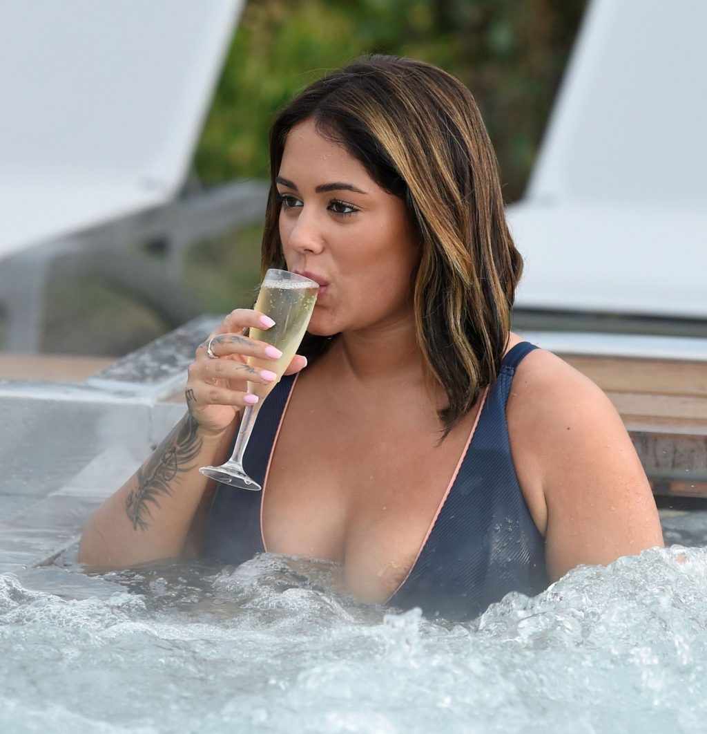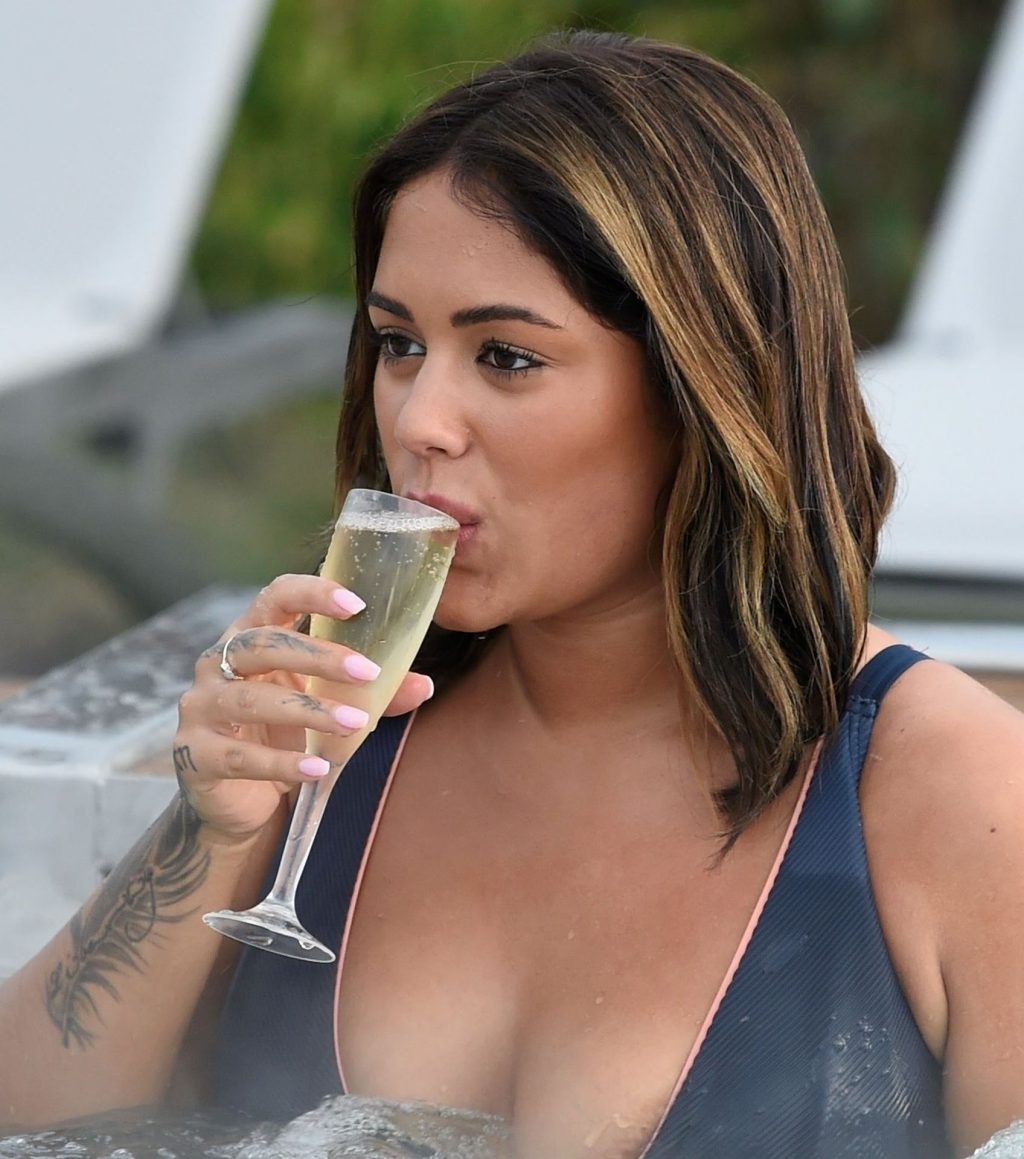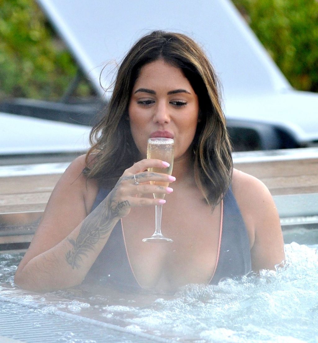 Mostrando sua figura incrível em seu conjunto de biquíni azul, a ex-estrela de Love Island Malin Andersson aproveita uma bebida espumante durante seu dia de mimos no spa Carden Park em Chester, 02/09/2020.