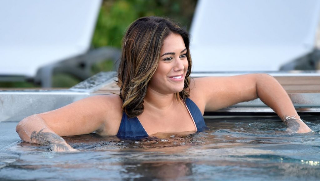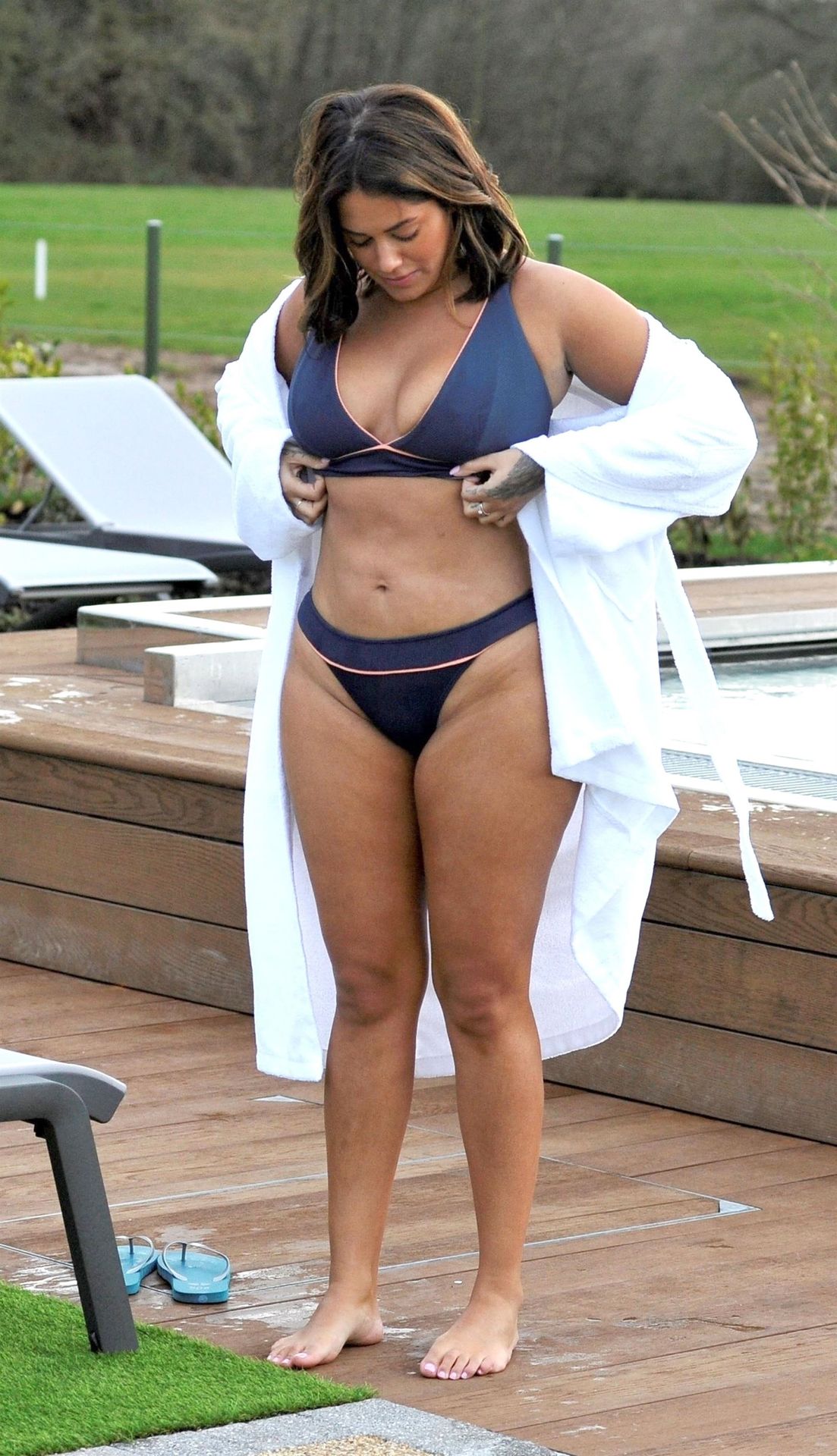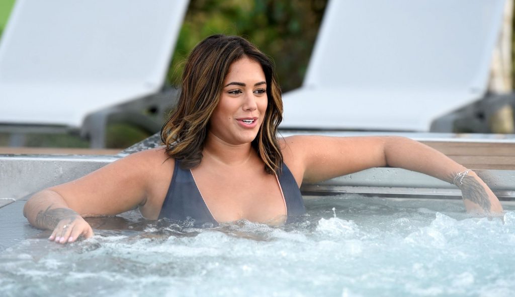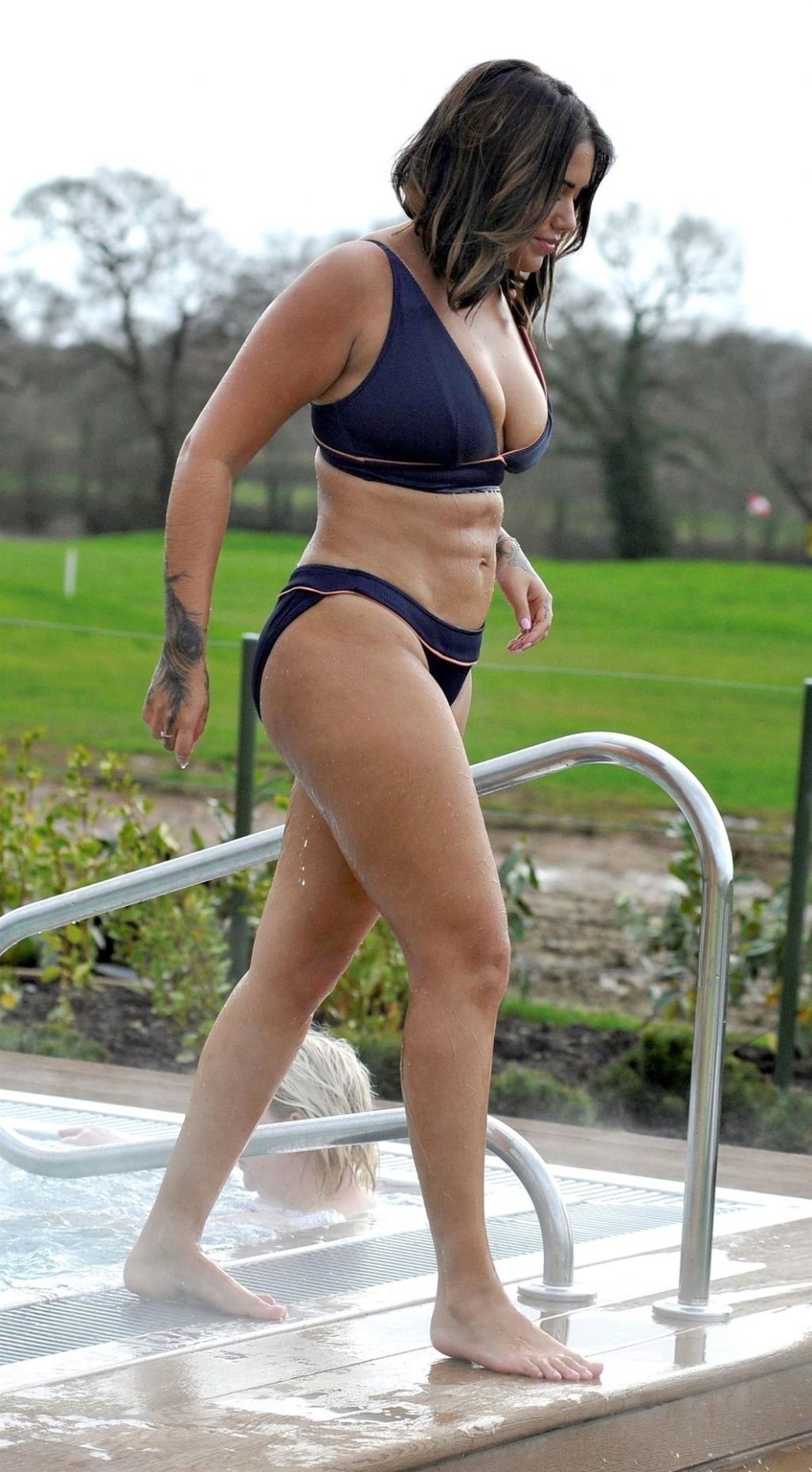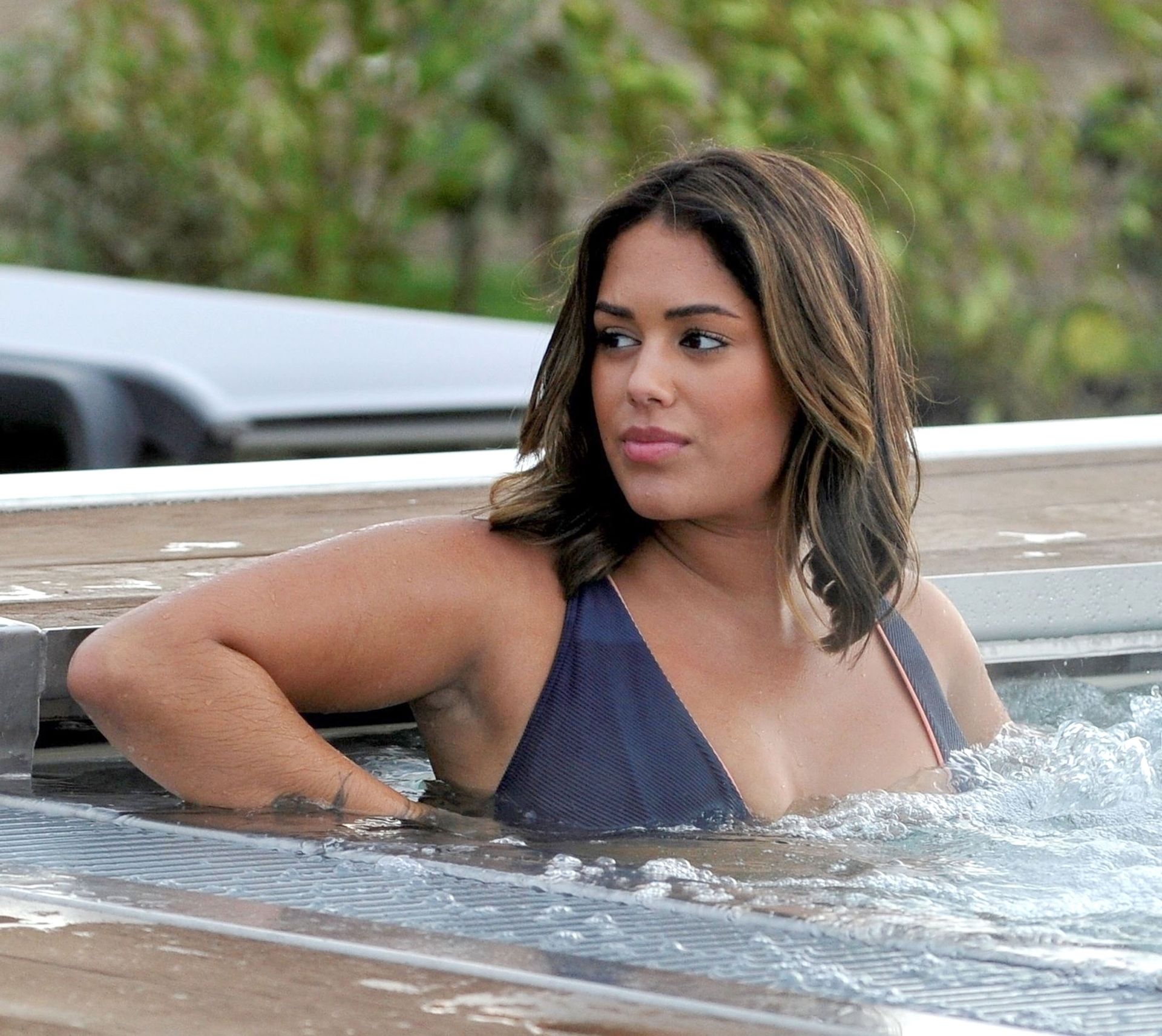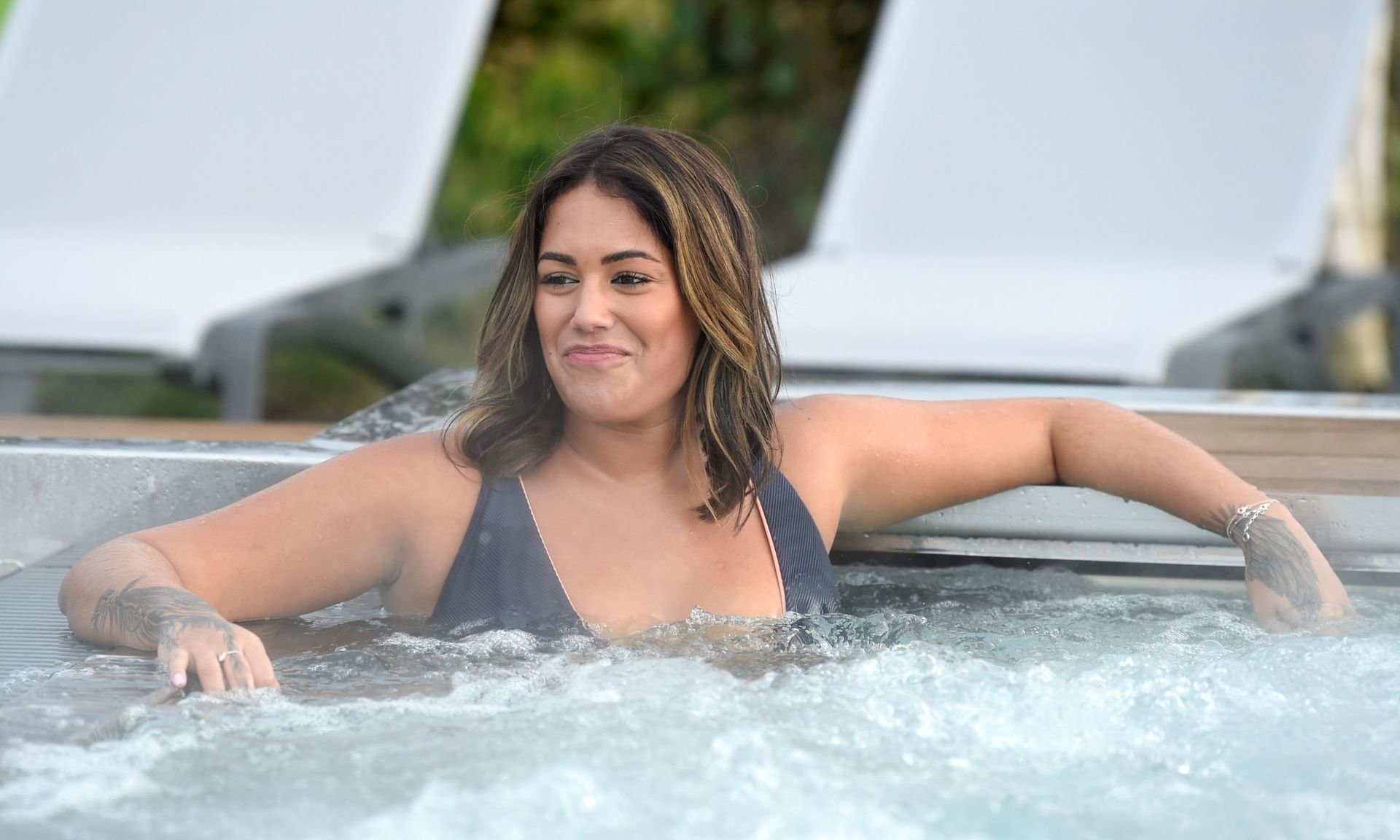 Mostrando sua figura incrível em seu conjunto de biquíni azul, a ex-estrela de Love Island Malin Andersson aproveita uma bebida espumante durante seu dia de mimos no spa Carden Park em Chester, 02/09/2020.