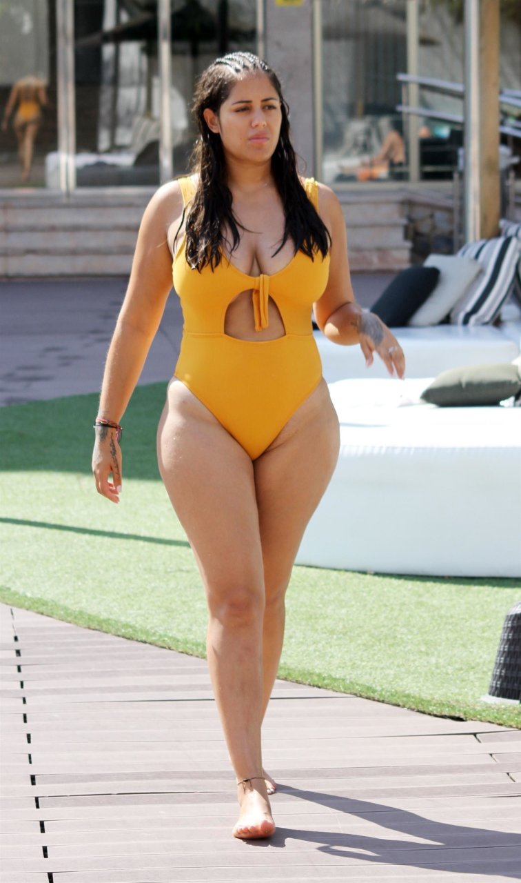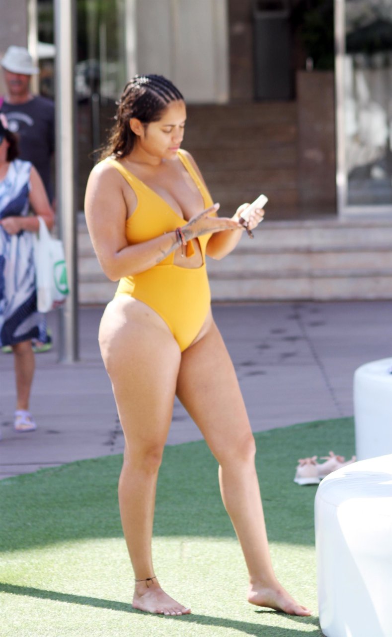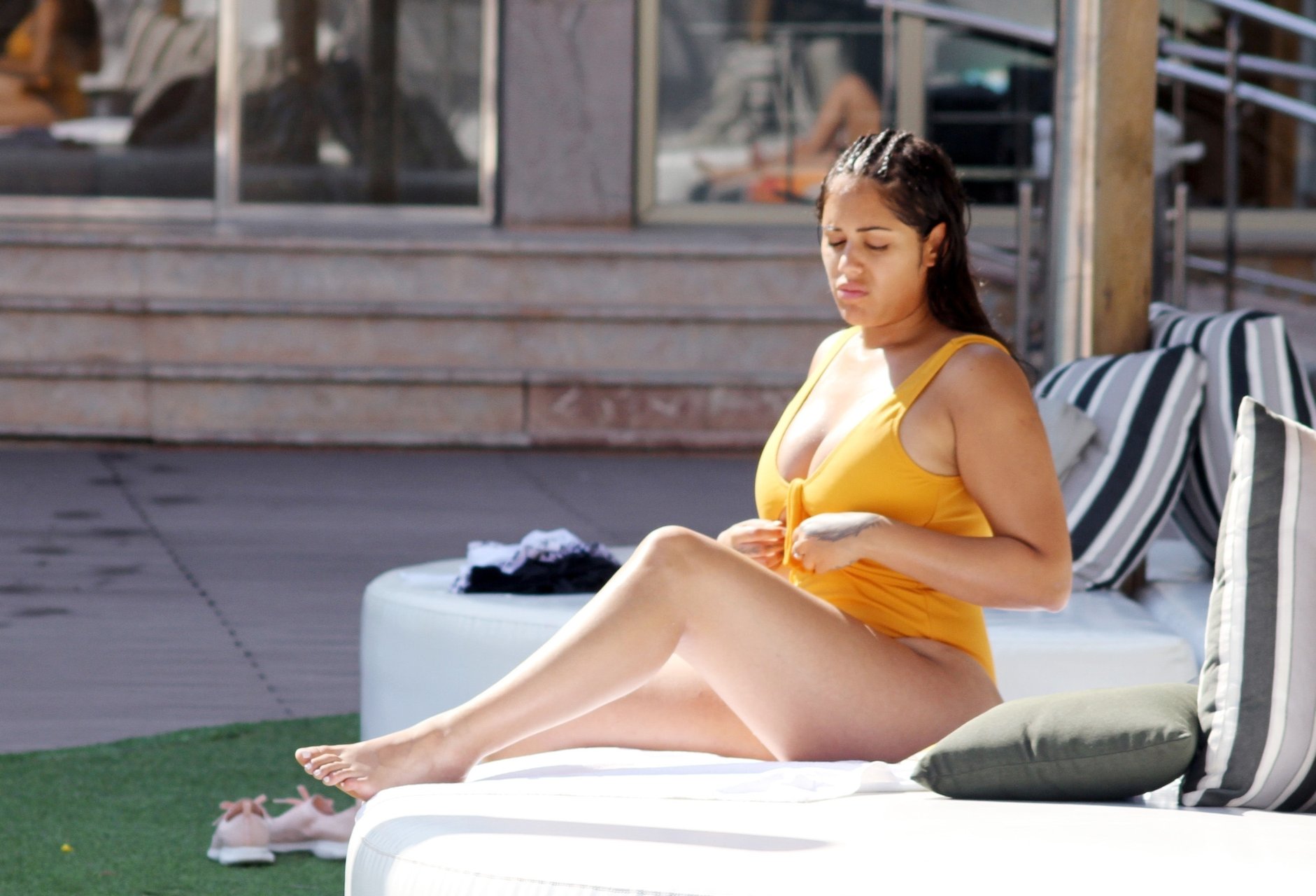 A ex-estrela de “Love Island” Malin Andersson foi fotografada aproveitando o sol e mostrando o decote em seu maiô amarelo mostarda enquanto estava de férias em Mallorca, 09/03/2018. Malin, que anunciou recentemente que está grávida, exibe sua barriga de grávida e seu levantamento de seios e bumbum 7k. Malin foi nadar e depois aplicou protetor solar antes de tomar sol à beira da piscina.