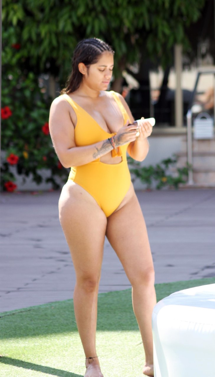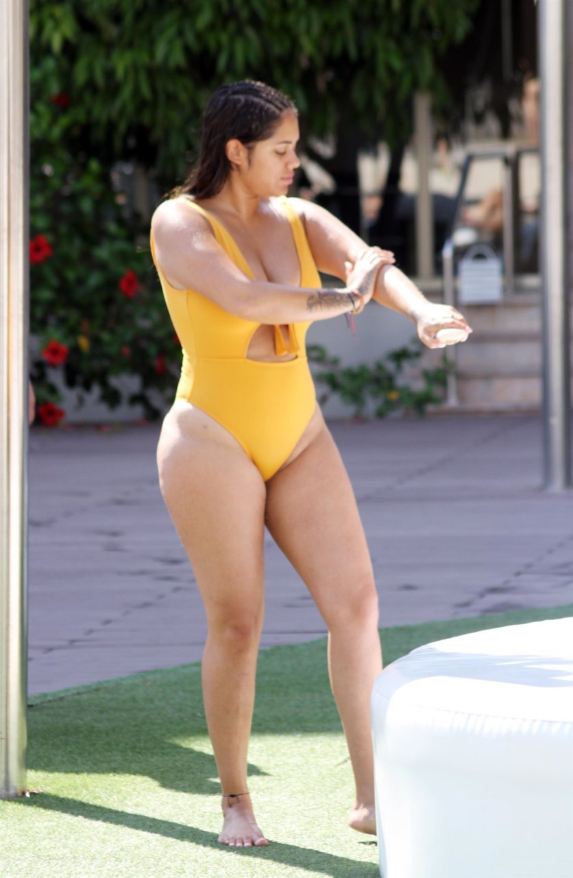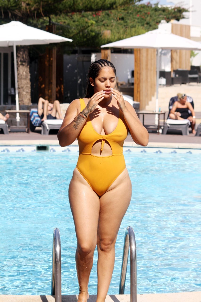 A ex-estrela de “Love Island” Malin Andersson foi fotografada aproveitando o sol e mostrando o decote em seu maiô amarelo mostarda enquanto estava de férias em Mallorca, 09/03/2018. Malin, que anunciou recentemente que está grávida, exibe sua barriga de grávida e seu levantamento de seios e bumbum 7k. Malin foi nadar e depois aplicou protetor solar antes de tomar sol à beira da piscina.
