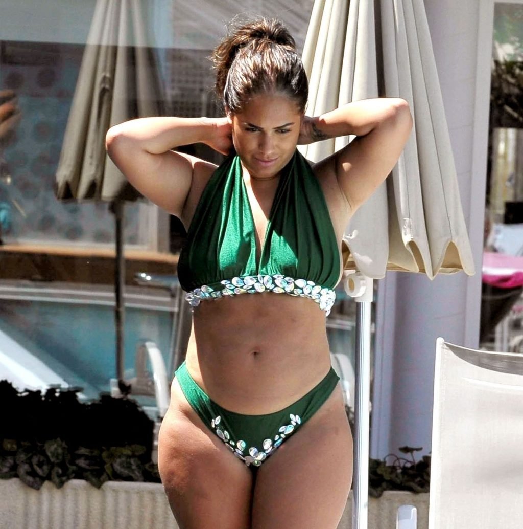 A personalidade de “Love Island” Malin Andersson exibe suas curvas e sideboob com biquíni estilo Green Emerald Mirror Image enquanto está de férias em Ibiza (maio de 2019).