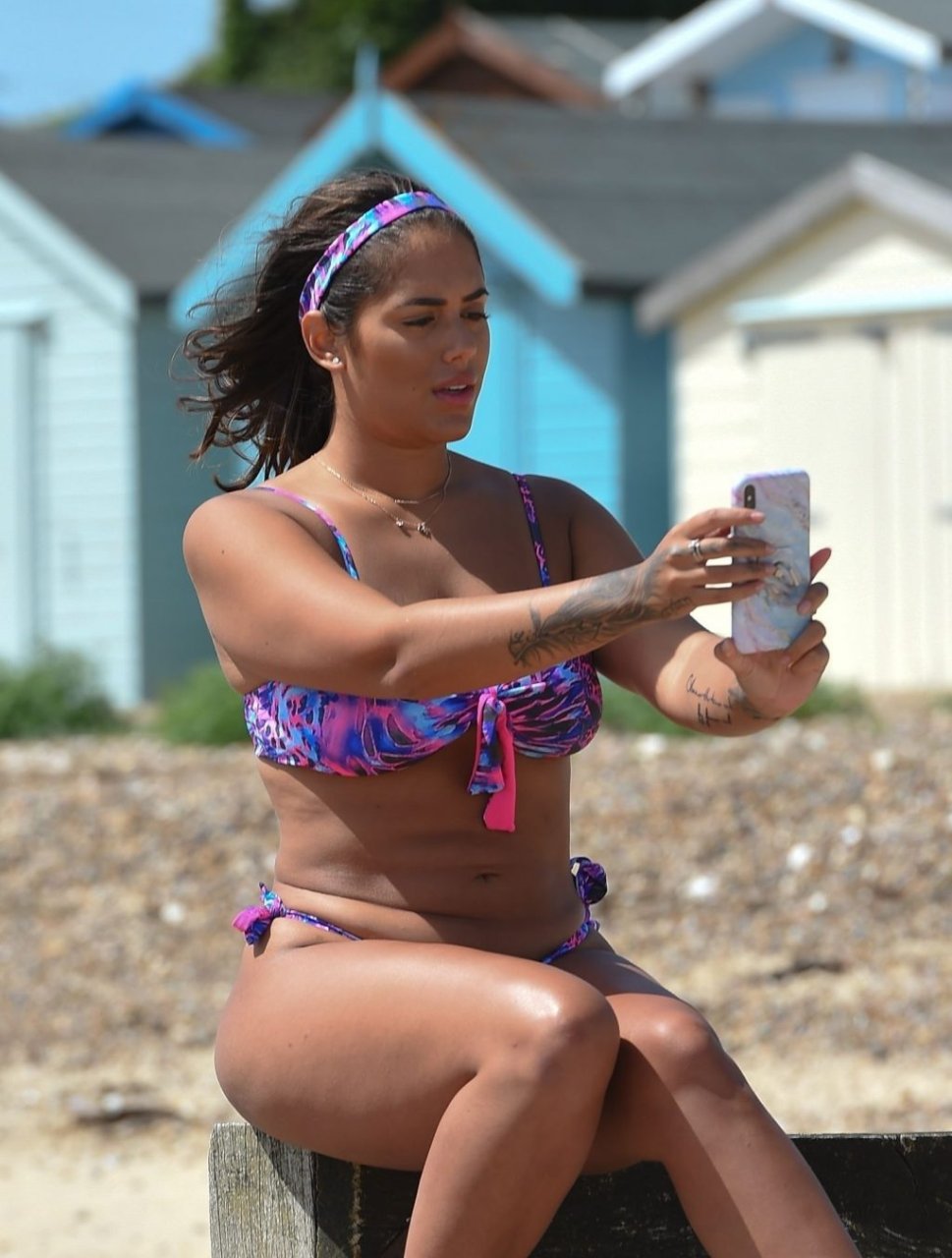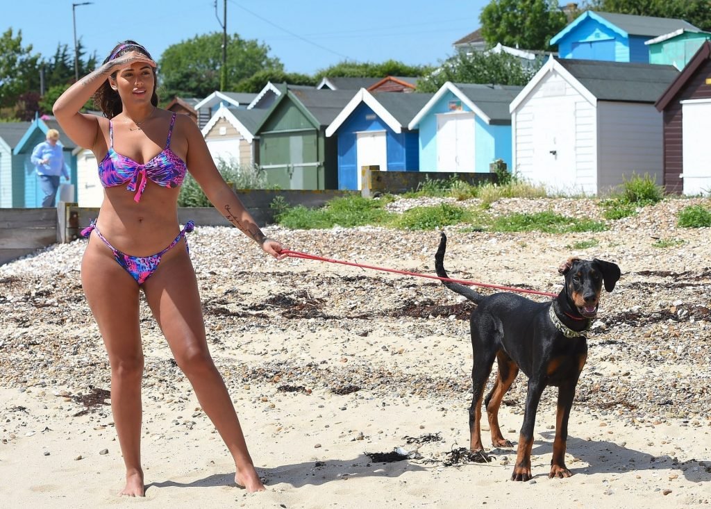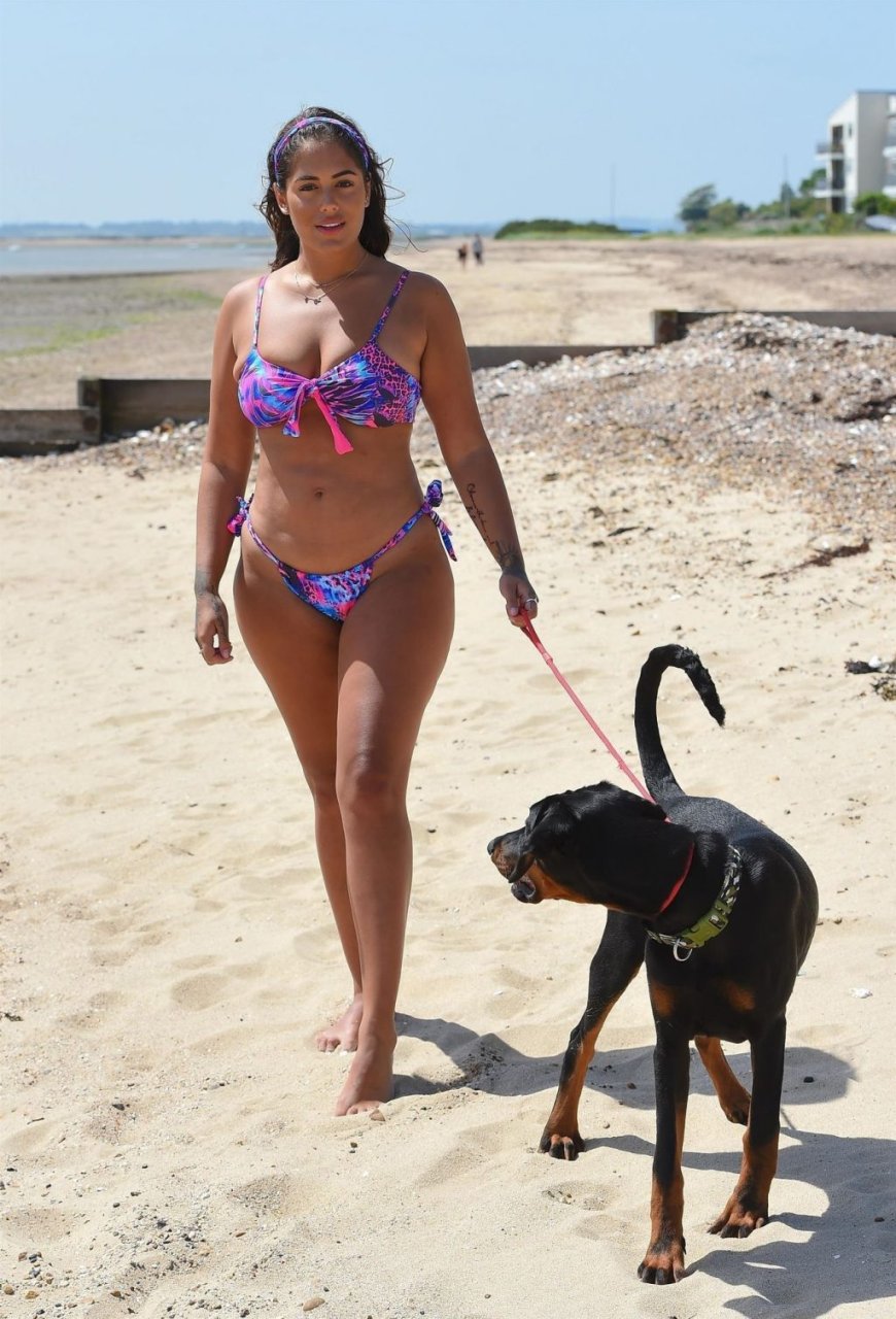 Malin Andersson impressiona com biquíni floral enquanto faz uma pausa de um ensaio fotográfico de confiança corporal em Essex, 29/06/2019. Malin pode ser vista feliz enquanto caminha com um cachorro adorável na praia.