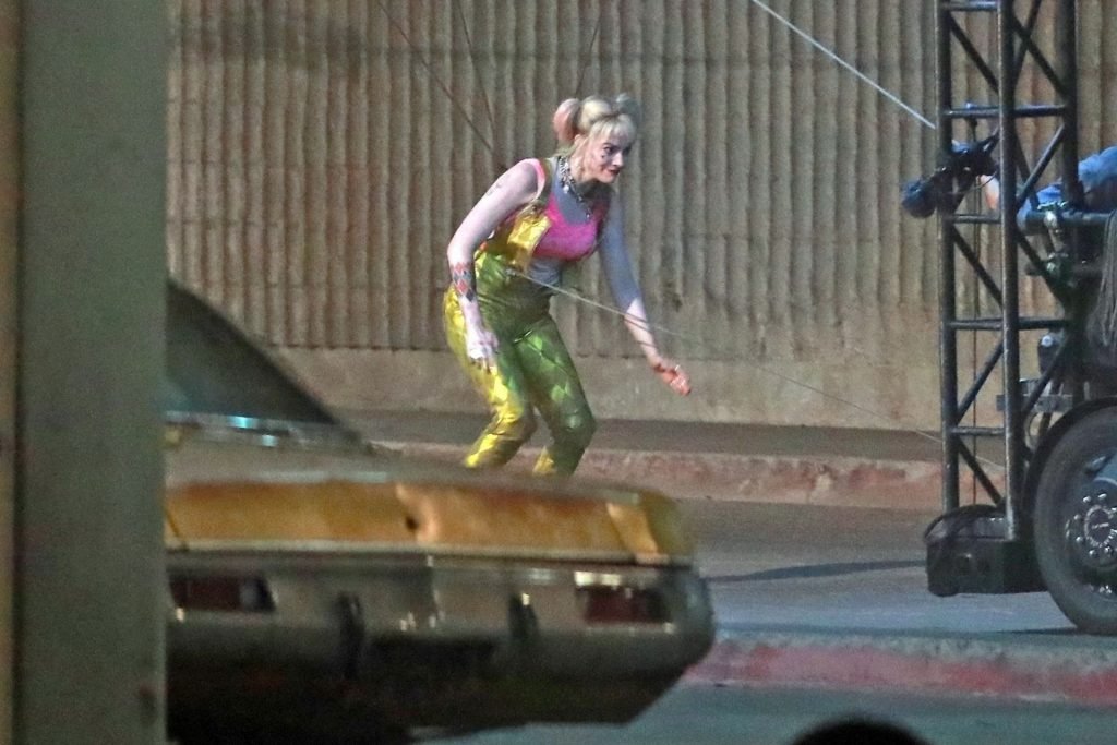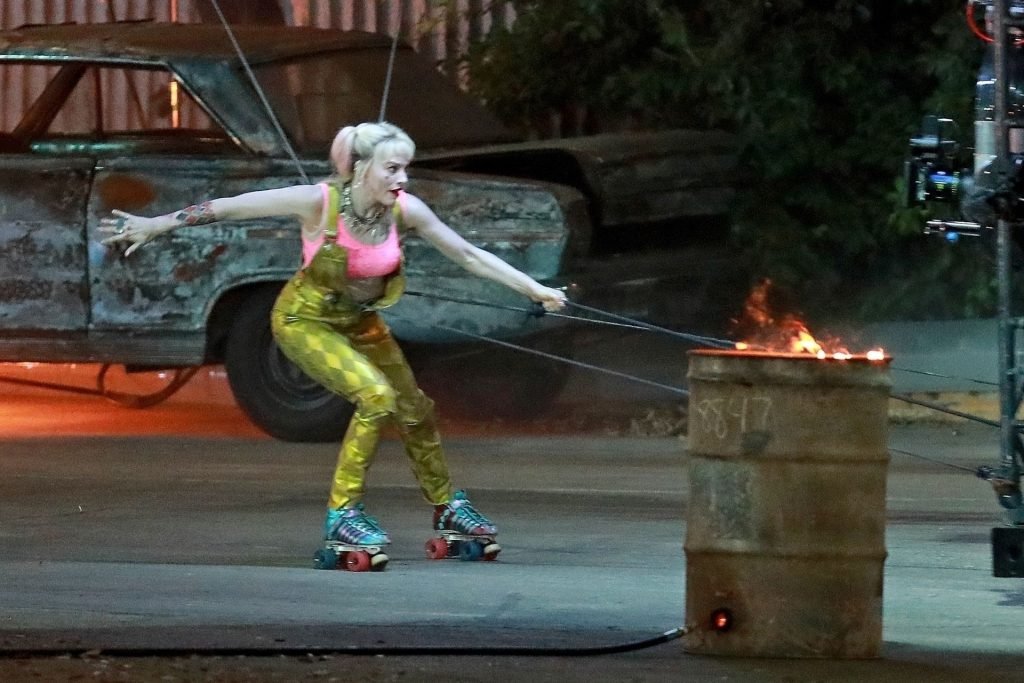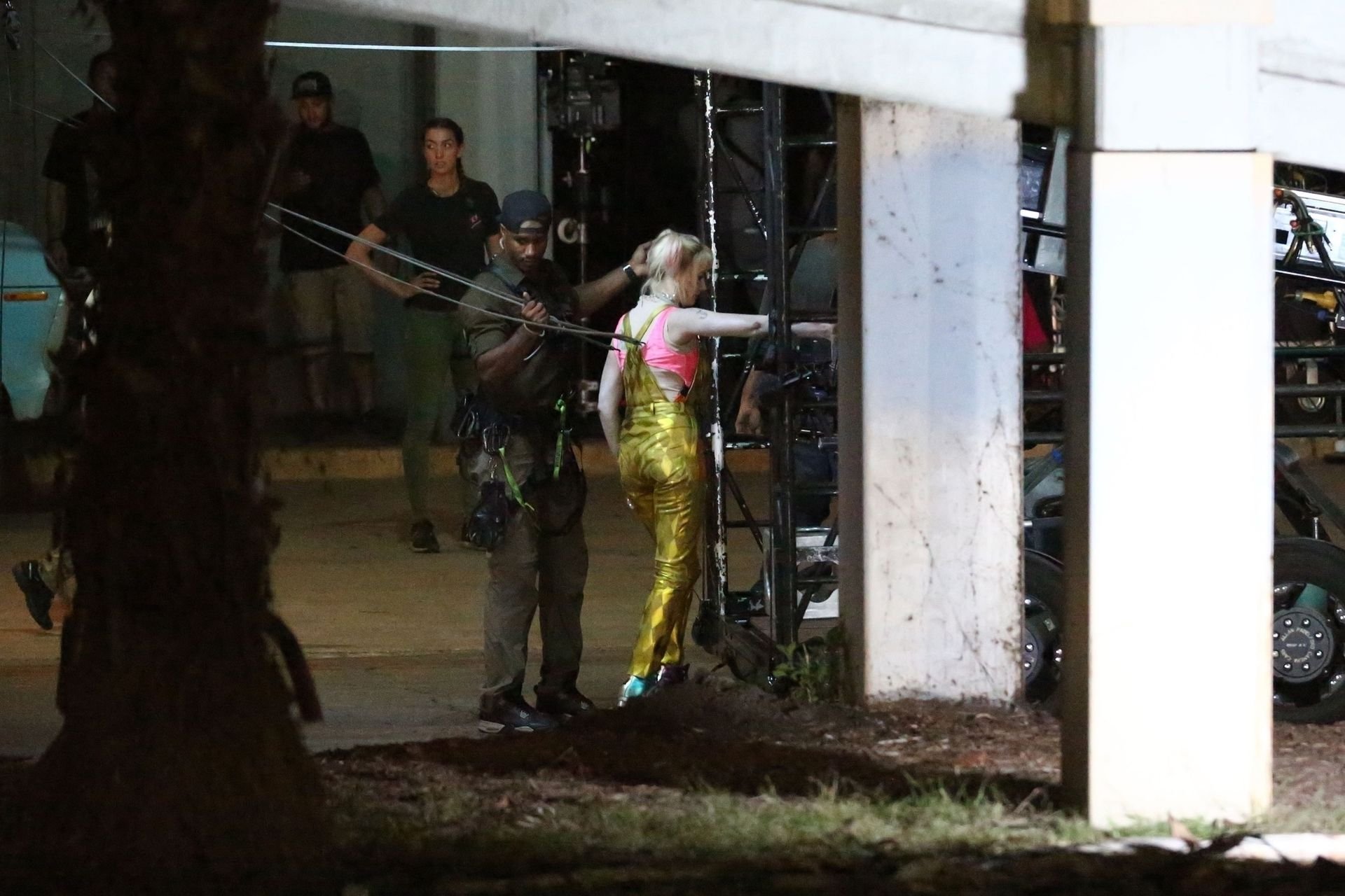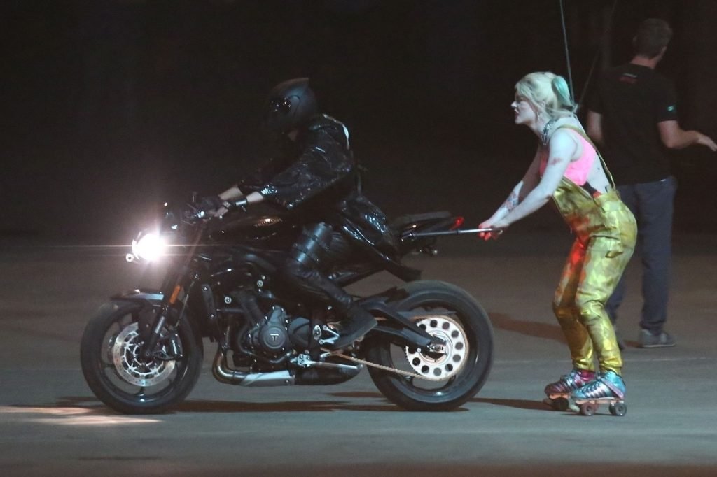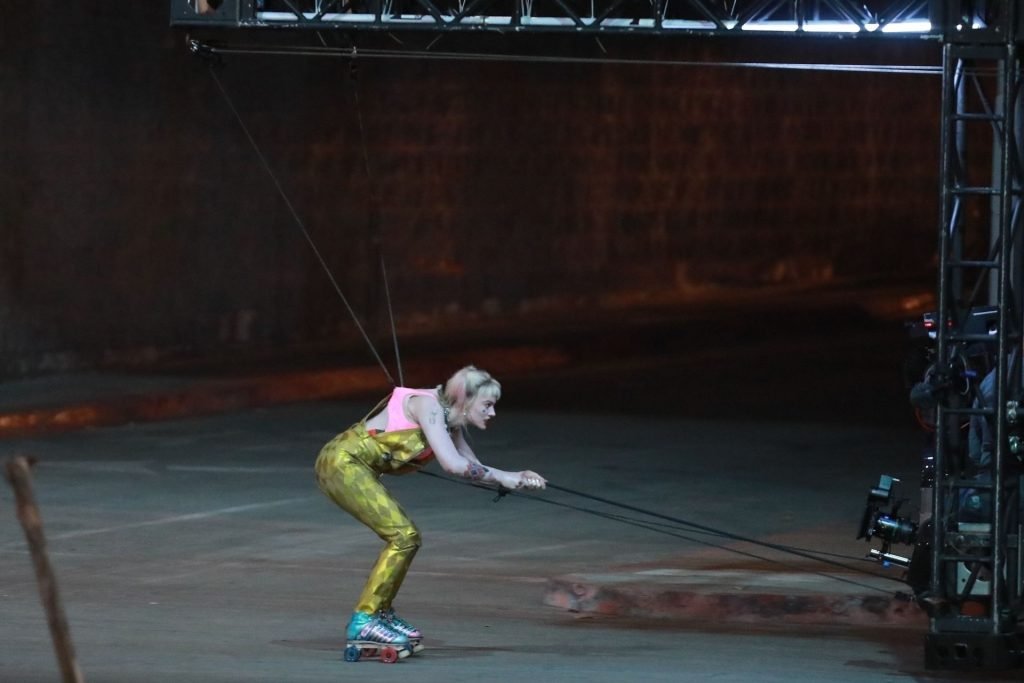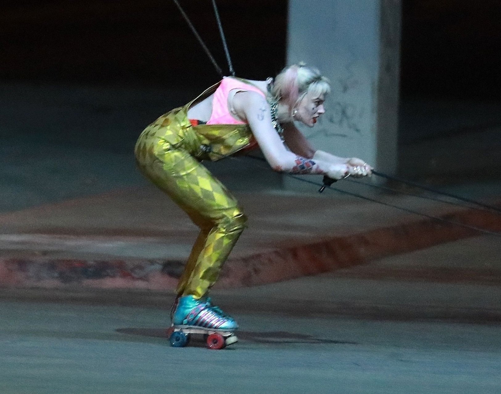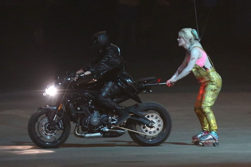Margot Robbie filma uma cena de ação perigosa com a ajuda de um dublê durante uma refilmagem de “Aves de Rapina” em Los Angeles, 05/09/2019.