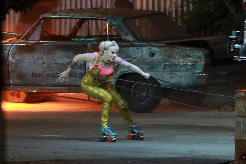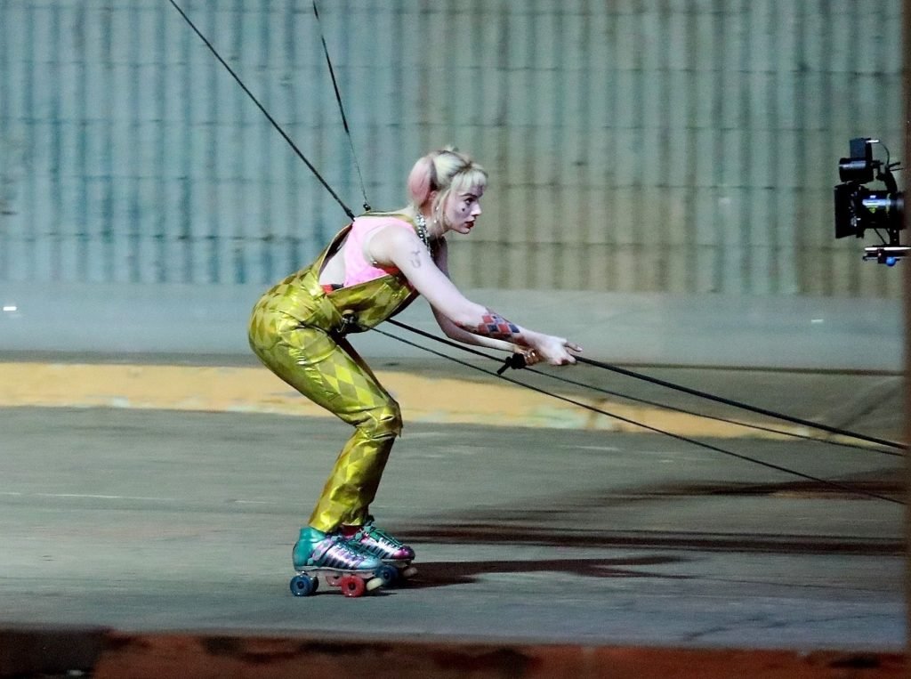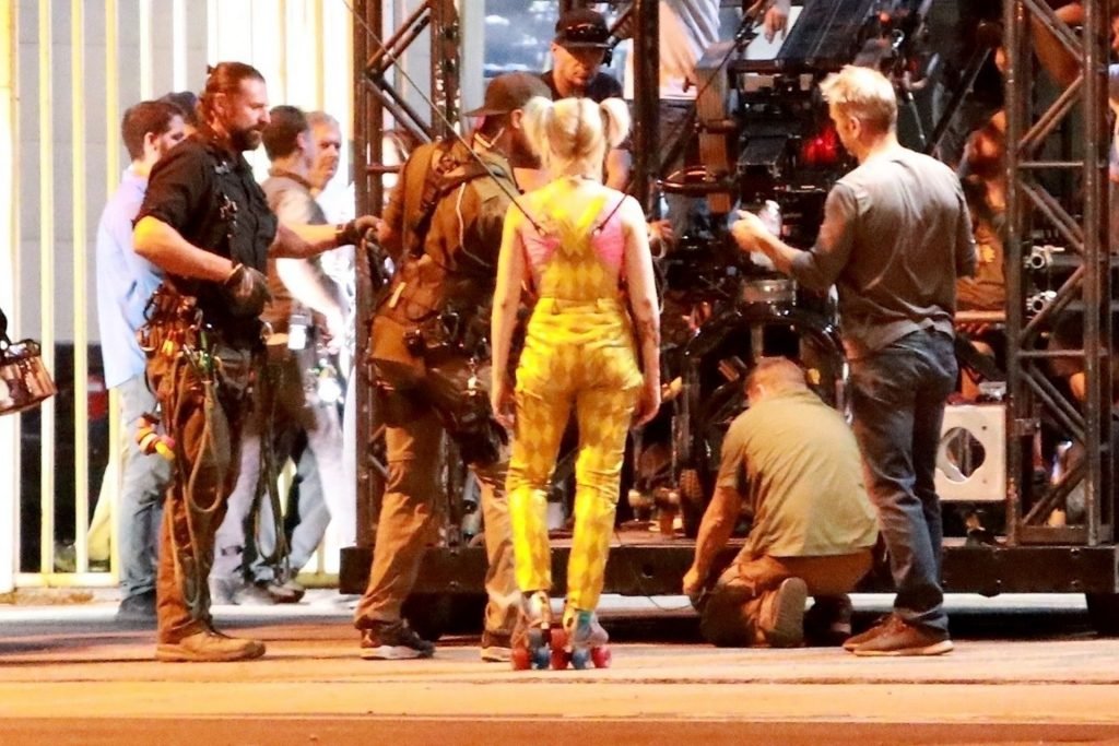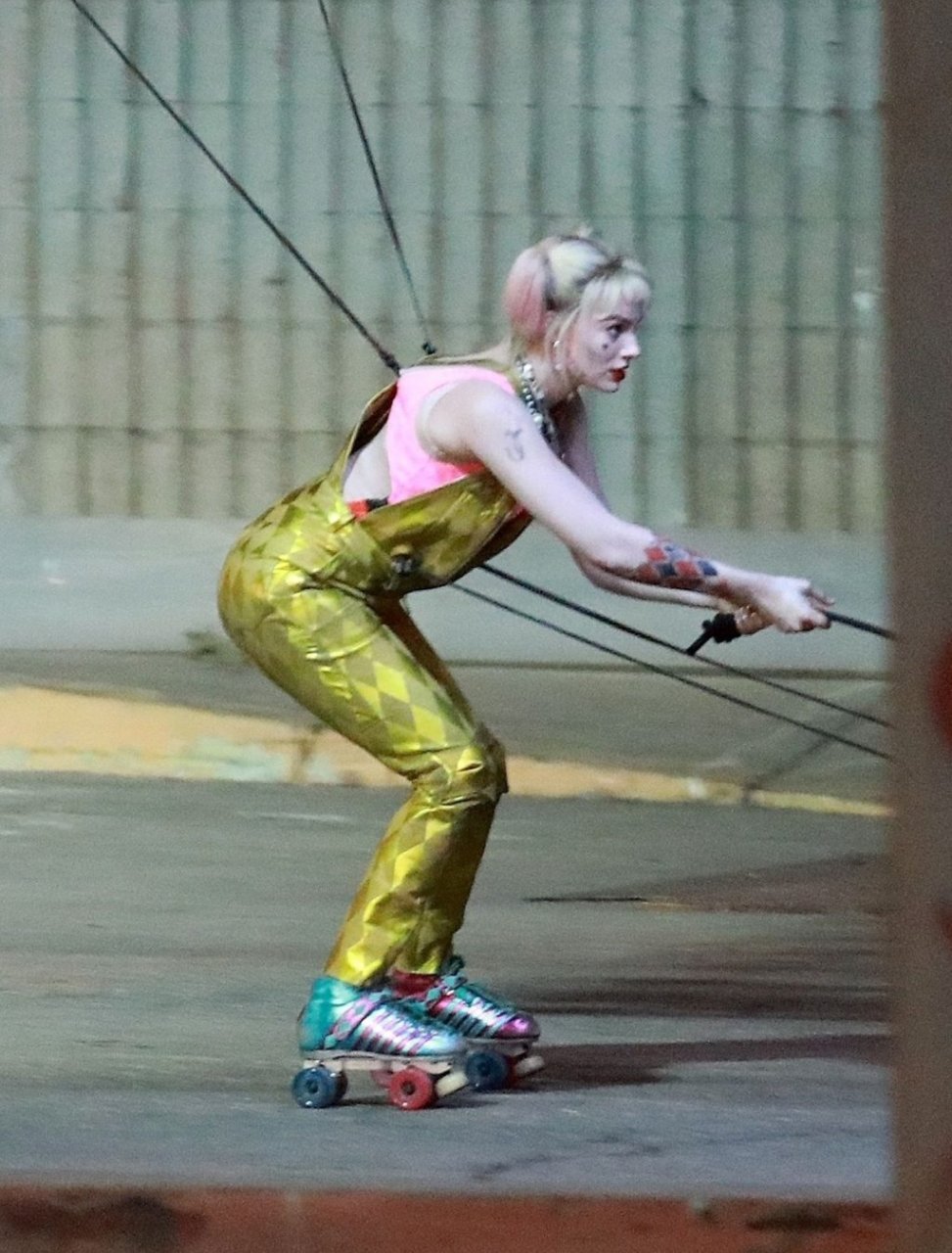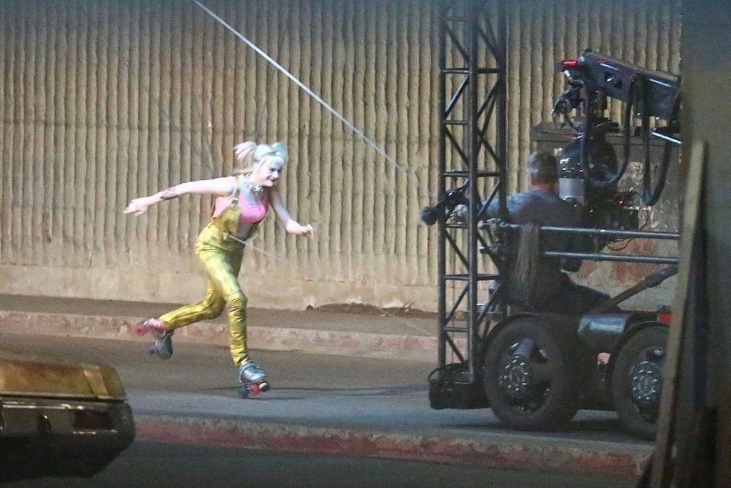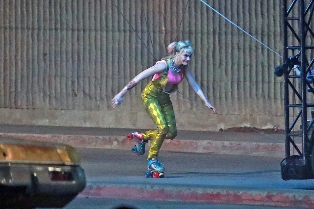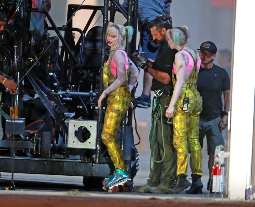 Margot Robbie filma uma cena de ação perigosa com a ajuda de um dublê durante uma refilmagem de “Aves de Rapina” em Los Angeles, 05/09/2019.