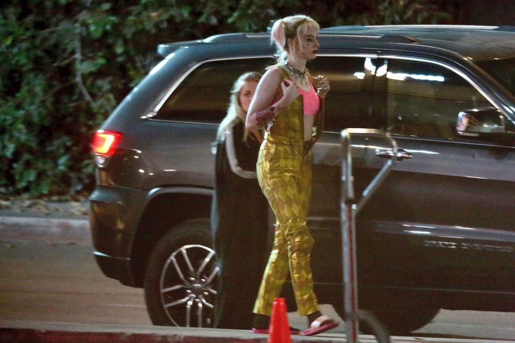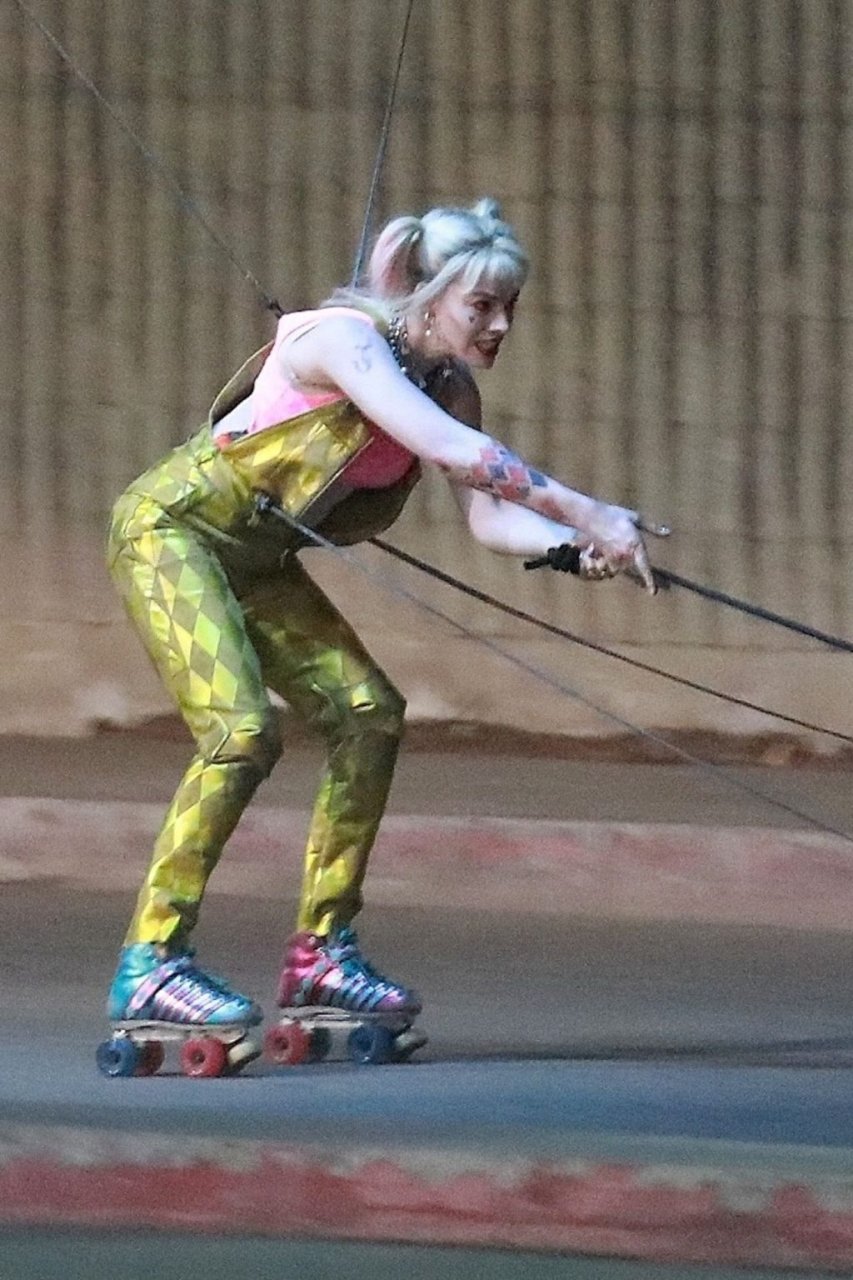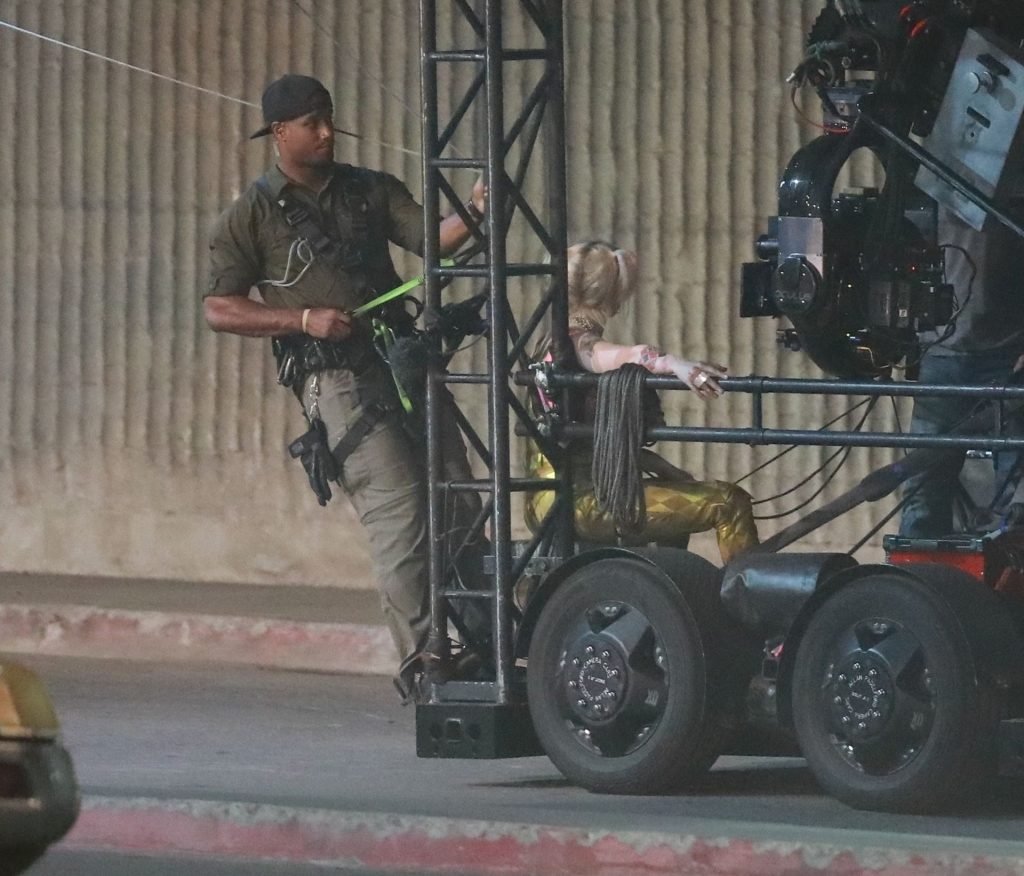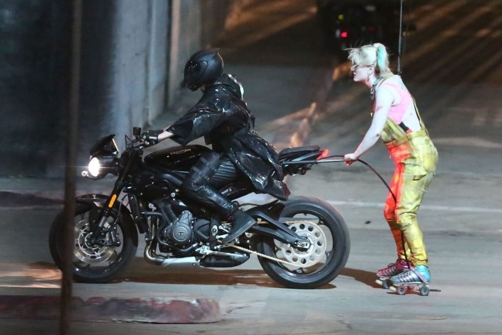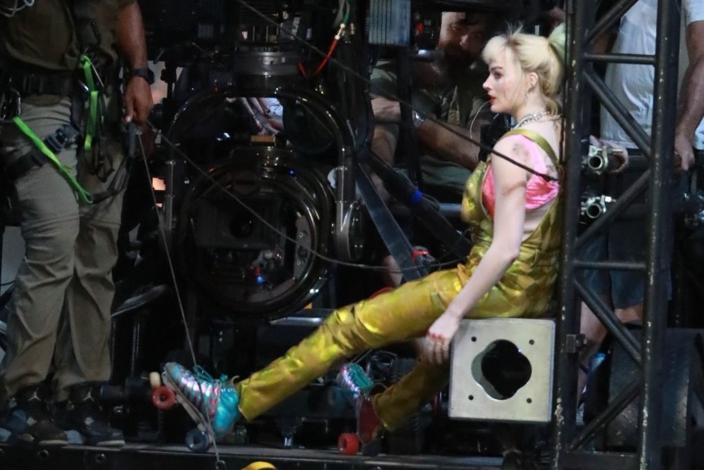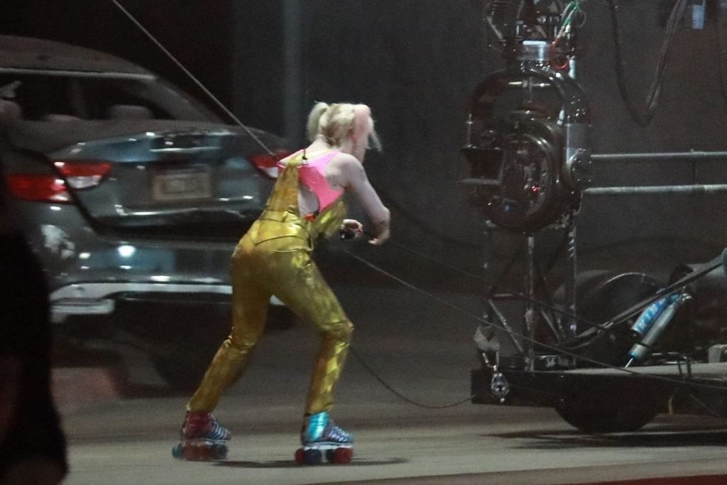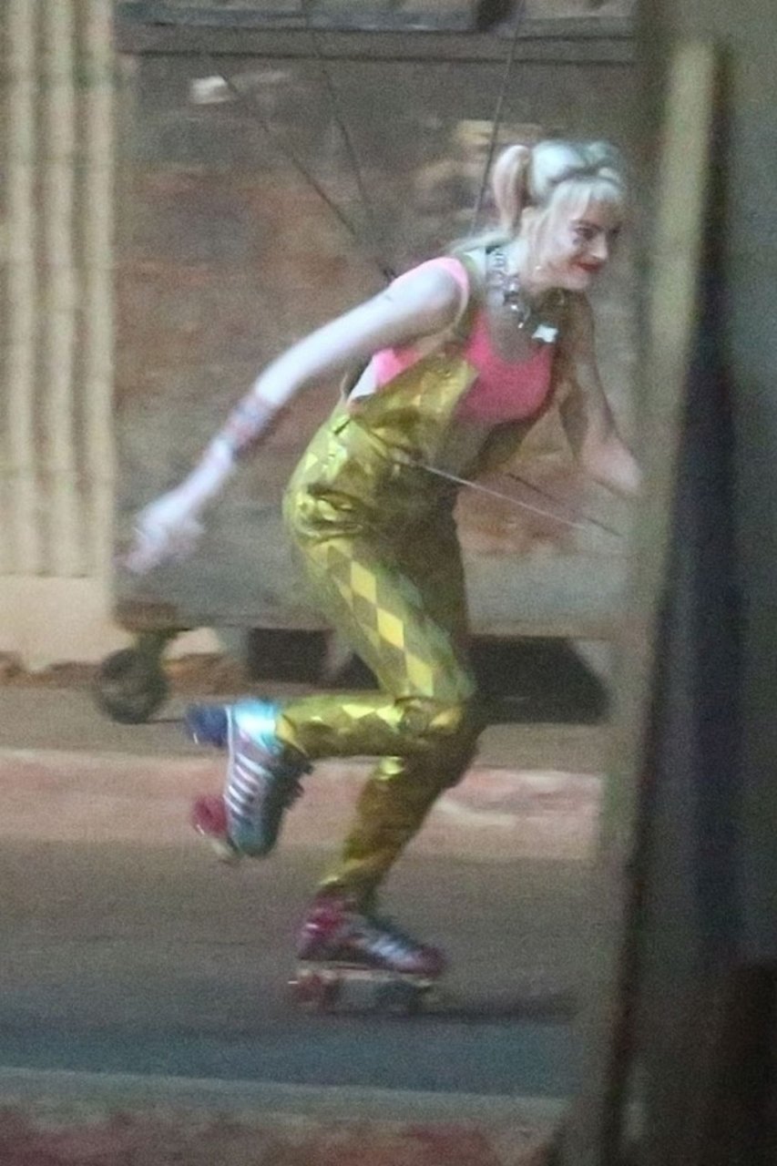 Margot Robbie filma uma cena de ação perigosa com a ajuda de um dublê durante uma refilmagem de “Aves de Rapina” em Los Angeles, 05/09/2019.