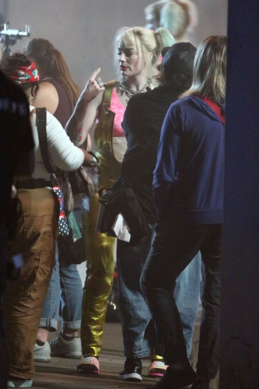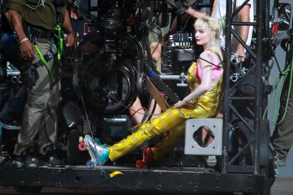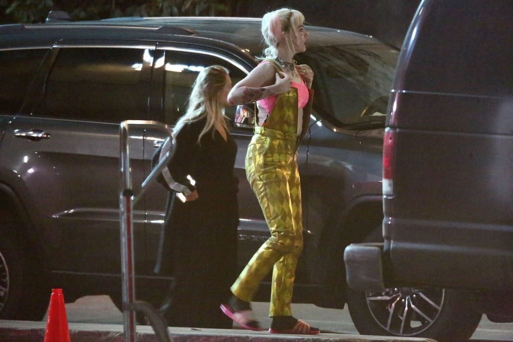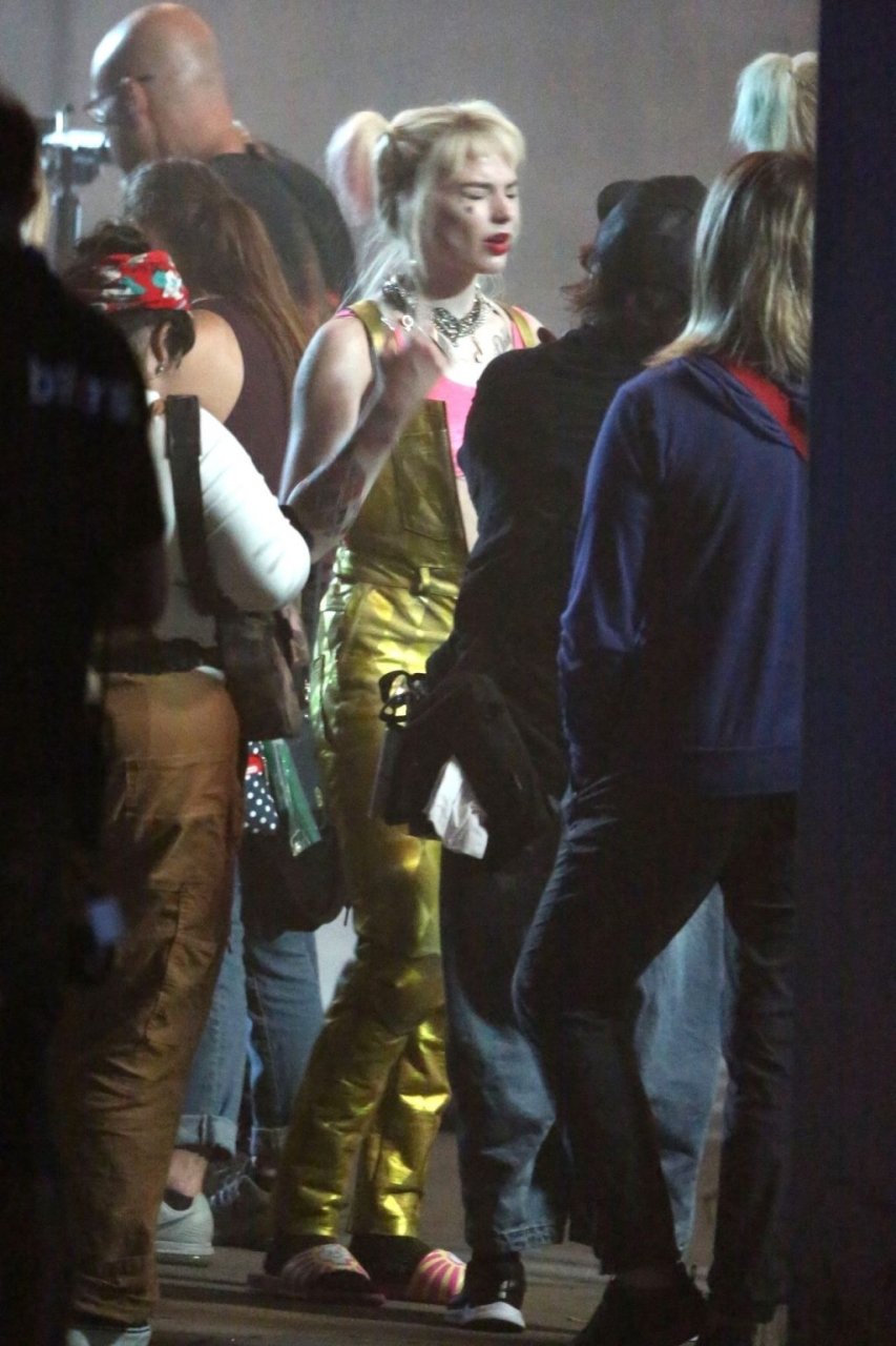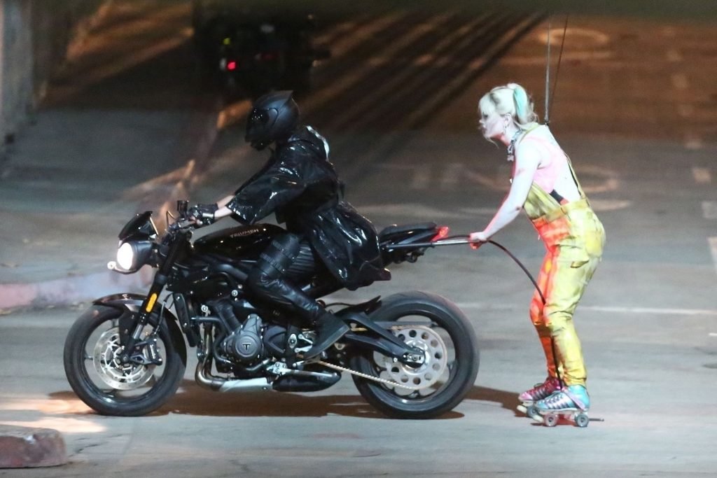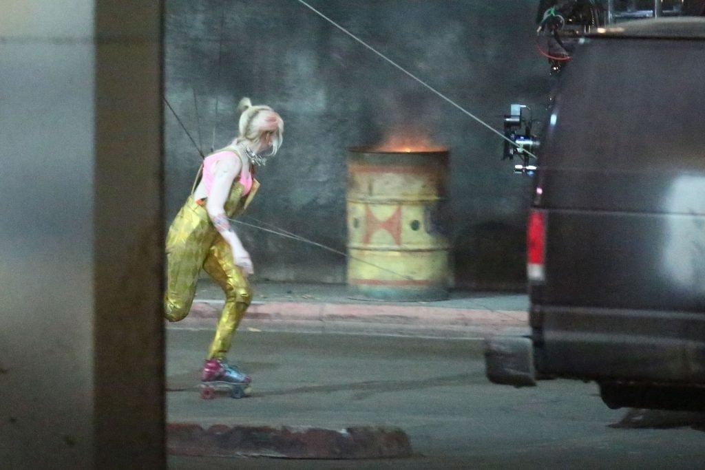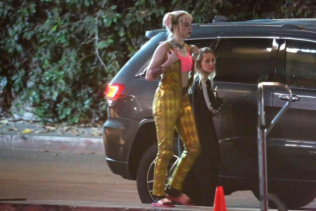 Margot Robbie filma uma cena de ação perigosa com a ajuda de um dublê durante uma refilmagem de “Aves de Rapina” em Los Angeles, 05/09/2019.