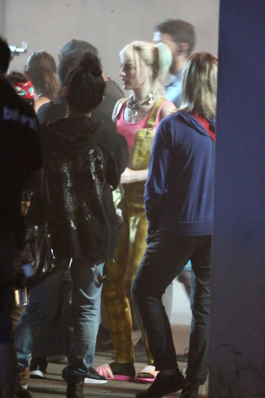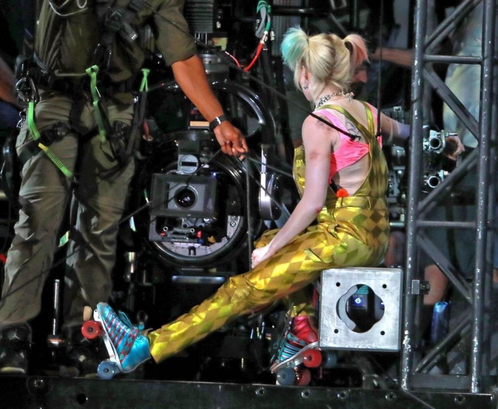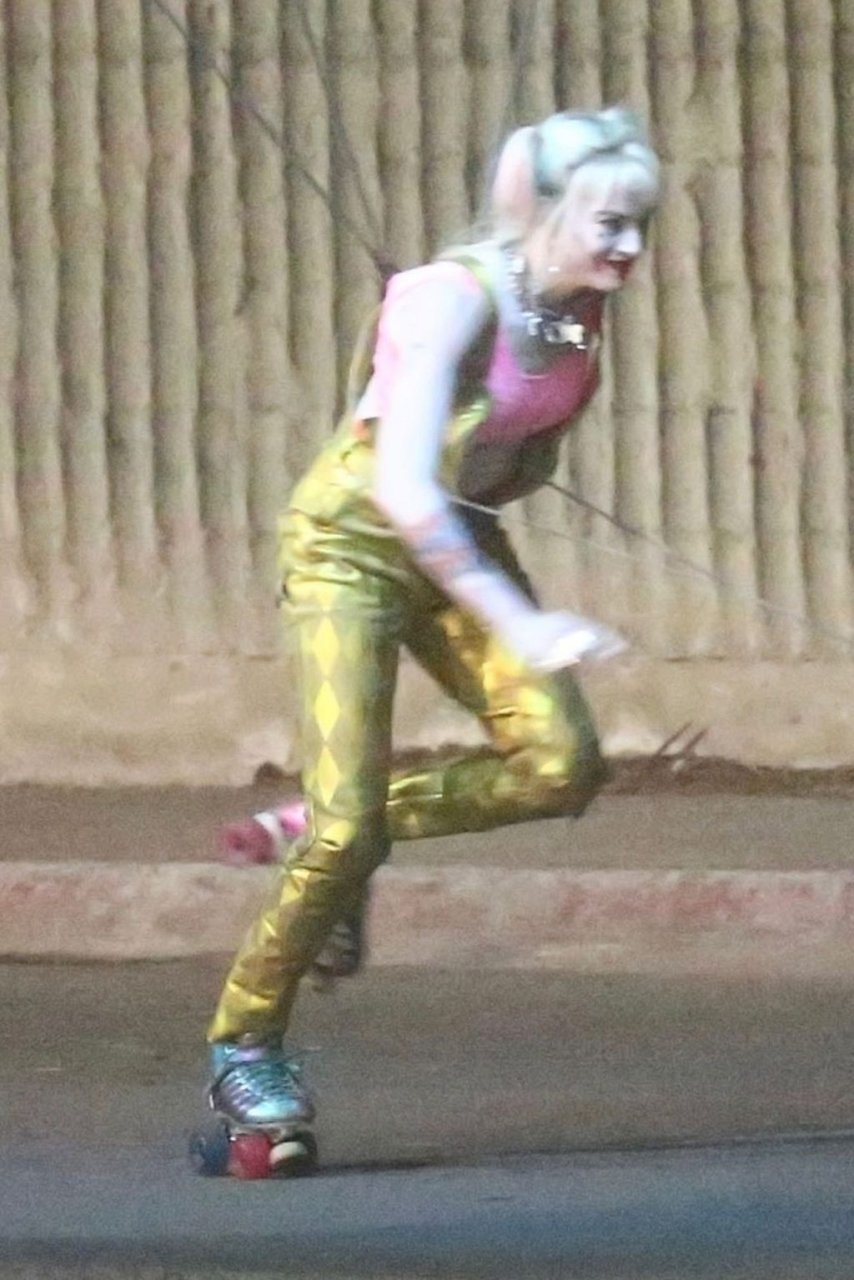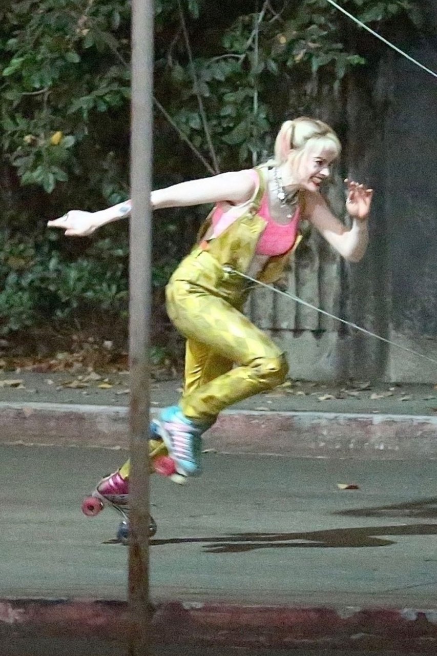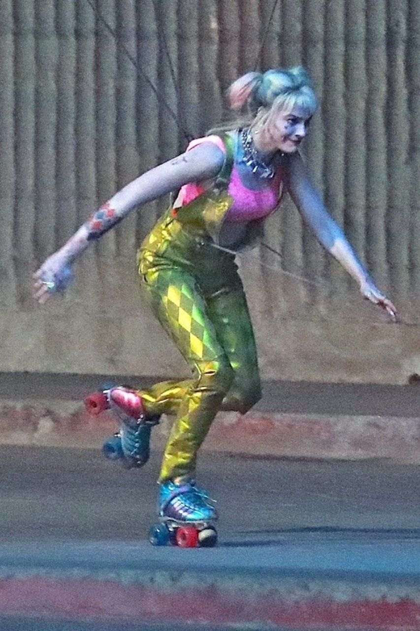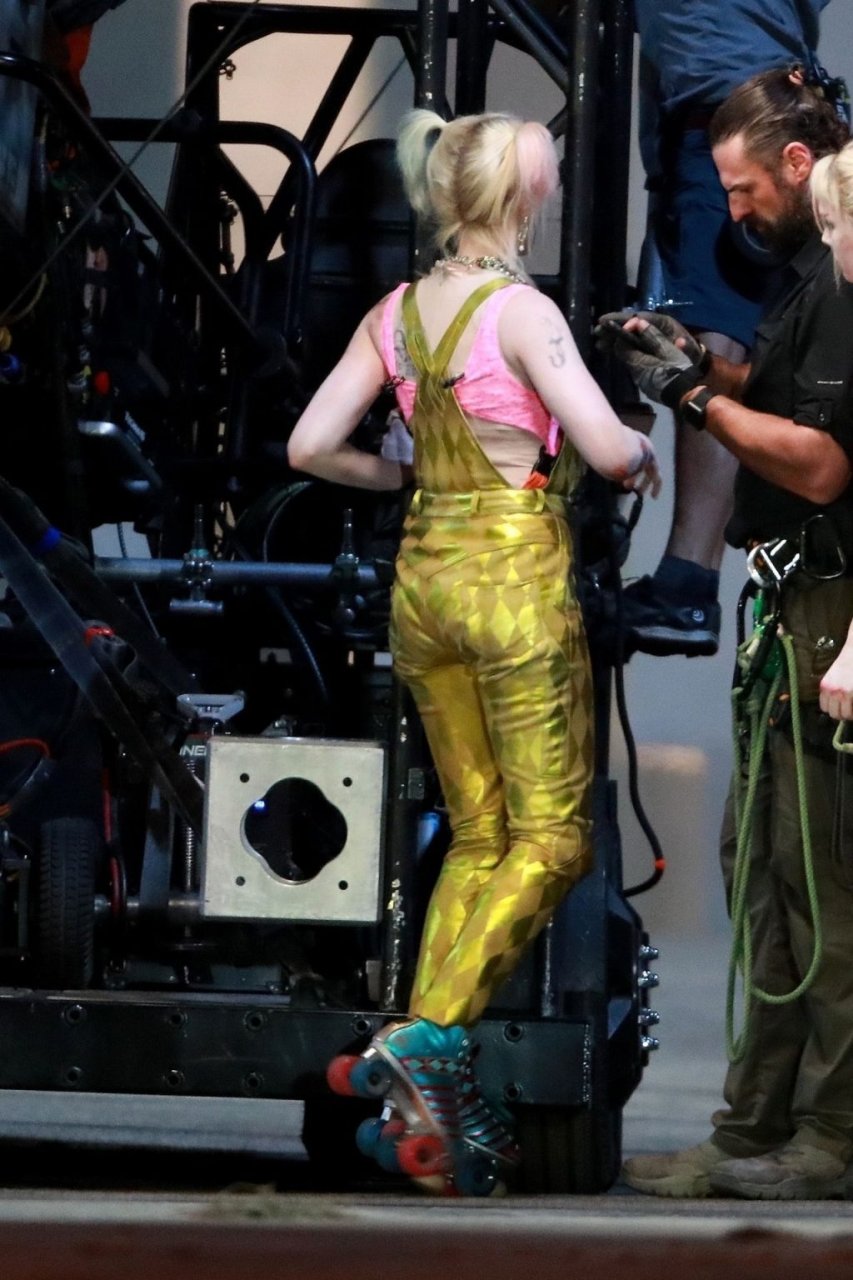 Margot Robbie filma uma cena de ação perigosa com a ajuda de um dublê durante uma refilmagem de “Aves de Rapina” em Los Angeles, 05/09/2019.