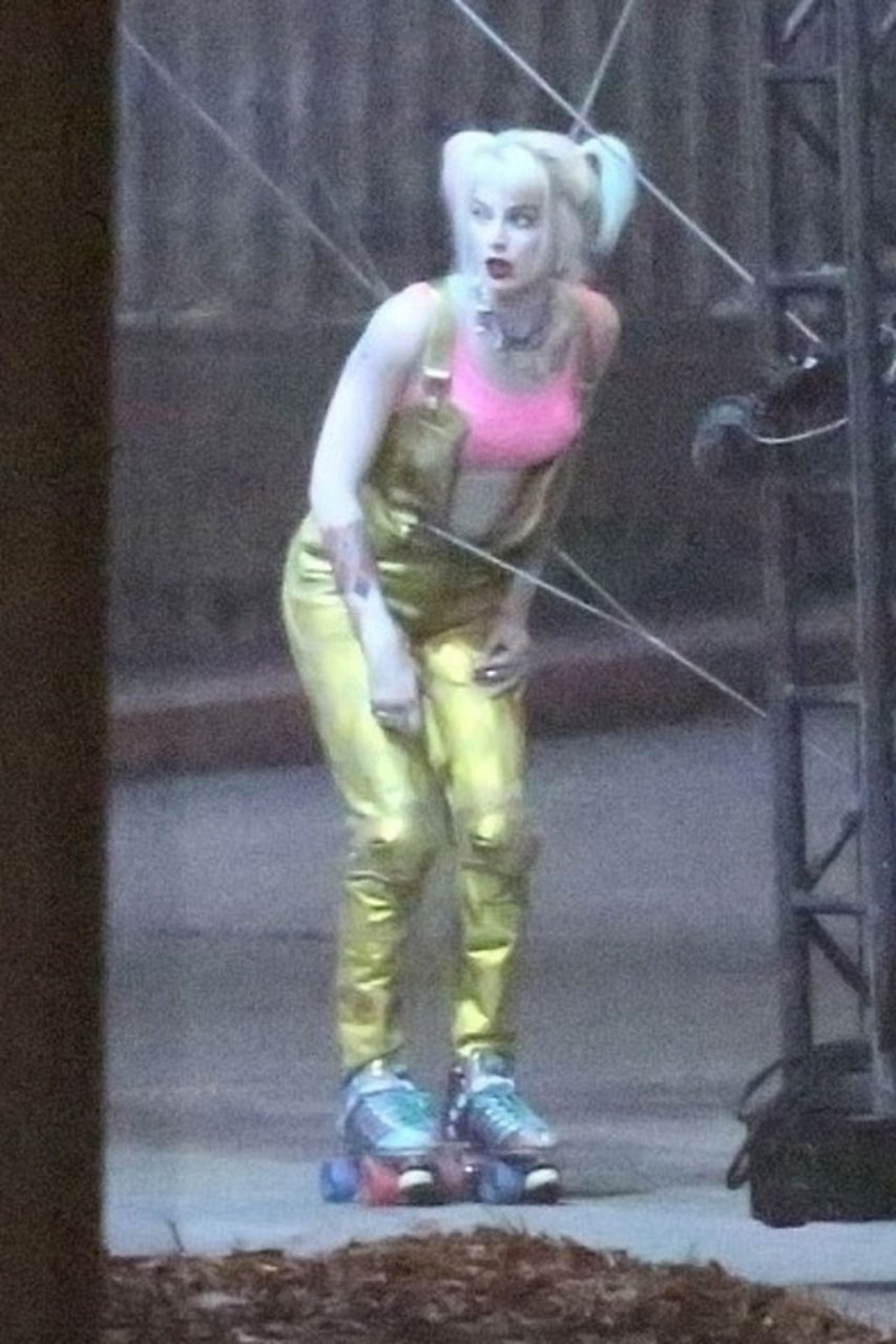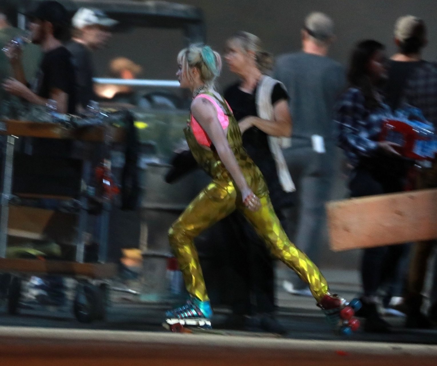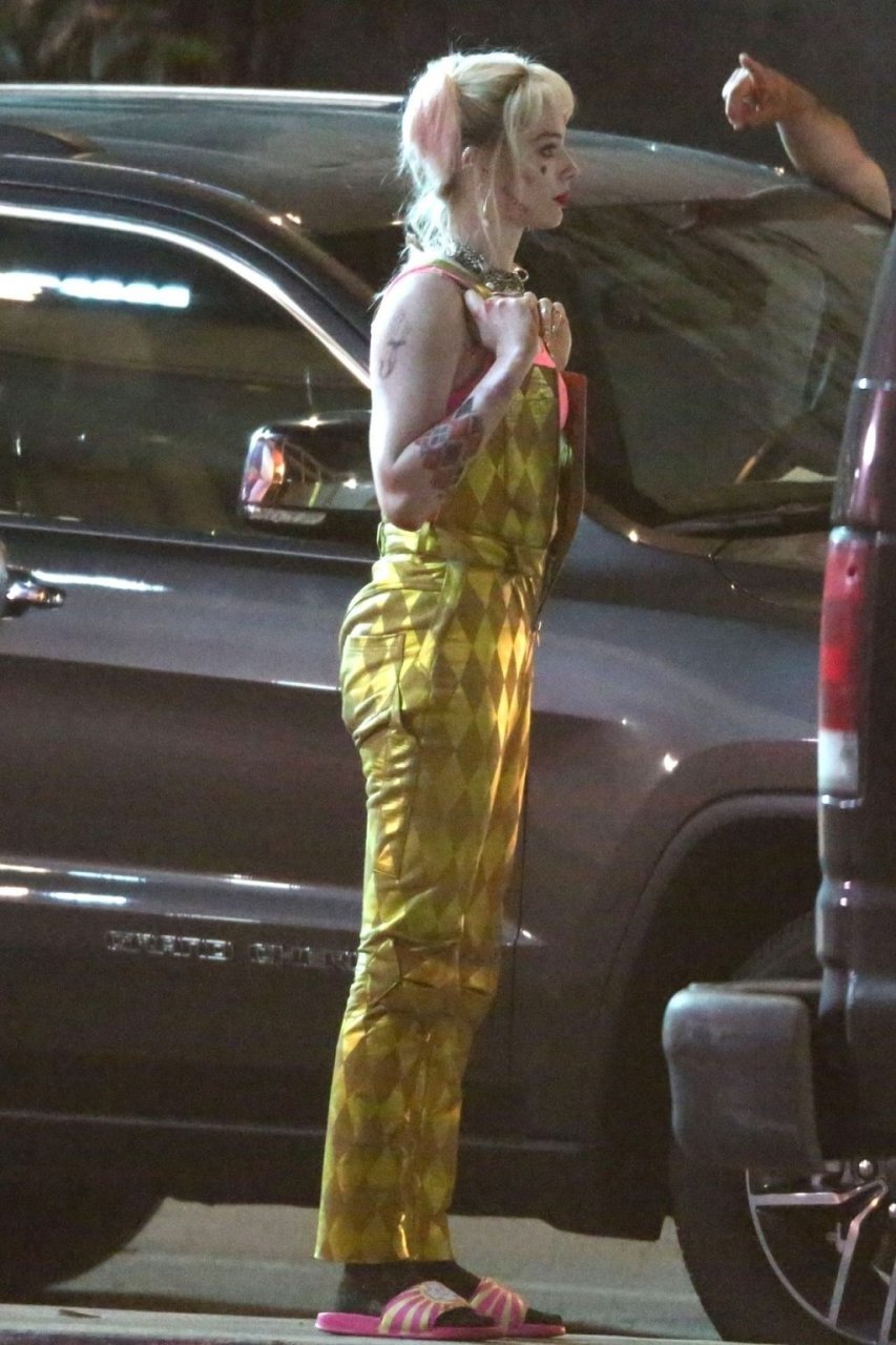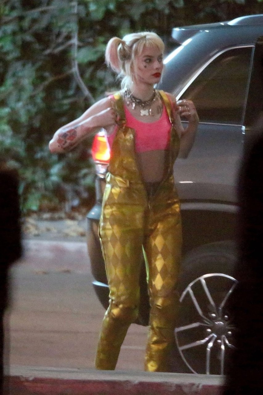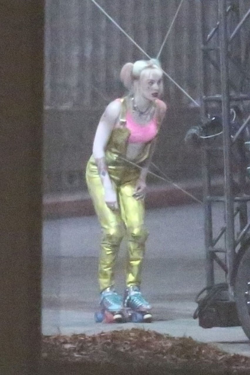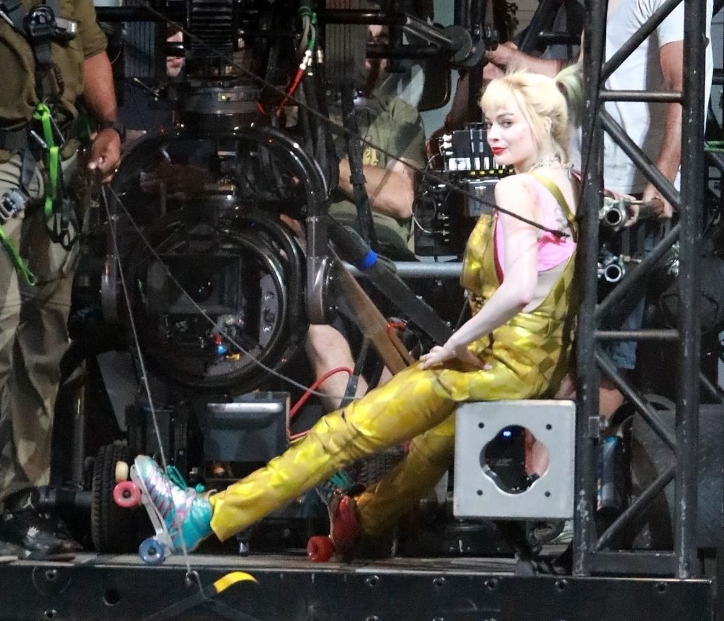 Margot Robbie filma uma cena de ação perigosa com a ajuda de um dublê durante uma refilmagem de “Aves de Rapina” em Los Angeles, 05/09/2019.