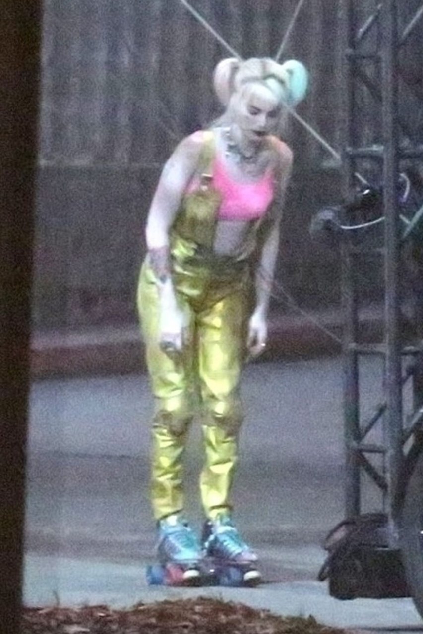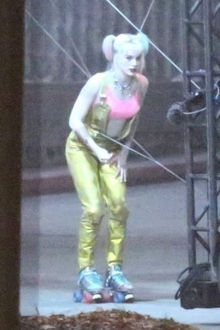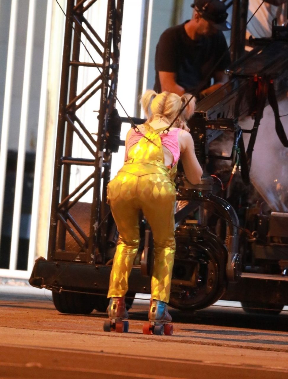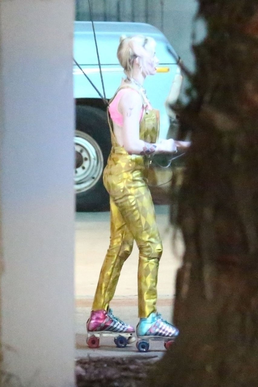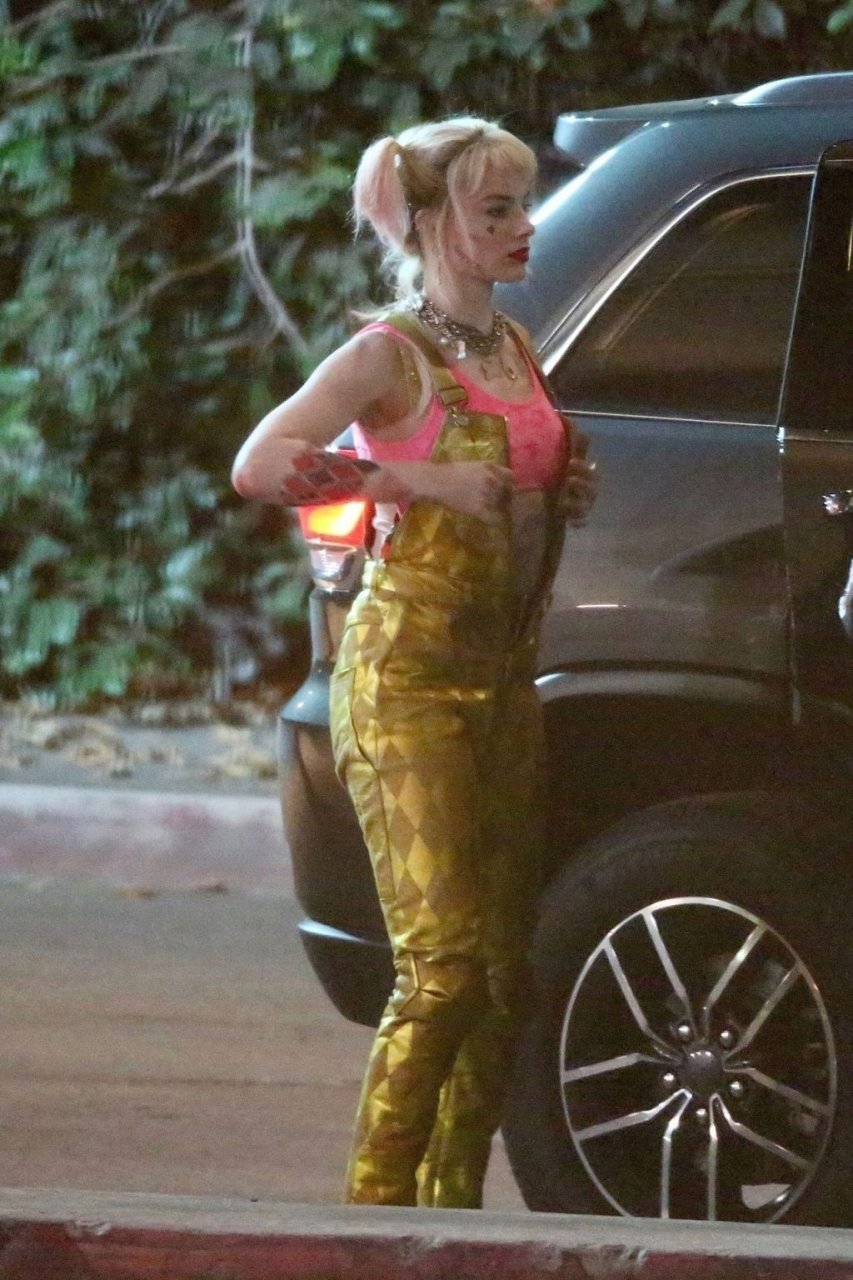 Margot Robbie filma uma cena de ação perigosa com a ajuda de um dublê durante uma refilmagem de “Aves de Rapina” em Los Angeles, 05/09/2019.