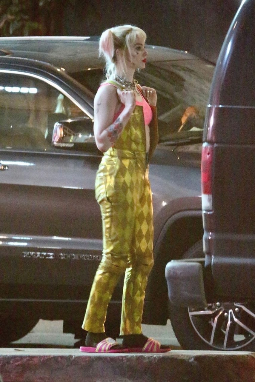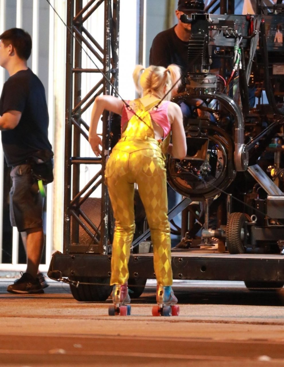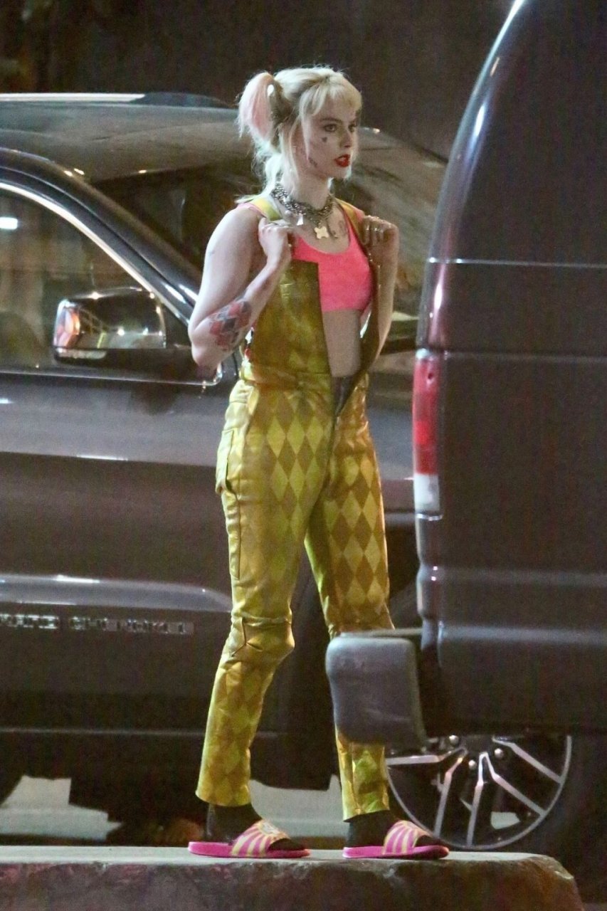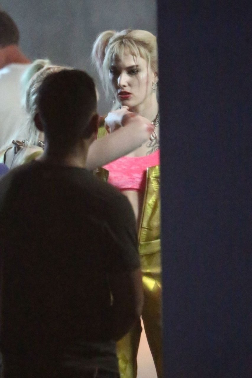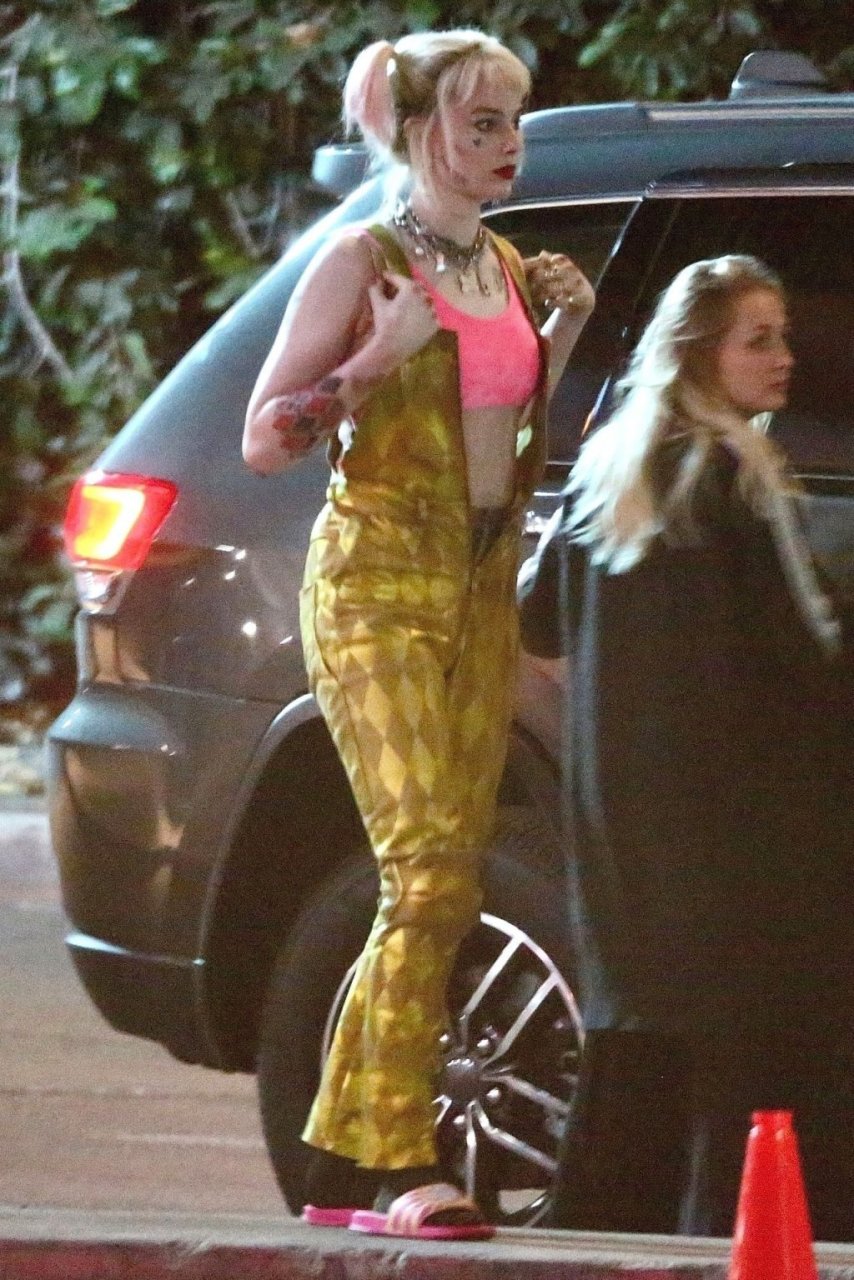 Margot Robbie filma uma cena de ação perigosa com a ajuda de um dublê durante uma refilmagem de “Aves de Rapina” em Los Angeles, 05/09/2019.