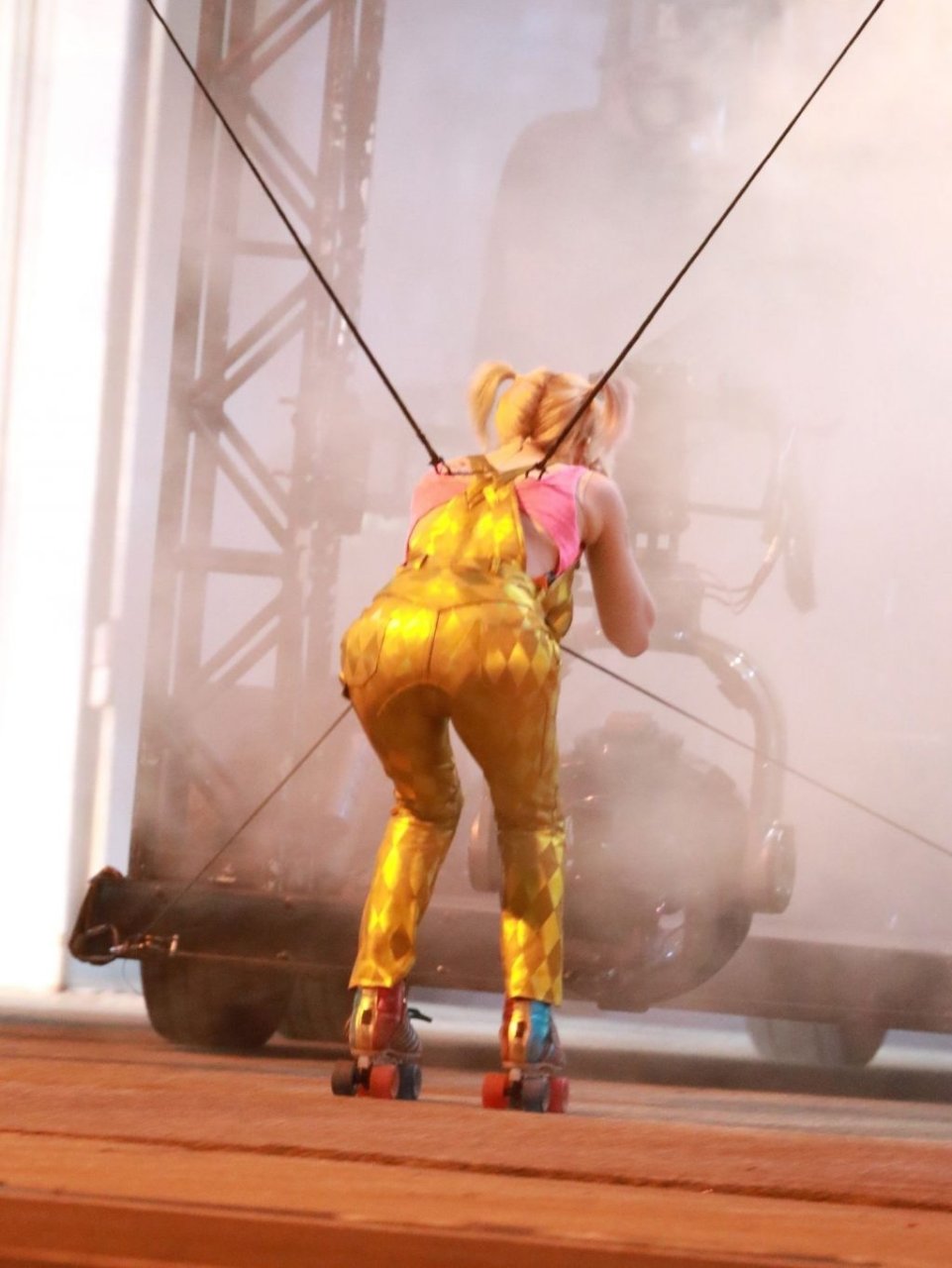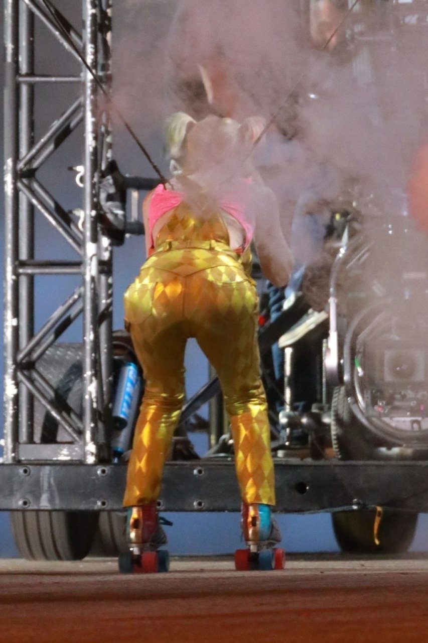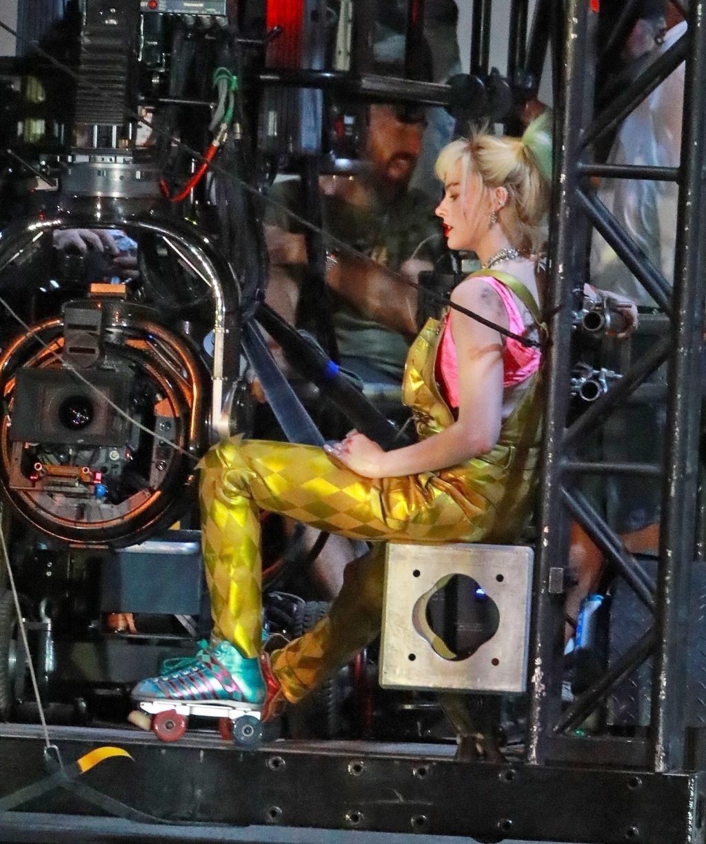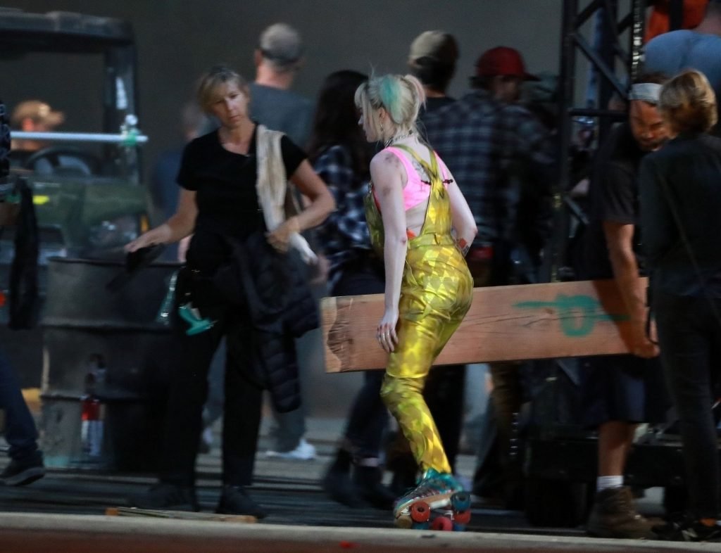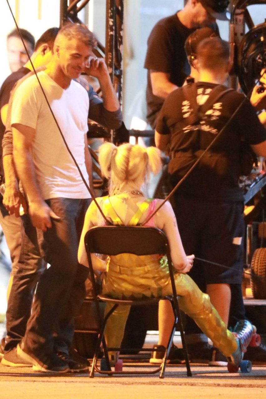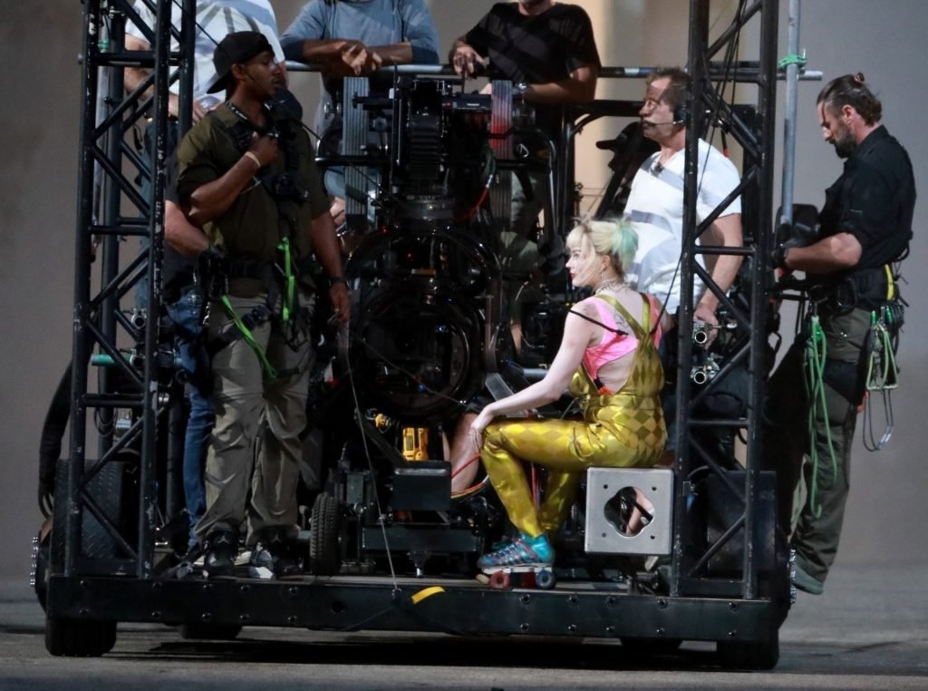 Margot Robbie filma uma cena de ação perigosa com a ajuda de um dublê durante uma refilmagem de “Aves de Rapina” em Los Angeles, 05/09/2019.