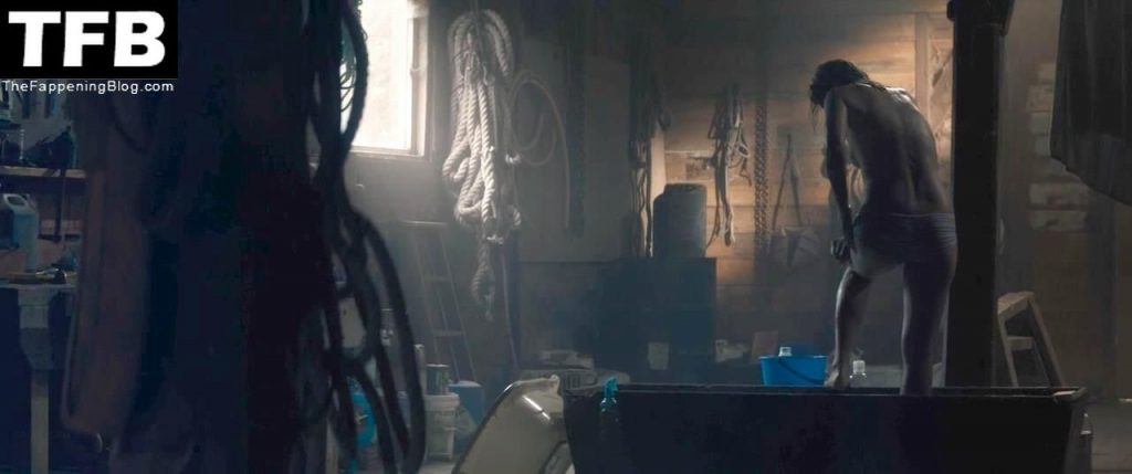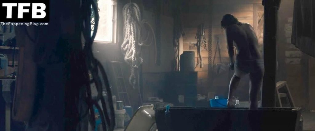 Margot Robbie, famosa por “O Lobo de Wall Street“, está em pé em uma banheira e se esfregando com uma escova enquanto usa apenas uma calcinha. Vemos ela por trás com um pouco do seu seio esquerdo à mostra enquanto ela se inclina.