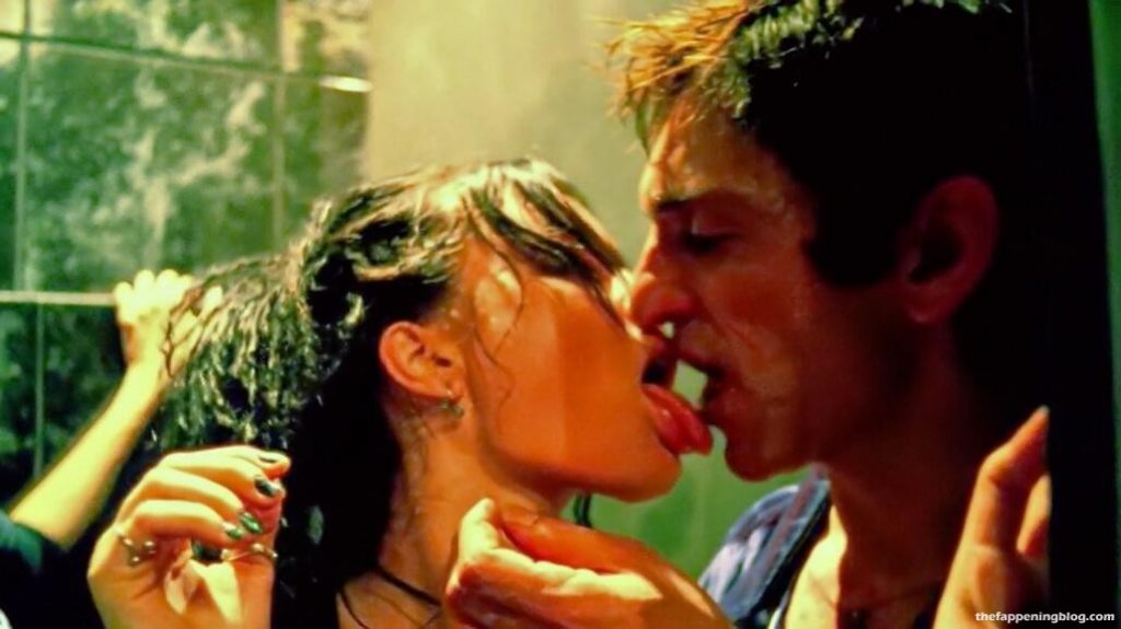 Mariana Ximenes (right) and Marina Franco (left) are dancing together and repeatedly lesbian kissing in night club restroom before they go into one of the bathroom stalls where a guy places some drugs on Mariana’s tongue and then Mariana slowly licks up his mouth.