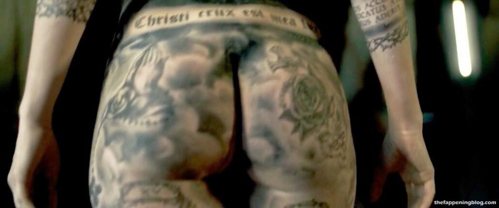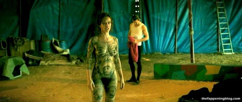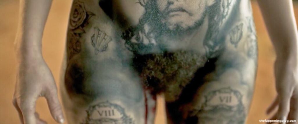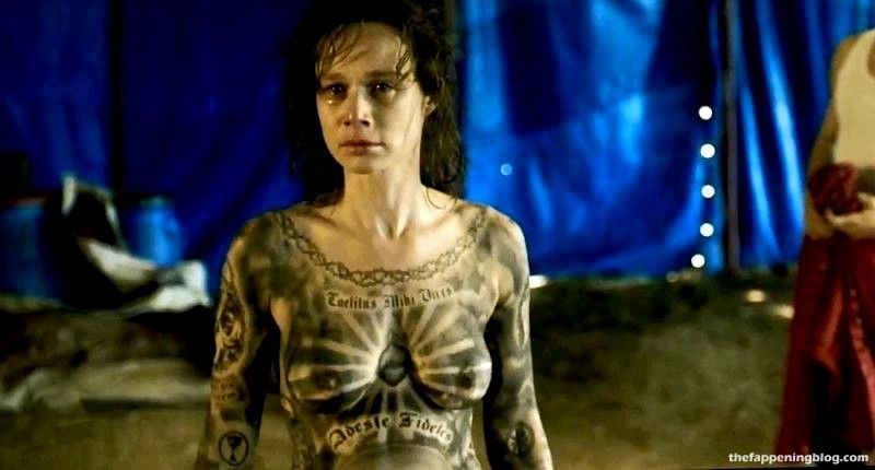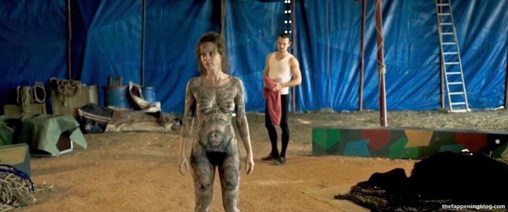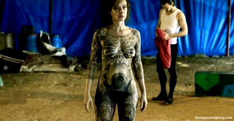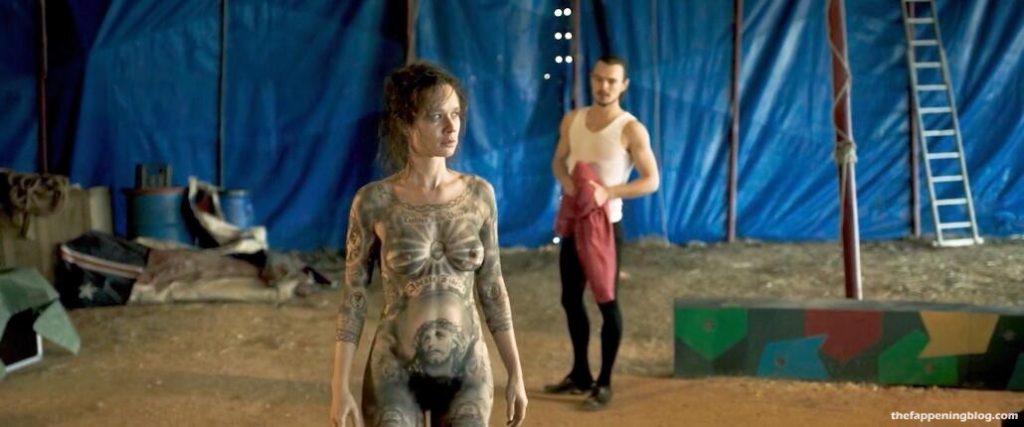 Mariana Ximenes is fully nude with her body covered in tattoos as she walks through a circus tent all while people stand around watching giving us close up looks at her breasts, ass, and at the merkin used for her bush.