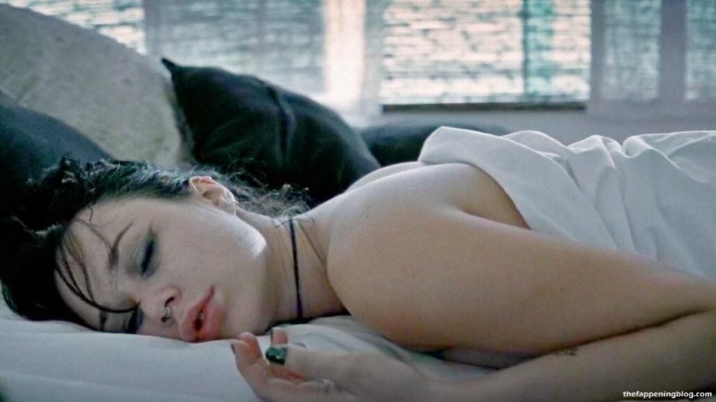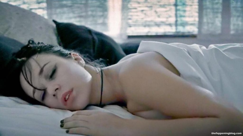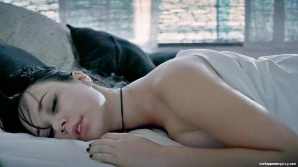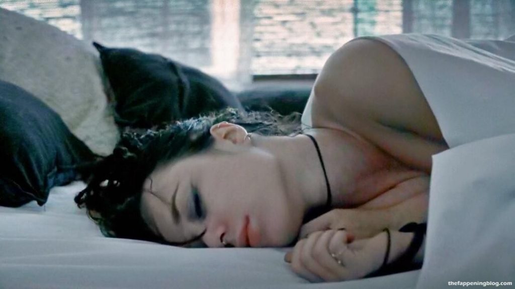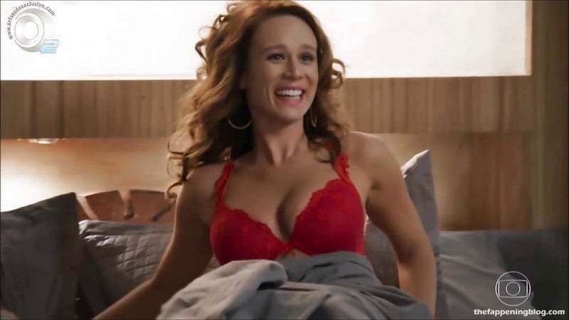Mariana Ximenes is adjusting herself on a bed as she rolls over onto her stomach showing her cleavage and then lies sleeping with her left breast pressed against the bed.